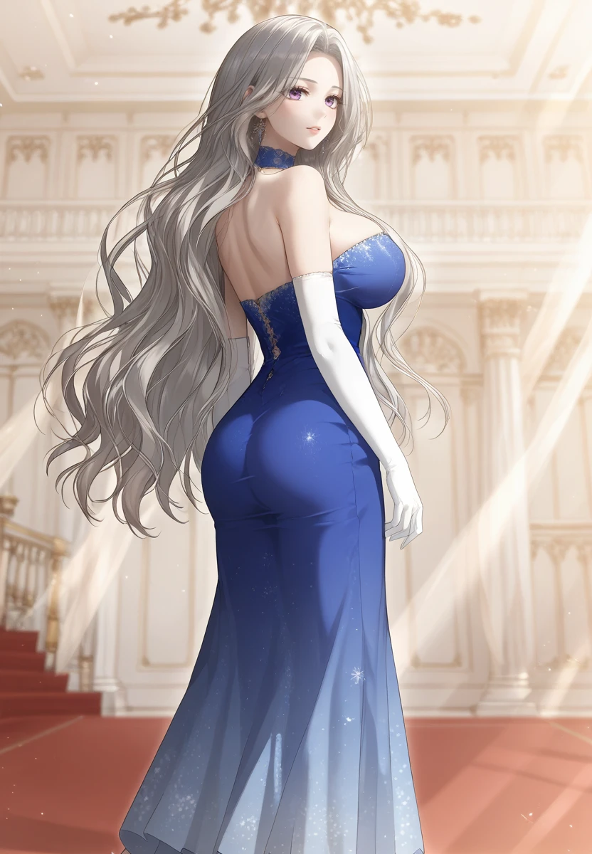 bare shoulders, long dress, blue dress
