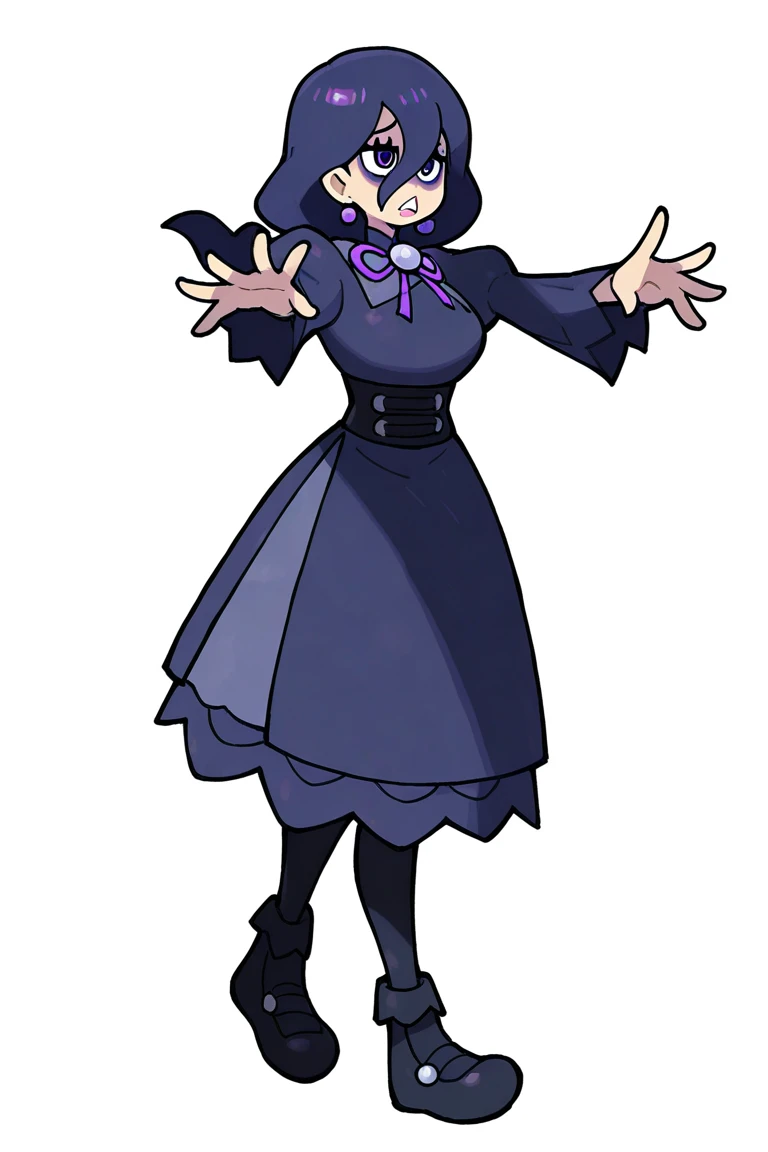 purple dress, long sleeves, black corset, brooch, neck ribbon, purple ribbon, black pantyhose, black footwear