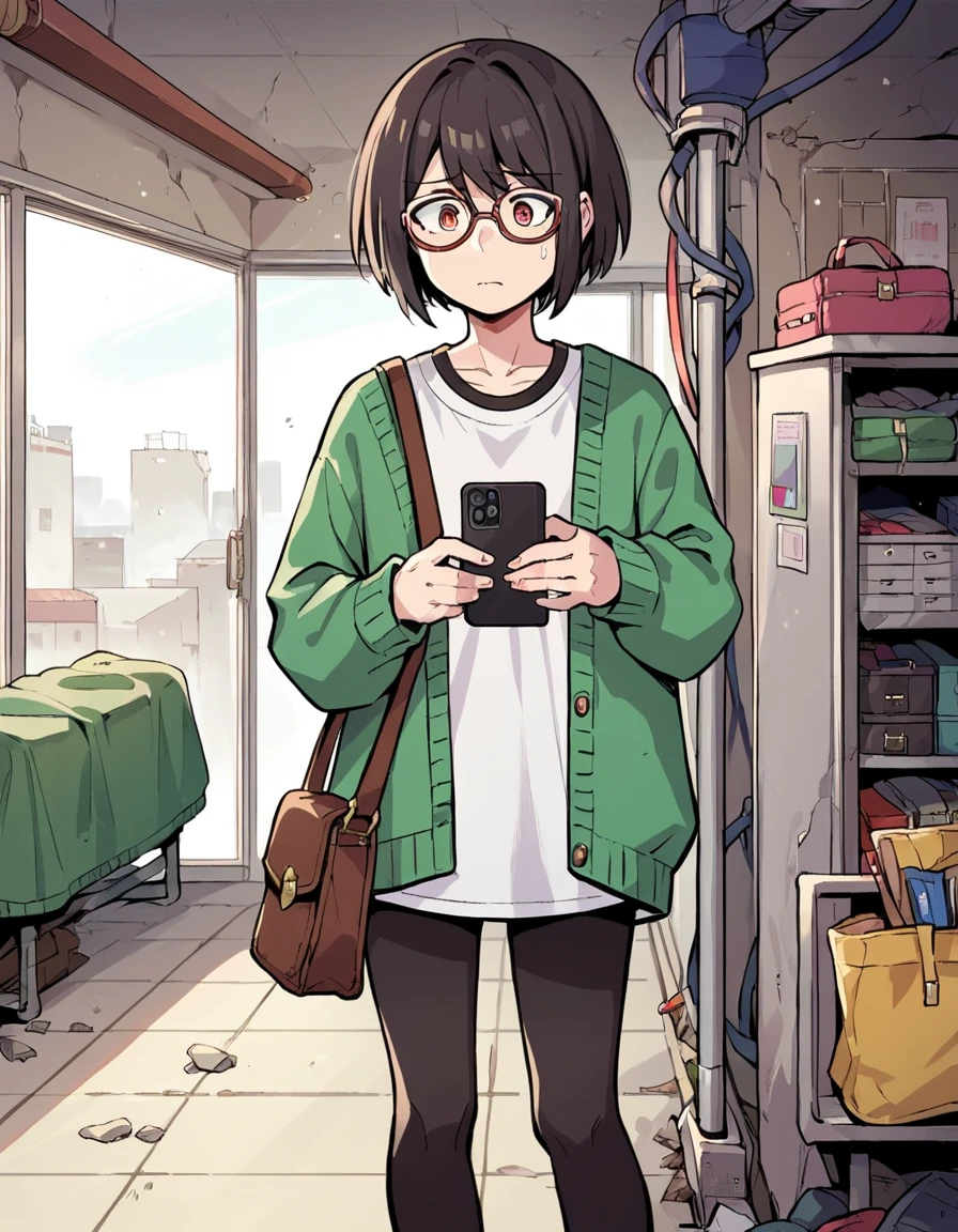 RGShiki,short hair,green cardigan,white shirt,black leggings