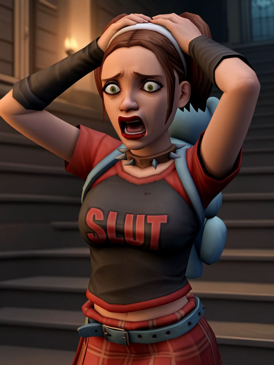 per usual with pre-flux image generation, the "SLUT" text on her shirt will probably turn out garbled, though i've had a pretty surprising hit rate