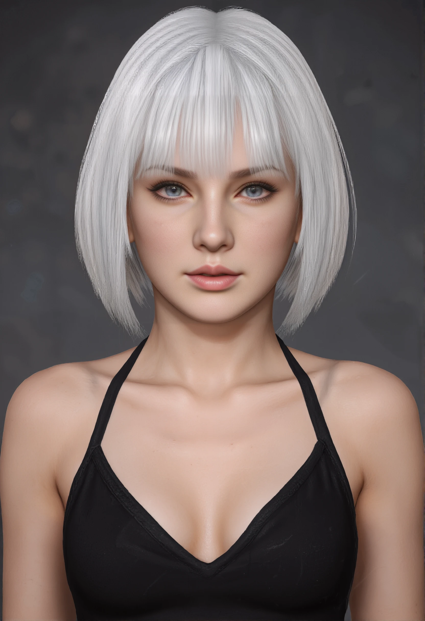 Christie from Dead or alive,christie_\(doa\), steely-gray eyes,white hair,short hair,bob cut,bangs,her hair is styled in a bob with bangs framing her face