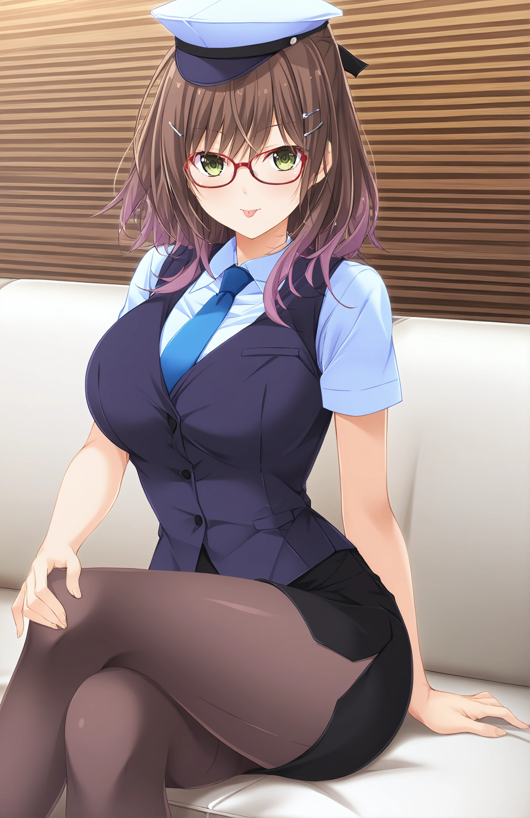 HatsuseMiki, breasts, bangs, skirt, brown hair, shirt, hair ornament, hat, green eyes, short sleeves, necktie, glasses, hairclip, miniskirt, black skirt, uniform, vest, blue shirt, side slit, pencil skirt, red-framed eyewear, blue necktie, adjusting clothes, dark blue vest