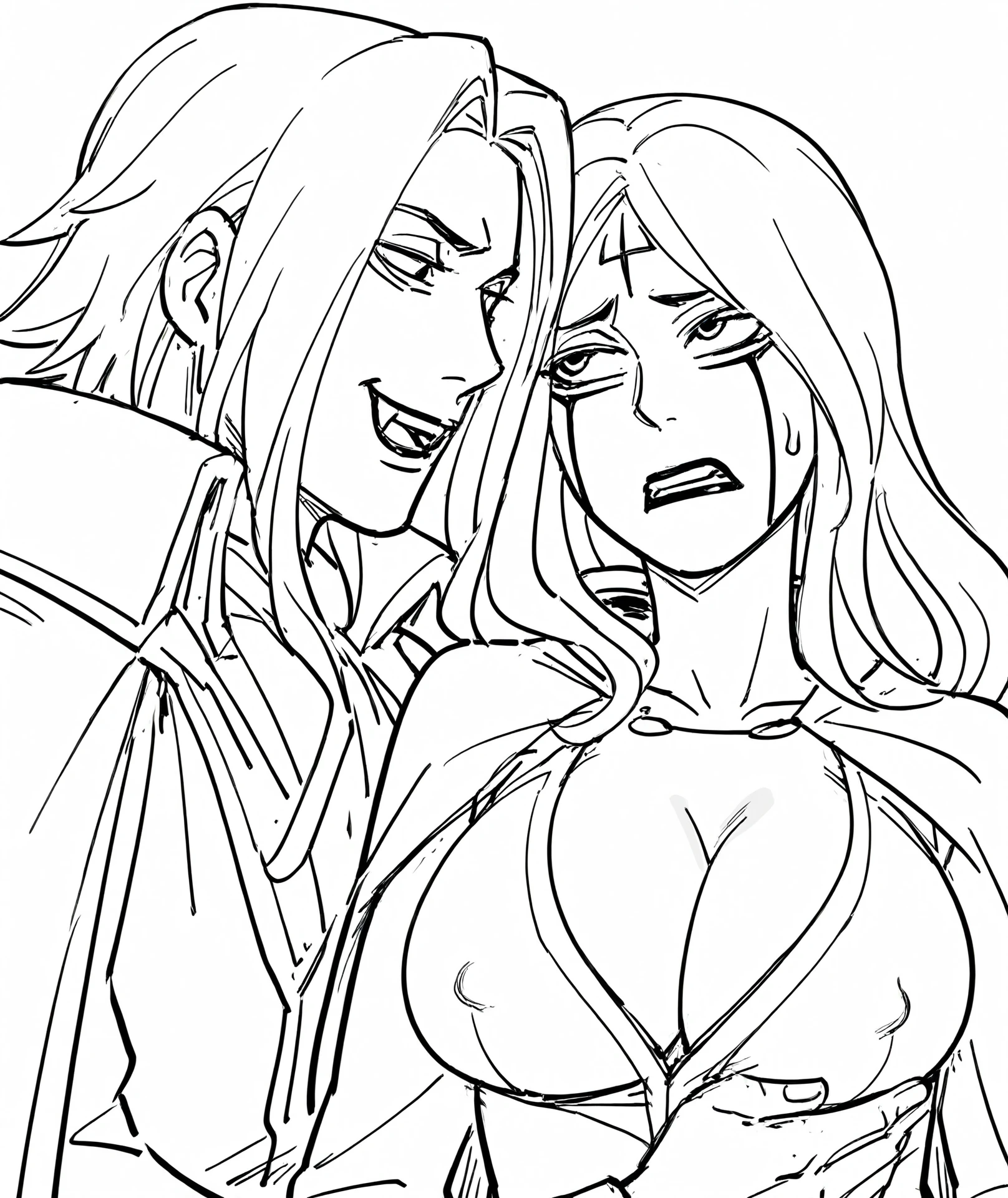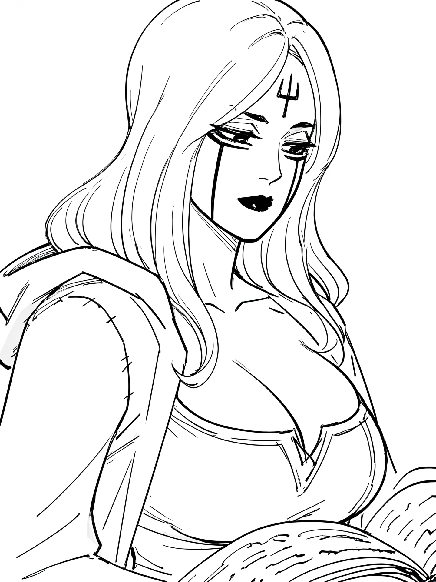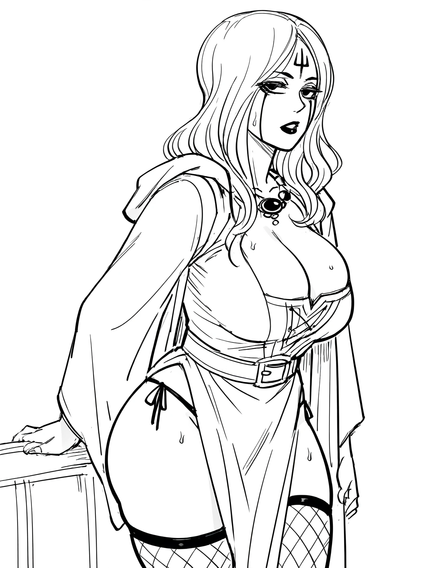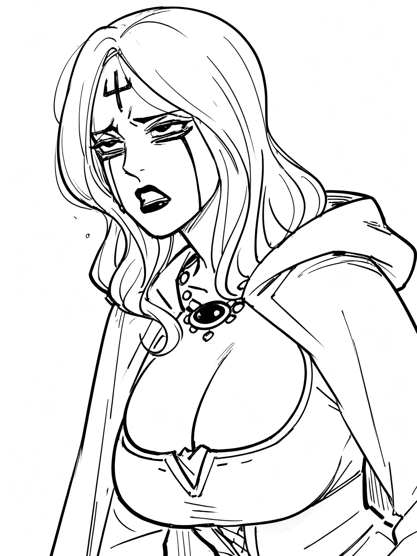 Relevant prompts: long hair, facial mark, forehead mark, makeup, lipstick, parted lips, hood, cloak, long sleeves, hooded cape, hood up, hood down, greyscale, monochrome