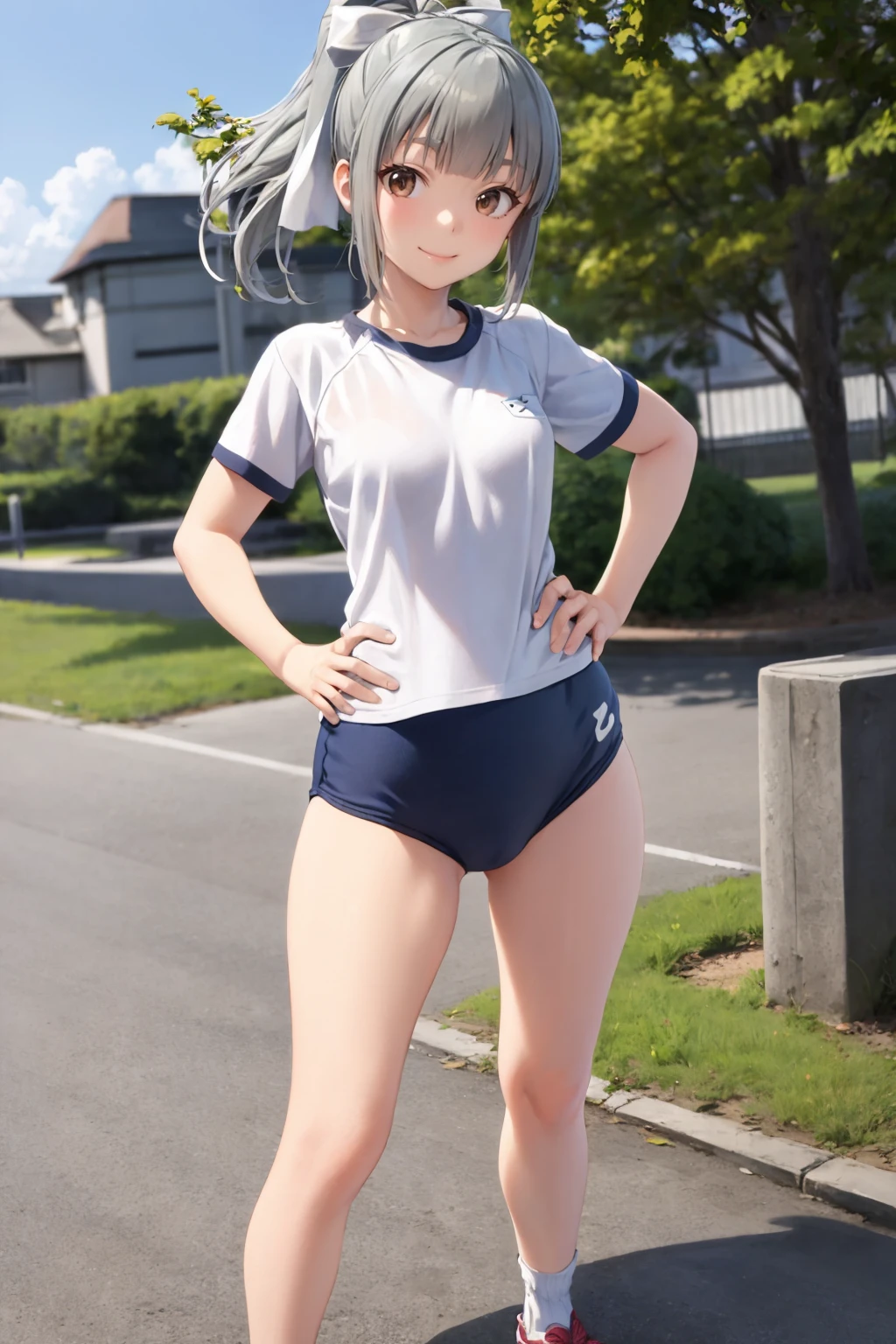 Basic prompts : 1girl, yuubari \(kancolle\), grey hair, ponytail, bangs, brown eyes, hair bow