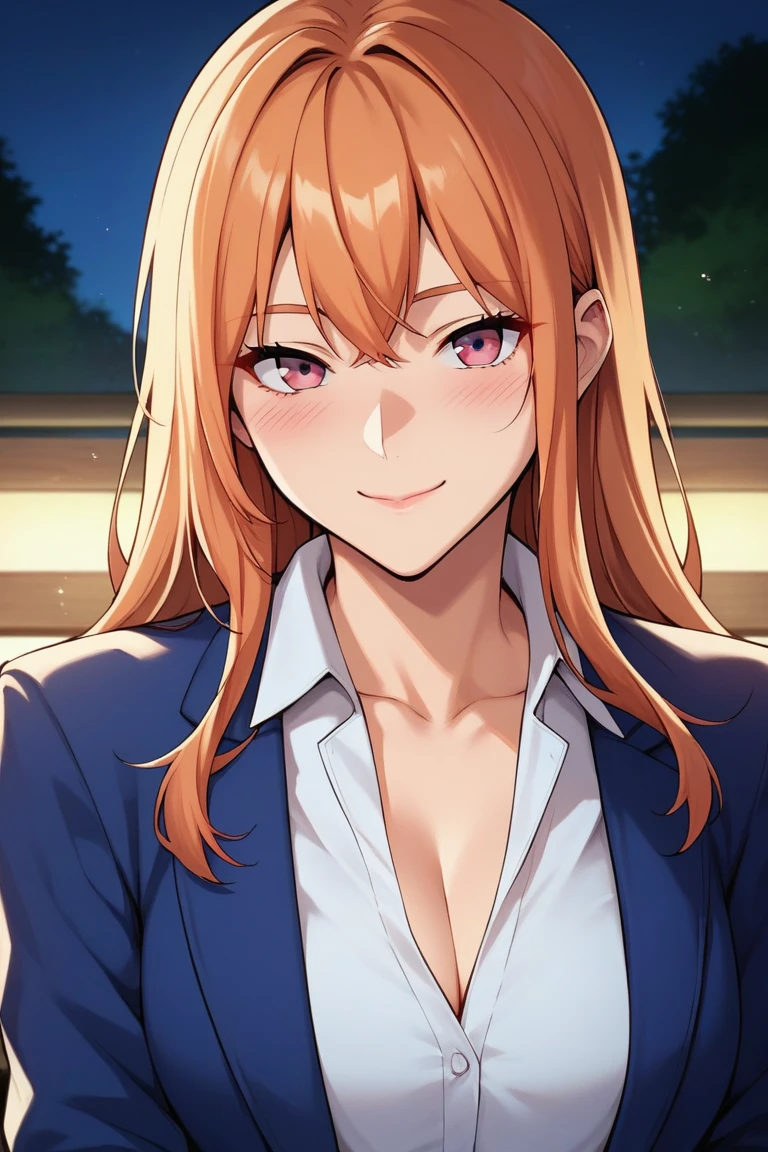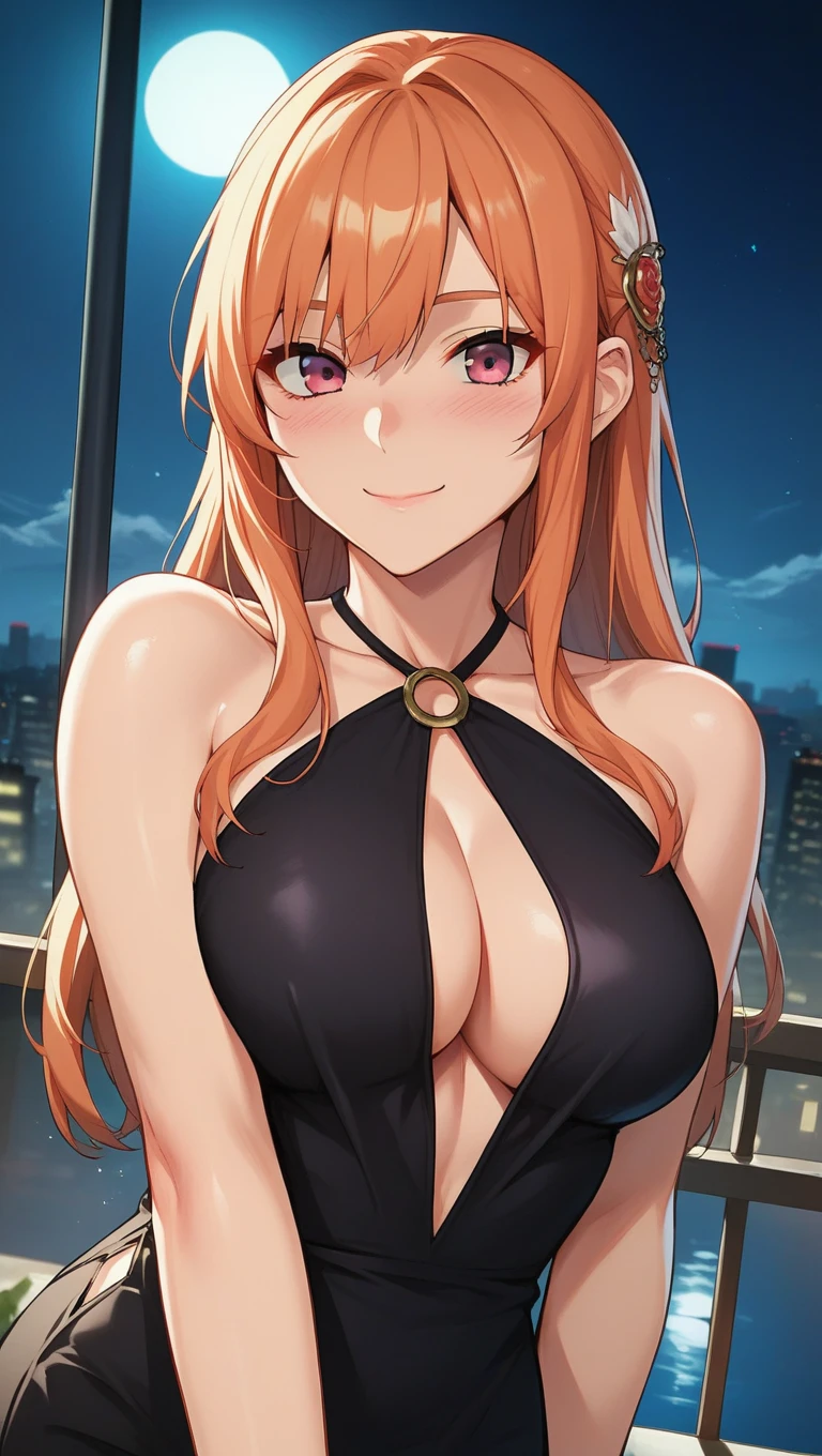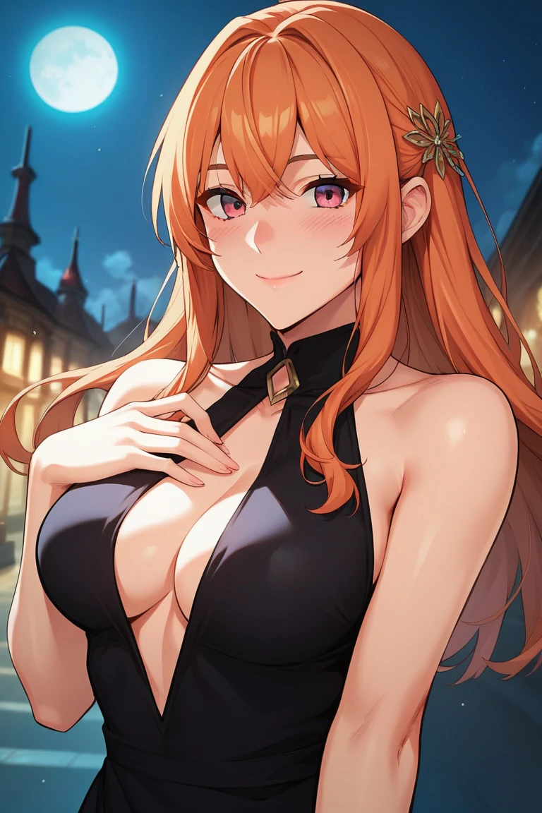 moblee, long hair, bangs, orange hair, pink eyes,