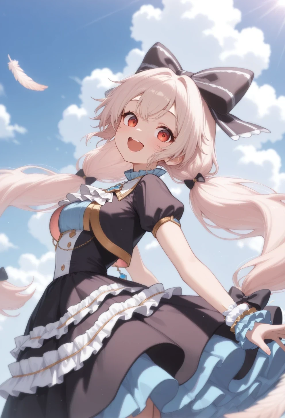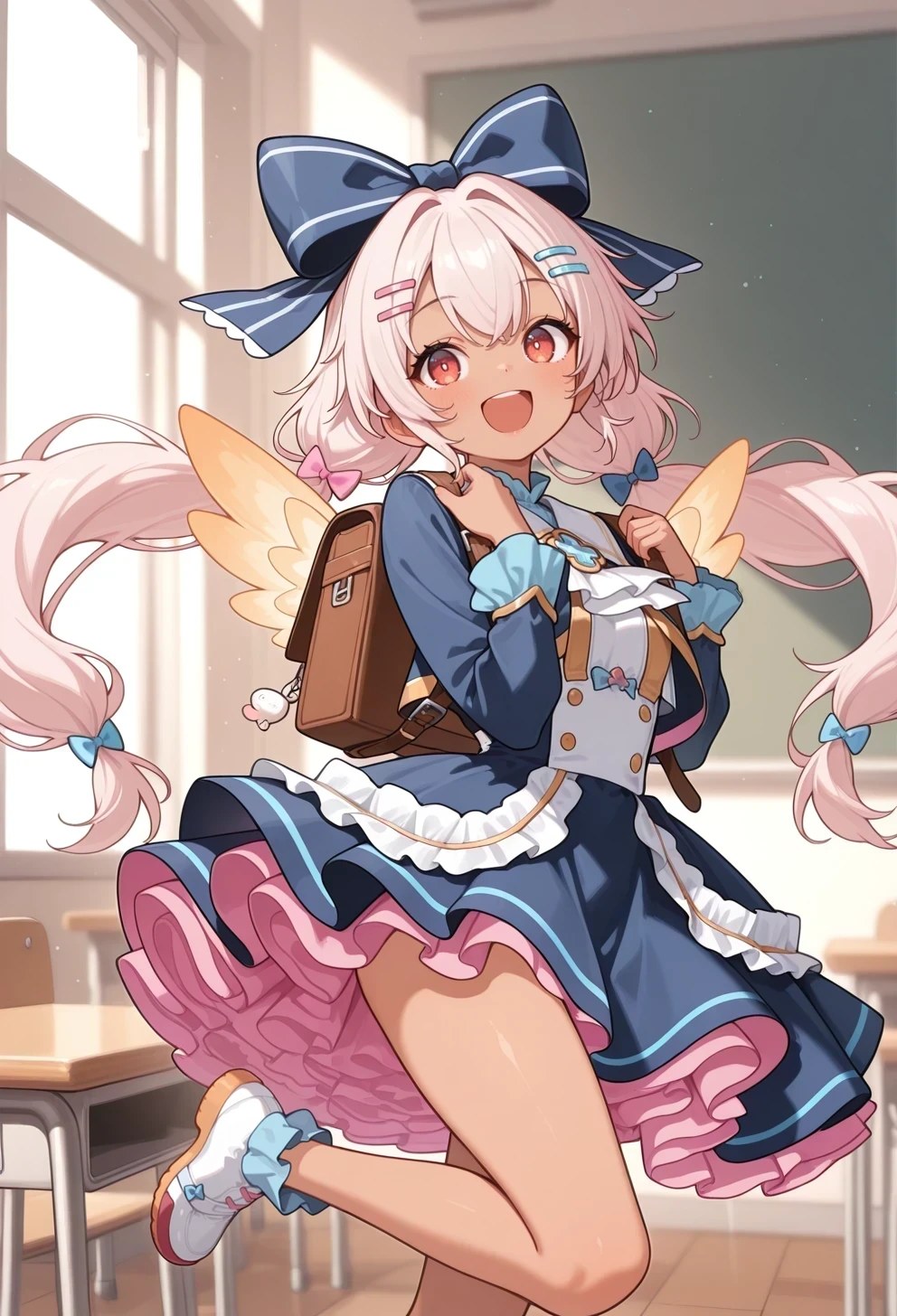 wings,twintails,blue bow,hair bow,hairclip,pink petticoat,overskirt,backpack,blue showgirl skirt,long sleeves,blue sleeves,Wedding: