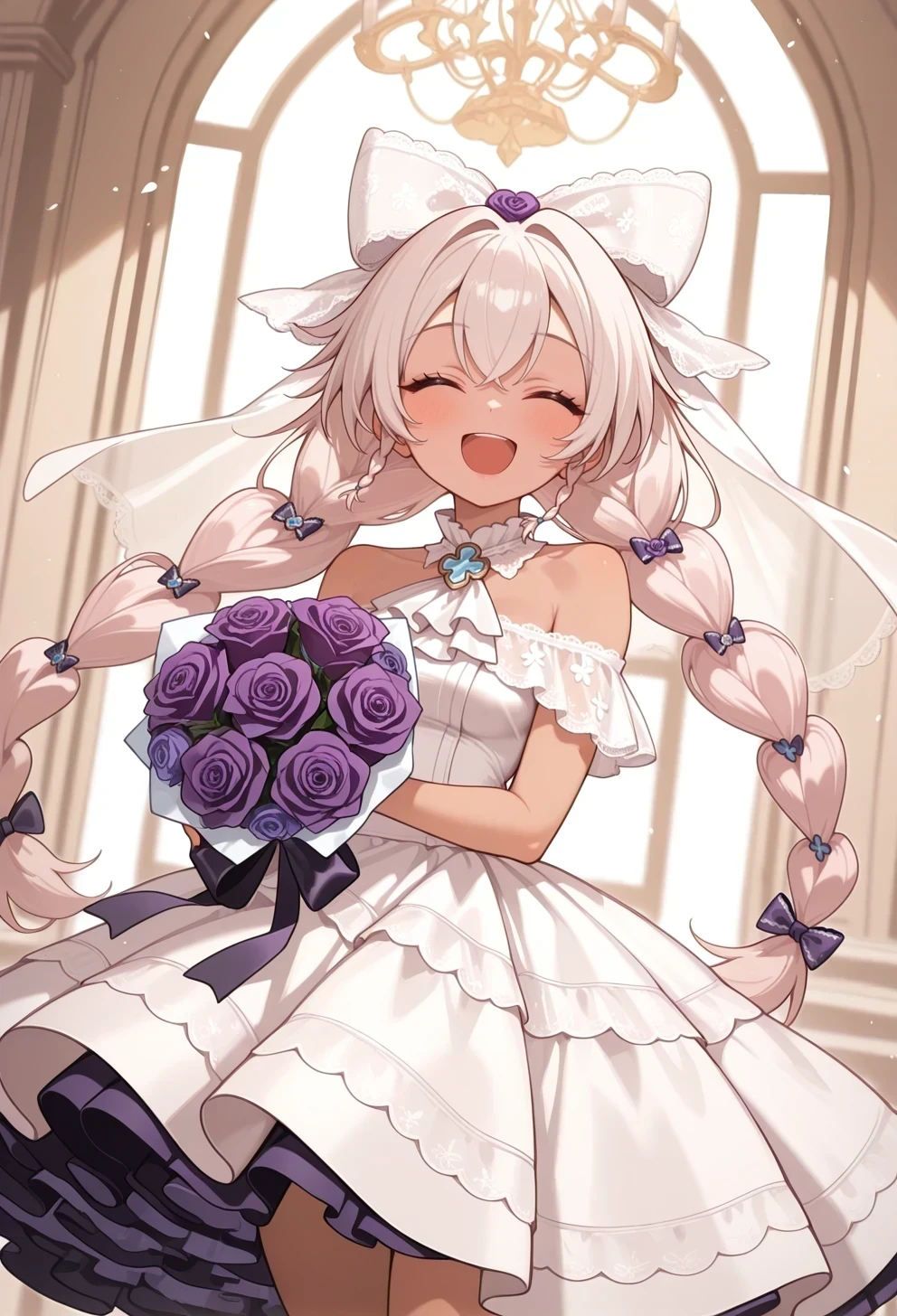 low twin braids,white dress,frills,lace-trimmed dress,bare shoulder,purple petticoat,hair bow,lace bow,purple rose,flower braid,white ascot,データセットが主にデフォルトの衣装に焦点を当てているため、茶熊衣装と花嫁衣装の精度は低めです。しかし、このLoRAは非常に柔軟性が高いので、以下の4つはテスト済みのカスタムコスチュームです。