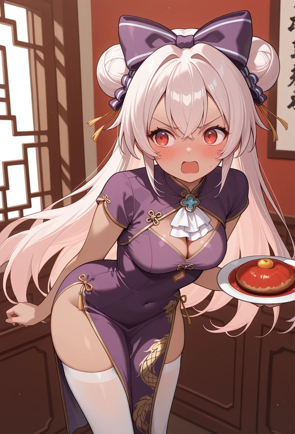 china dress,purple dress,hair bow,double bun,white thighhighs,cleavage cutout,Bikini (change to white bikini for another official costume)