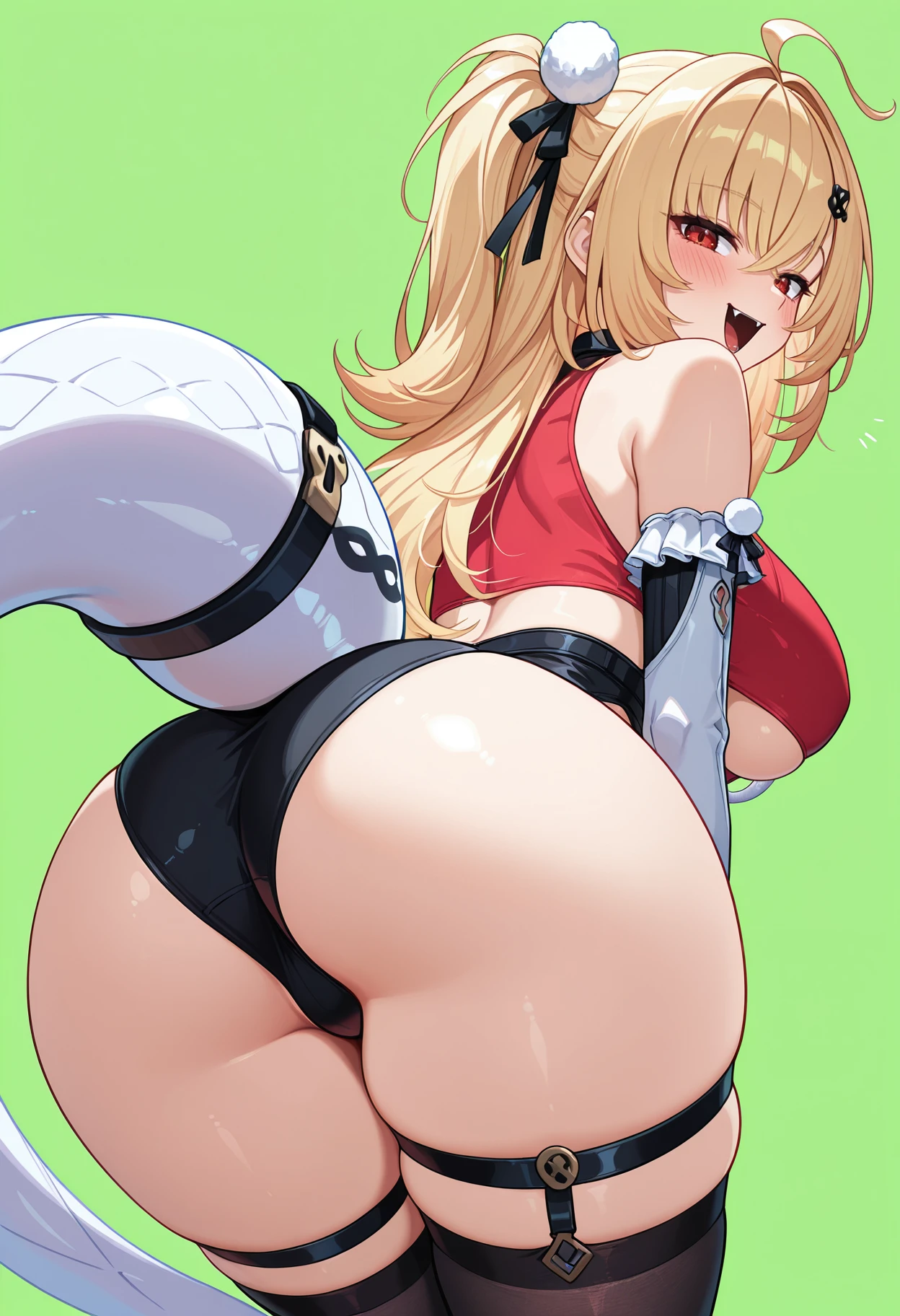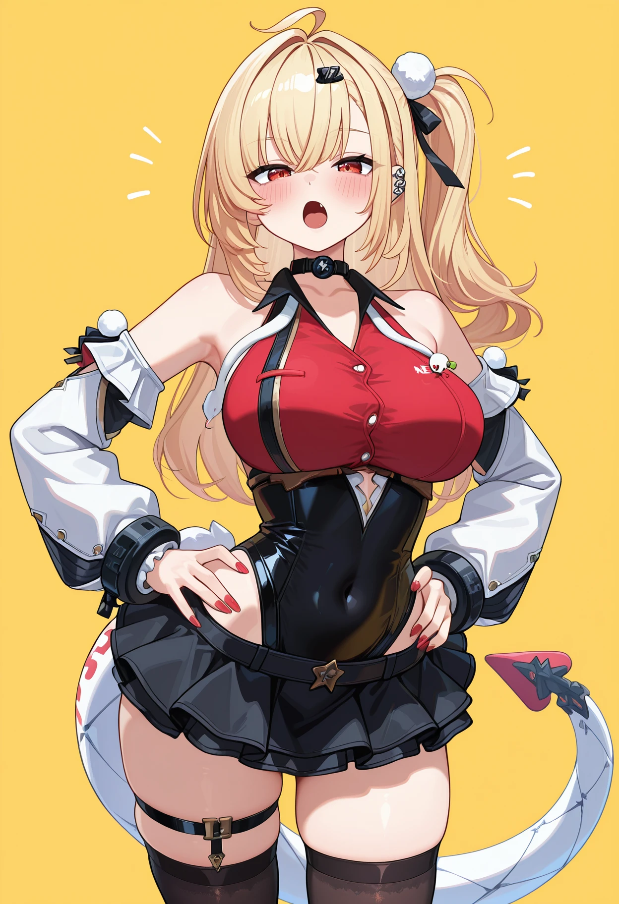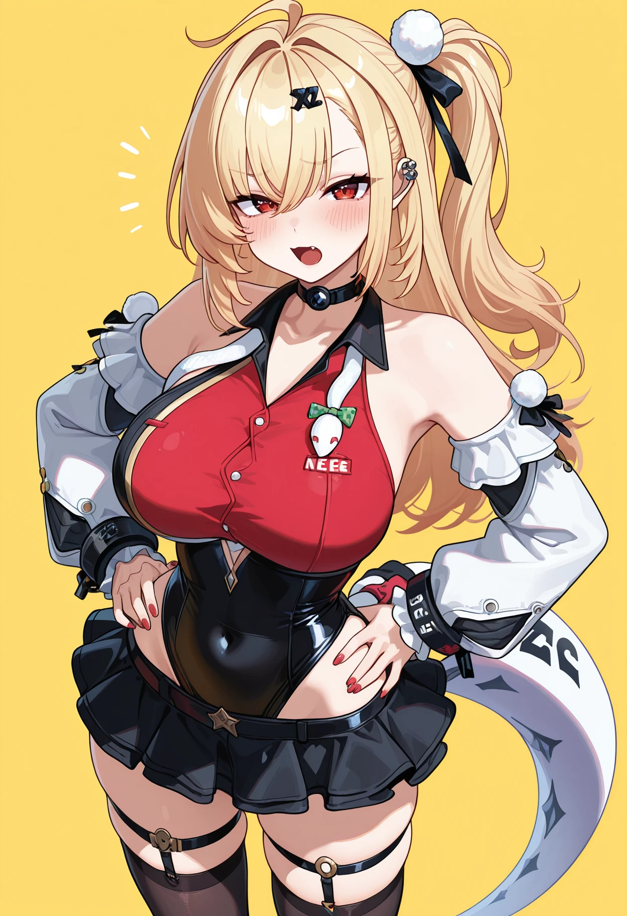 cissia \(zenless zone zero\), hairclip, hair between eyes, one side up, red eyes, blonde hair,tail