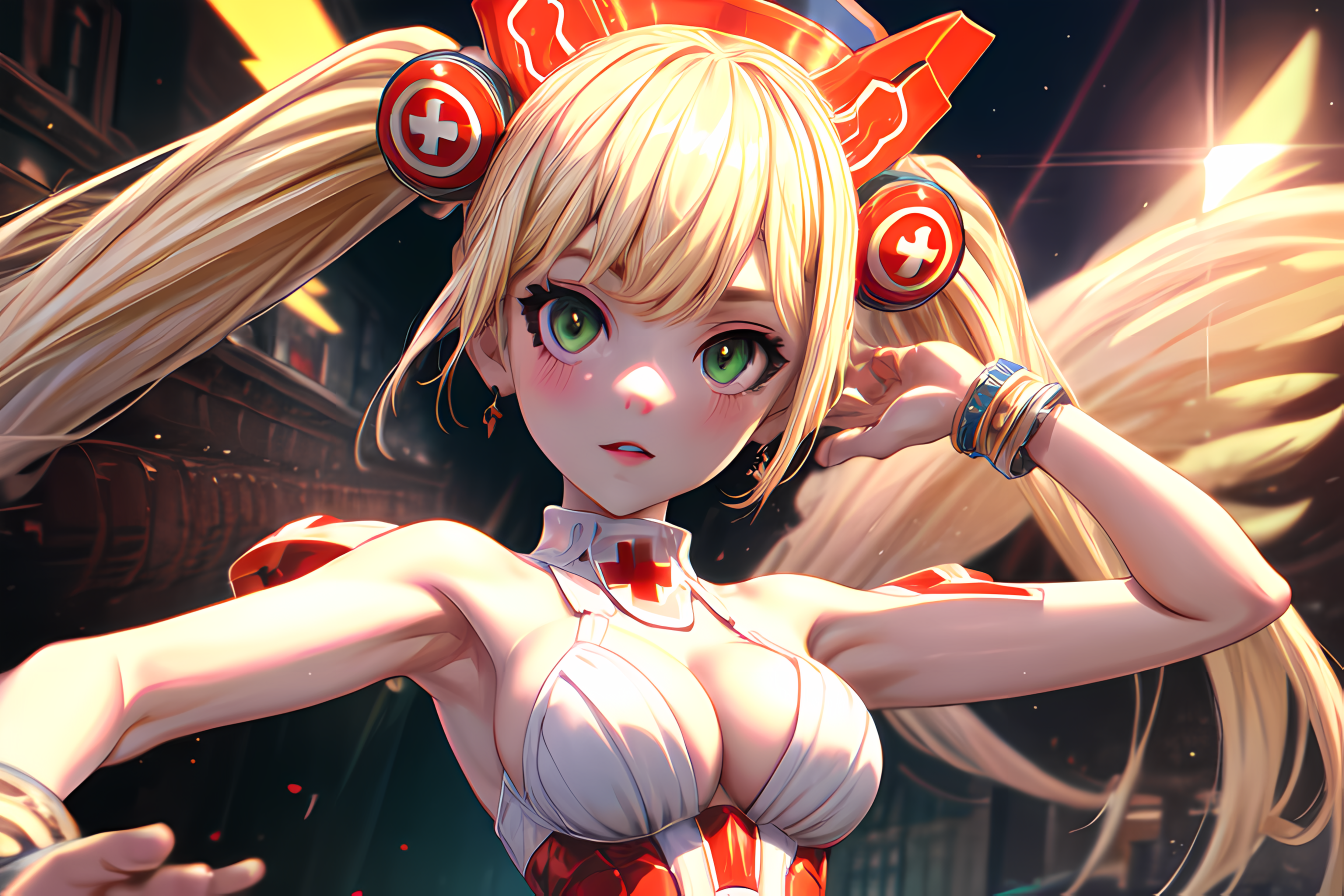 RMedic, nurse outfit, nurse cap, blonde hair, green eyes, twintails