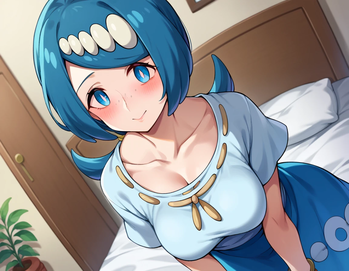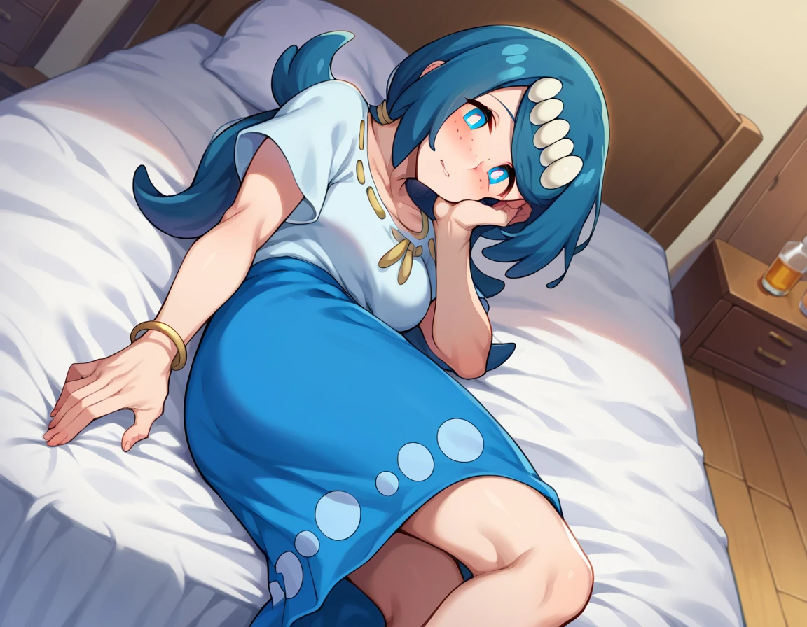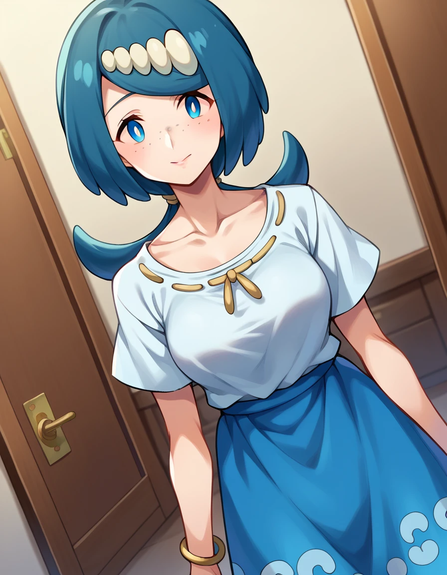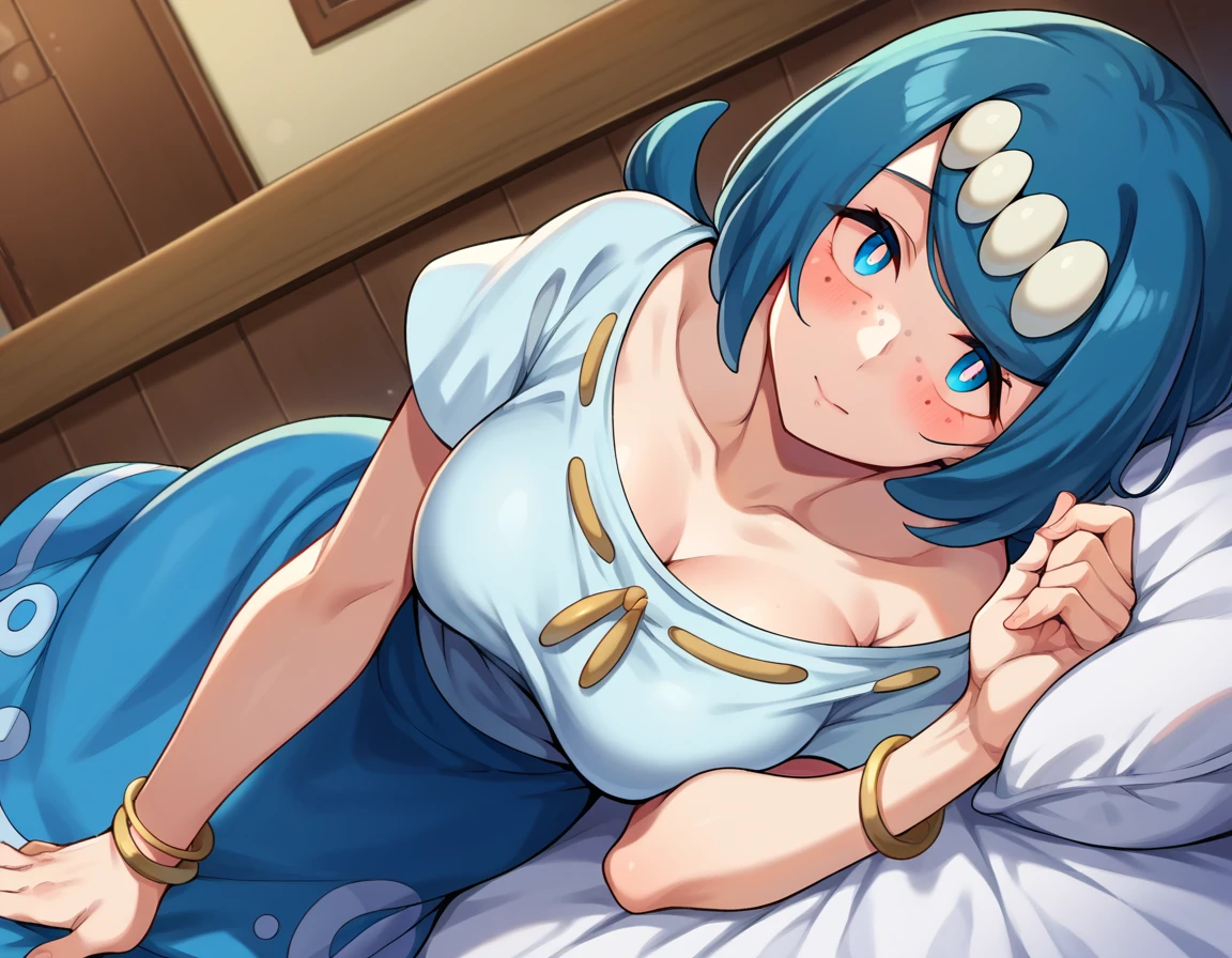 pokemonmotherlana, blue eyes, blue hair, freckles, hair ornament, long hair, swept bangs, bright pupils,