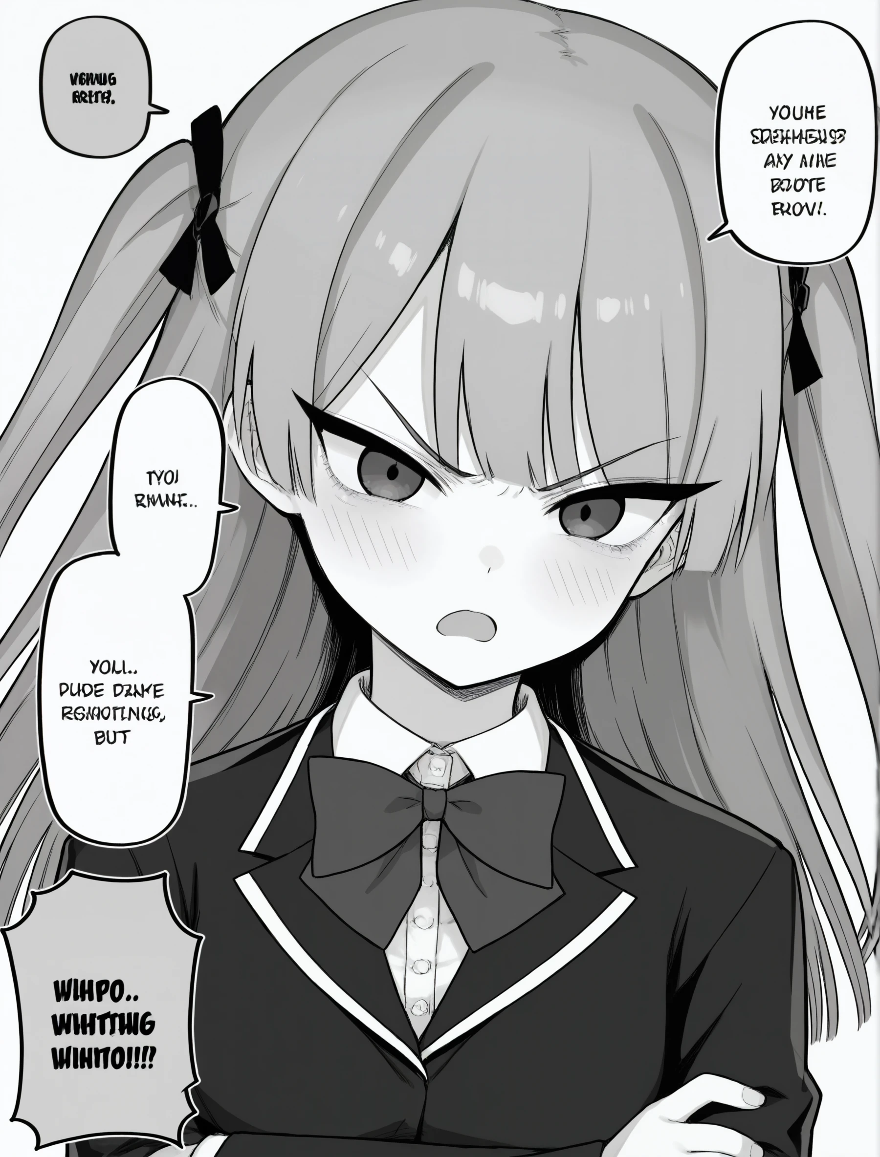 character: momohara, twintails, blunt bangs, long hair, tsundere eyes