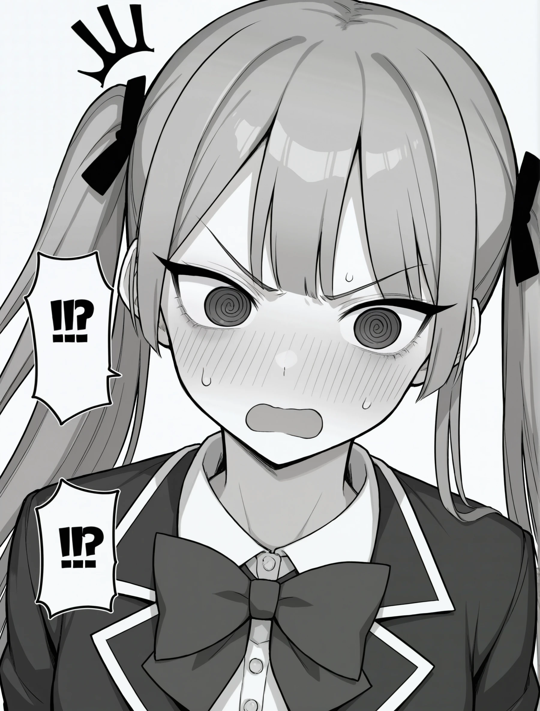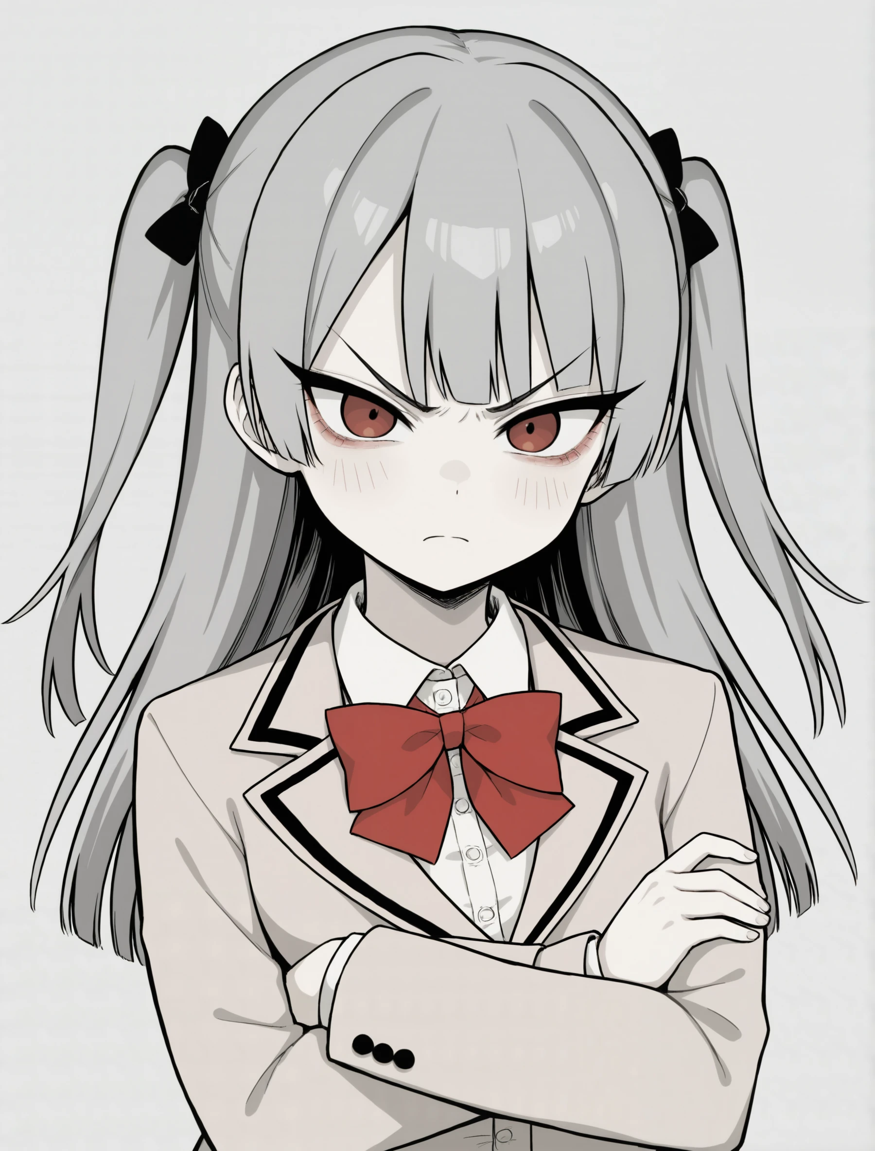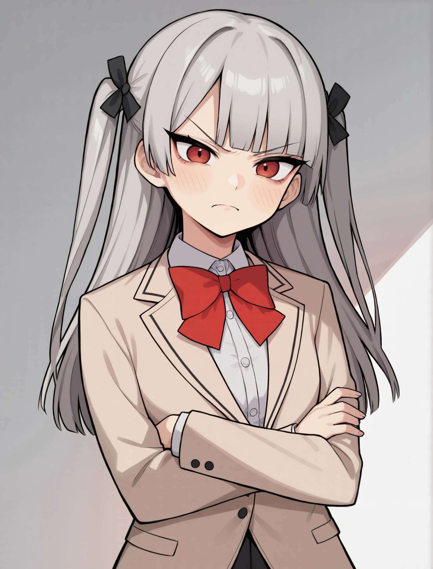 momohara, twintails, blunt bangs, long hair, tsundere eyes, school uniform, beige jacket, black bows, red bowtie, black pleated skirt, grey hair, red eyes