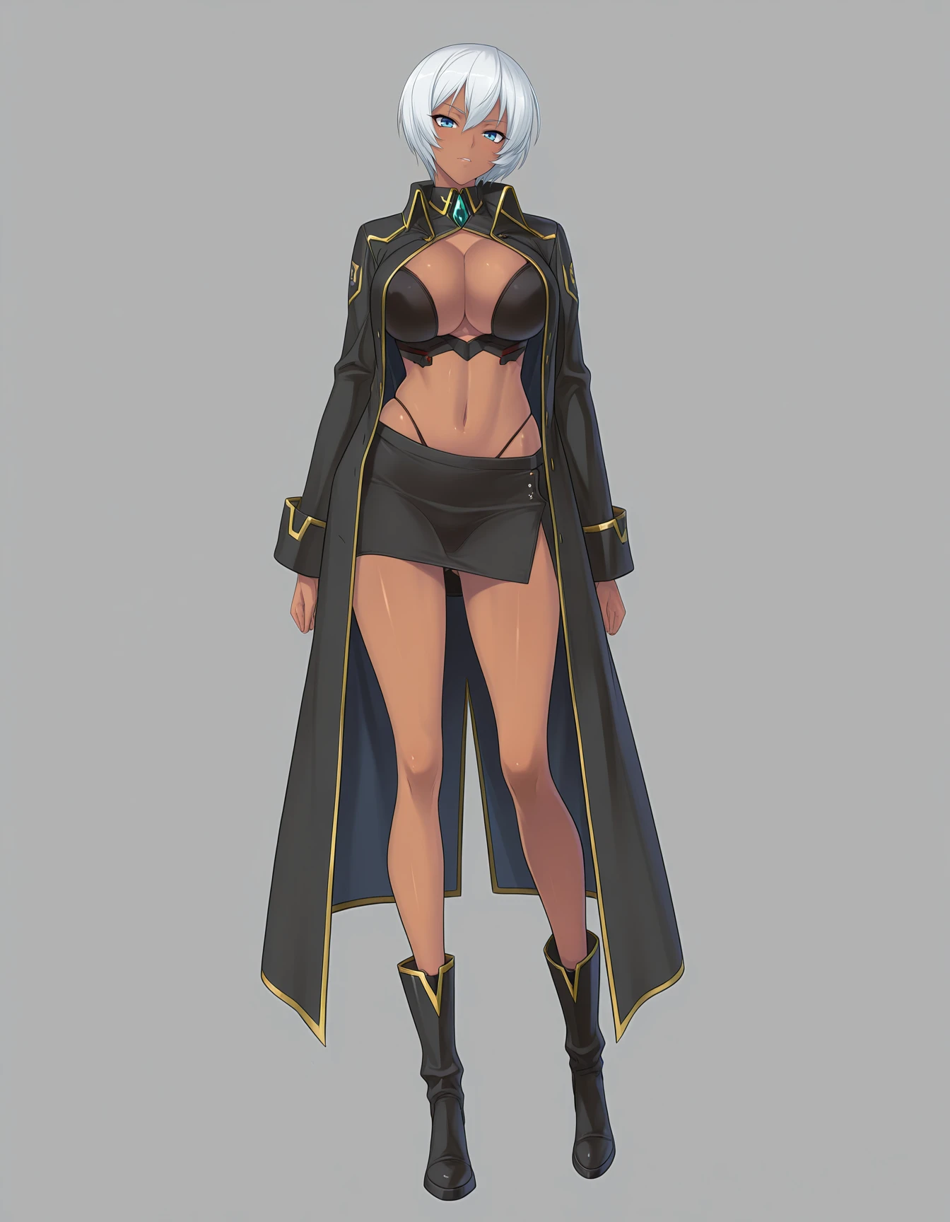 mai_pbg2,mai_kilia,dark-skinned_female,short_hair,white_hair,blue_eyes,large_breasts,underwear,skirt,navel,cleavage,highleg_panties,boots,long_coat,black_coat
