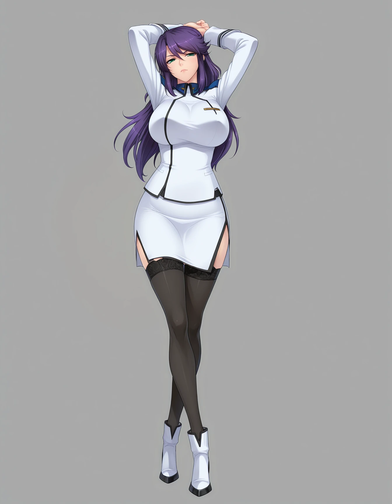 mai_pbg2,mai_rieri,mature_female,long_hair,purple_hair,green_eyes,large_breasts,military_uniform,pencil_skirt,miniskirt,side_slit,black_thighhighs,boots,white_uniform,blue_collar