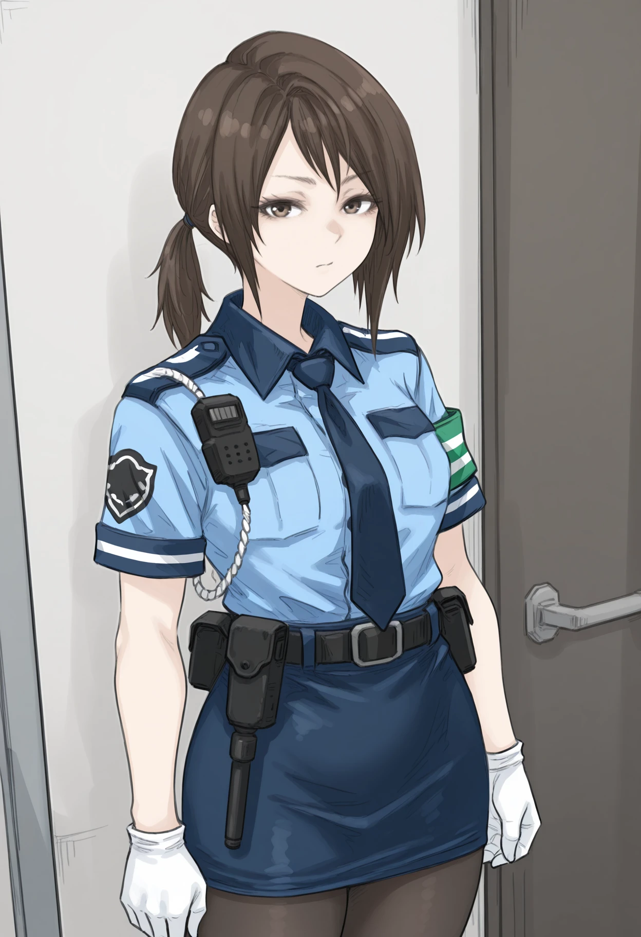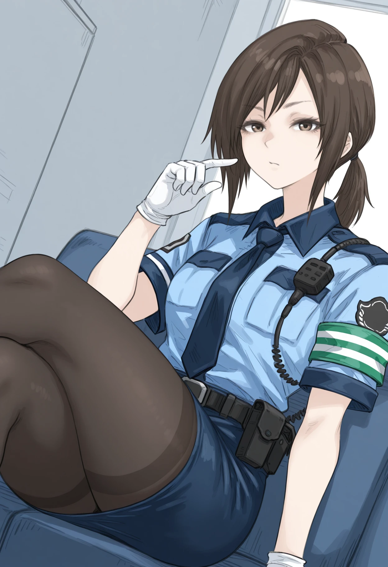 policewoman, police uniform, blue shirt, short sleeves, armband, blue necktie, collared shirt, pencil skirt, utility belt, blue skirt, miniskirt, white gloves, walkie-talkie, black pantyhose,