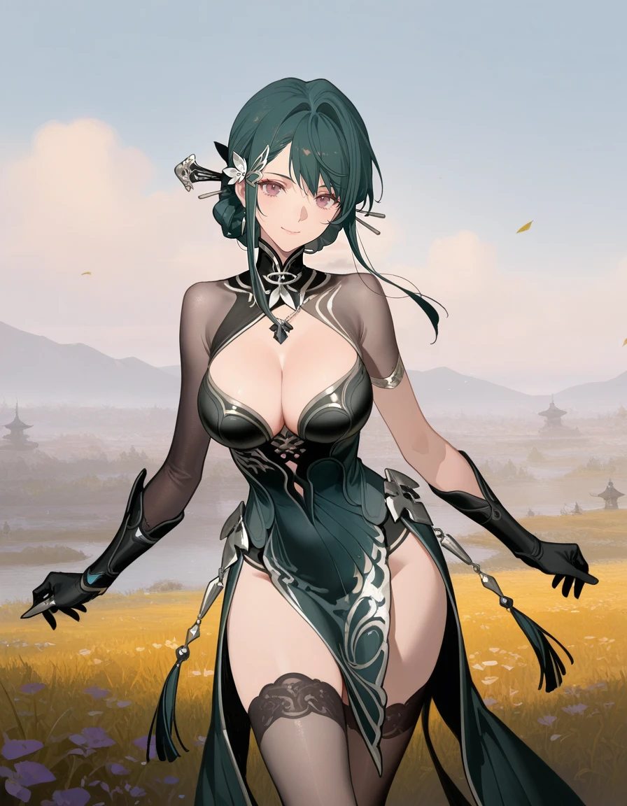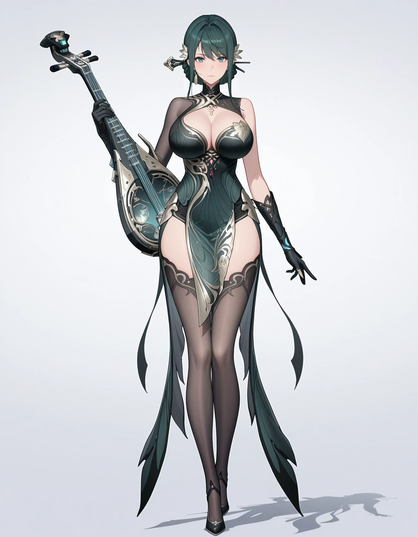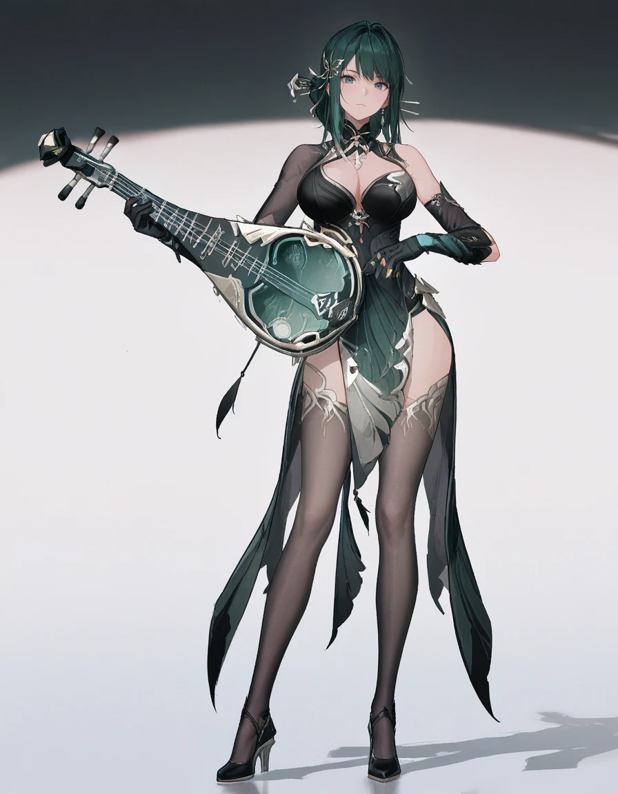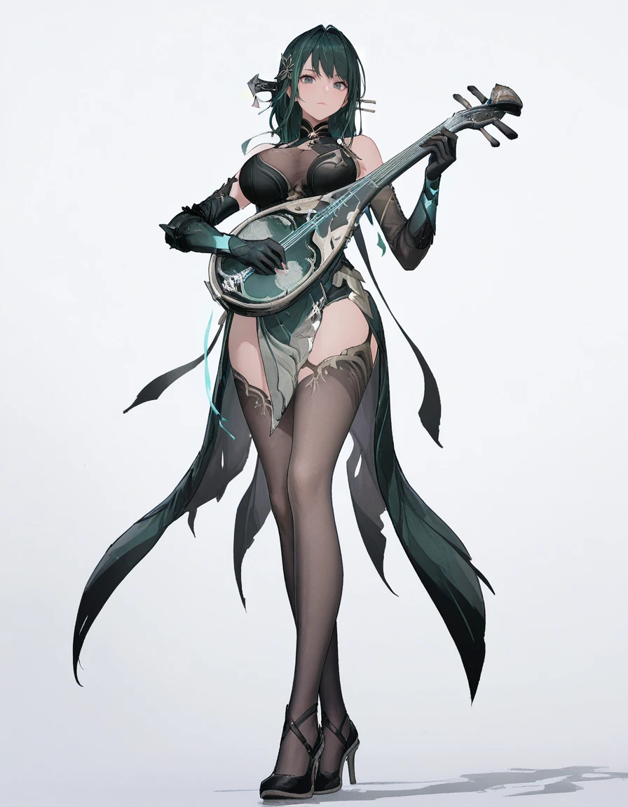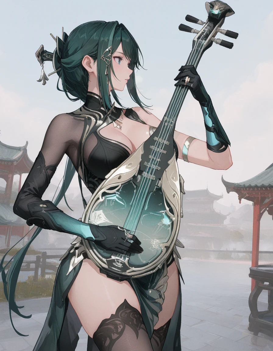 mai_pgr_hy_tx,long_hair,hair_bun,green_hair,hair_stick,tassel_hair_ornament,mature_female,(age_up:1),large_breasts,chinese_clothes,cleavage,asymmetrical_sleeves,elbow_gloves,black_thighhighs,high_heels,holding_instrument