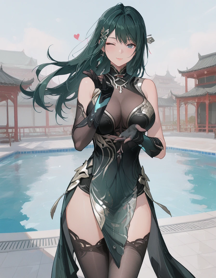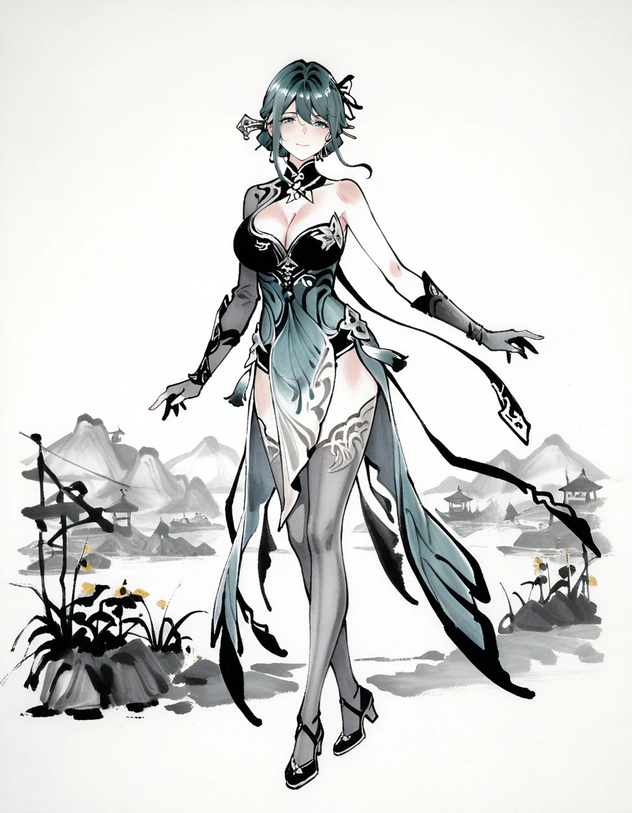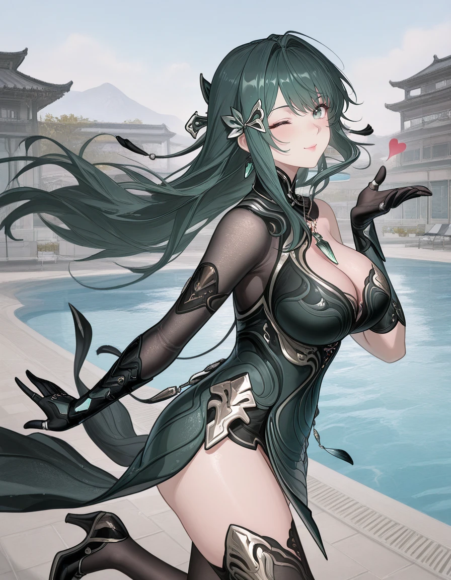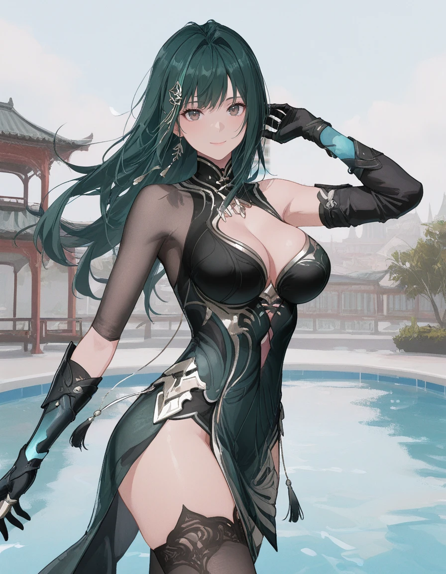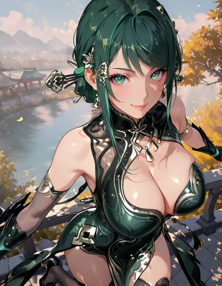 mai_pgr_hy_tx,long_hair,hair_bun,green_hair,hair_stick,tassel_hair_ornament,mature_female,(age_up:1),large_breasts,chinese_clothes,cleavage,asymmetrical_sleeves,elbow_gloves,black_thighhighs,high_heels,holding_instrument