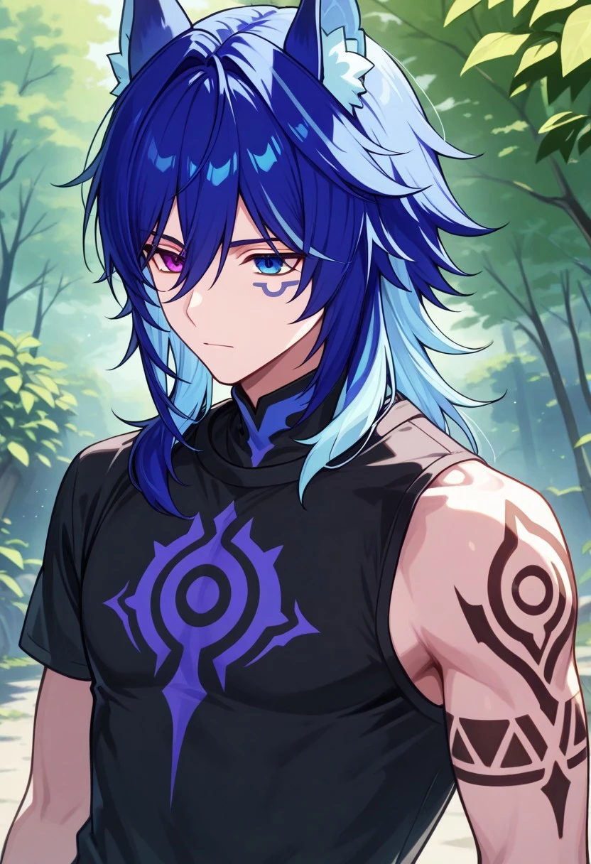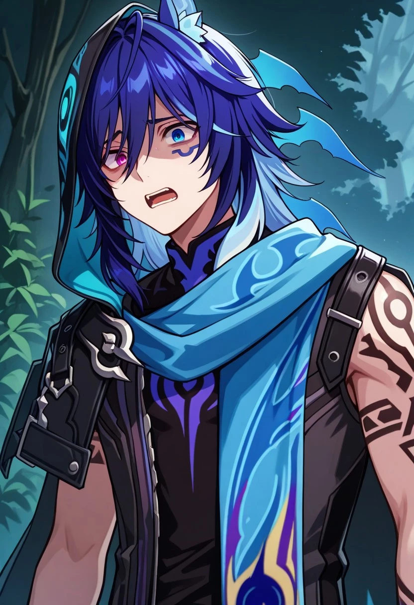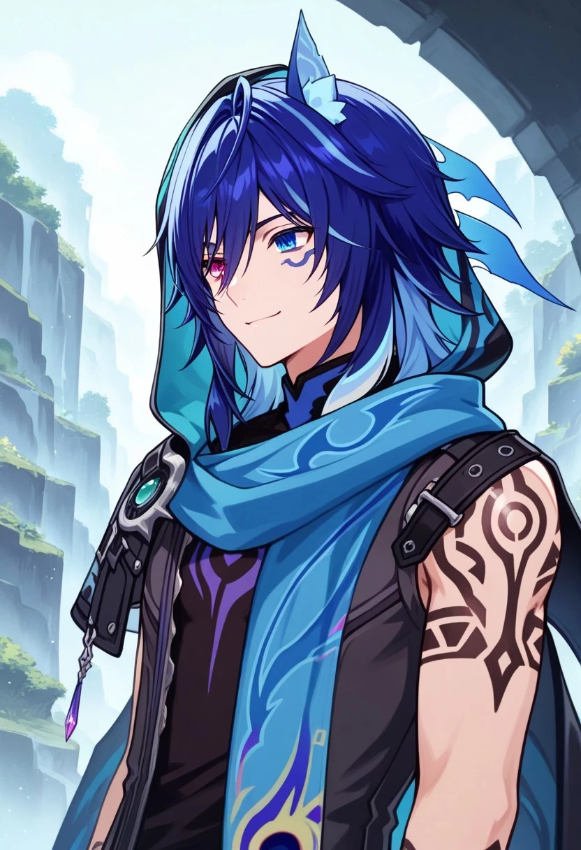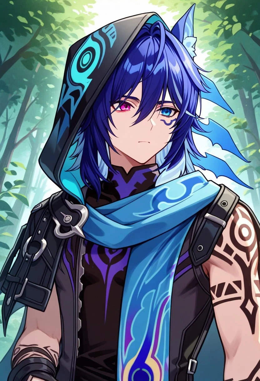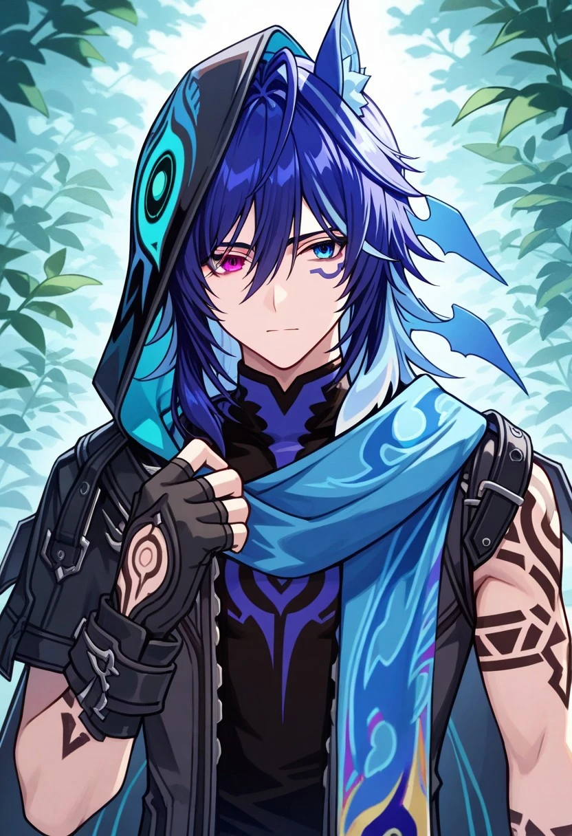 ororon, 1boy, male focus, solo, heterocromia, purple eyes, blue eyes, blue hair, two-tone hair, long hair, hair between eyes, animal ears, animal ear fluff, bat ears, facial mark, tattoo, arm tattoo, shirt, black shirt, print shirt, sleeveless, gloves, black gloves, fingerless gloves, jacket, sleeveless jacket, black jacket, zipper, cape, hooded cape, hood up, scarf, blue scarf, pants, denim, torn pants, pants tucked in, boots,