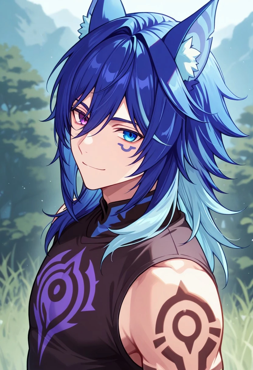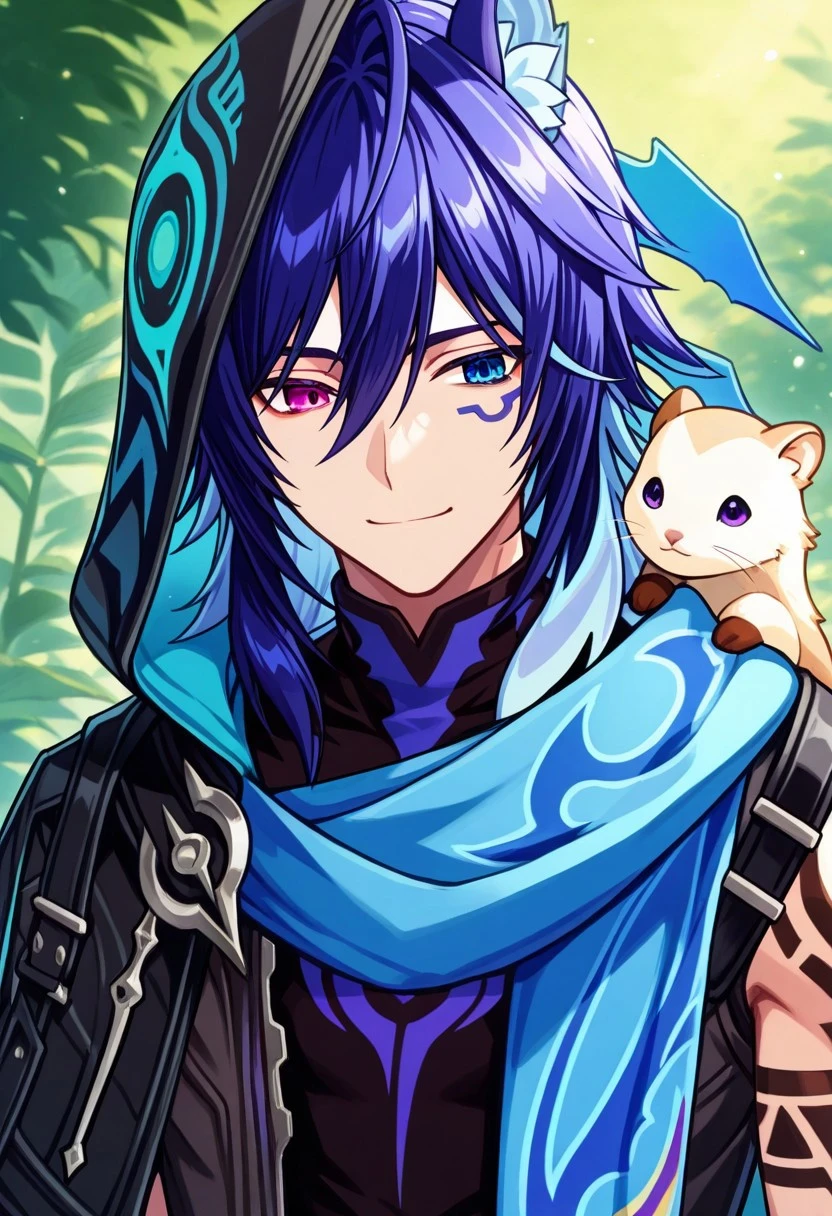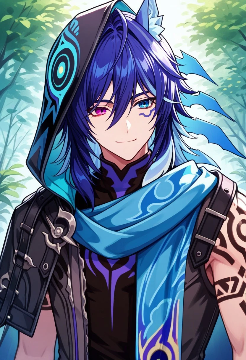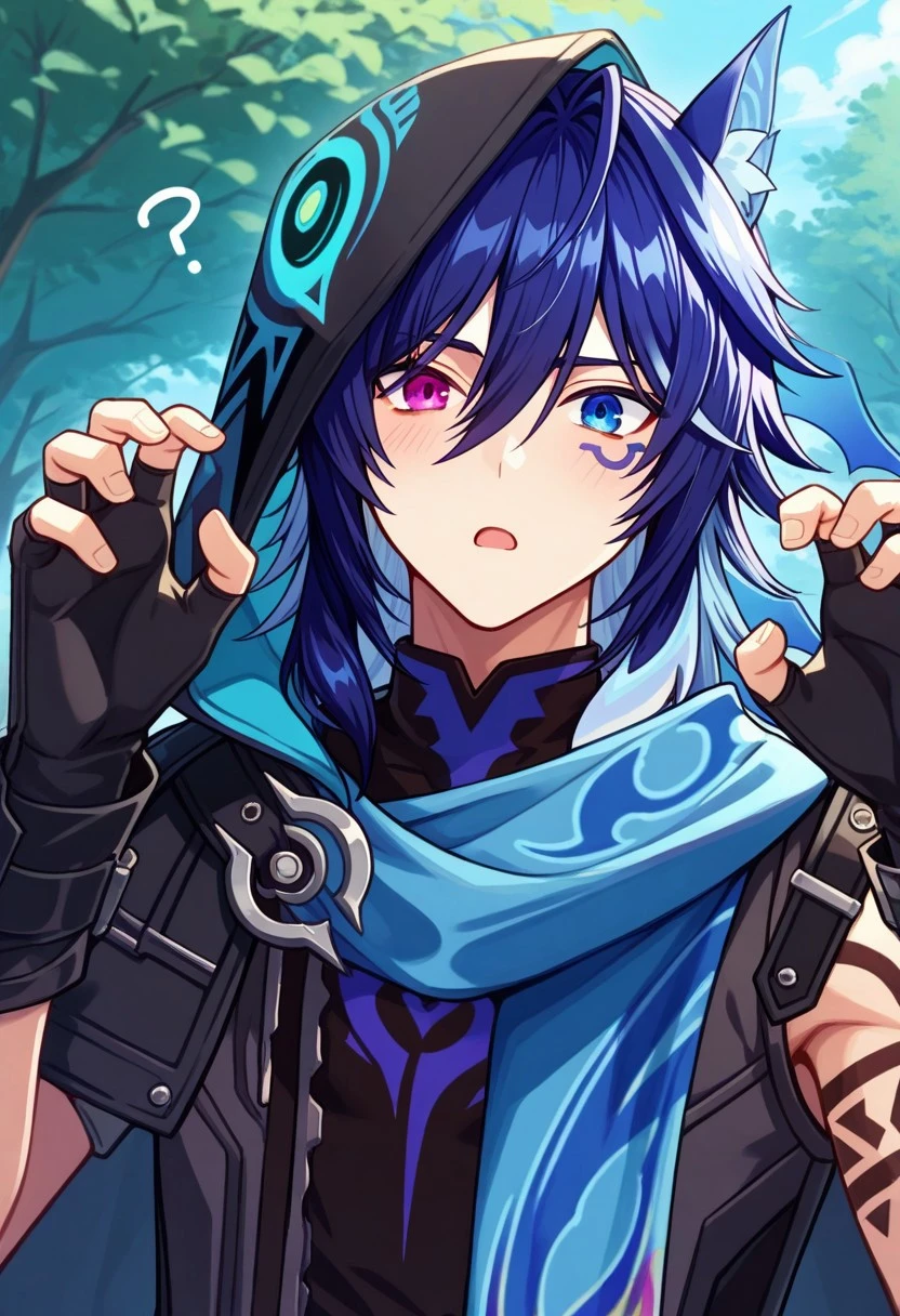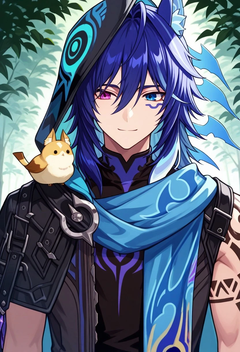 ororon, 1boy, male focus, solo, heterocromia, purple eyes, blue eyes, blue hair, two-tone hair, long hair, hair between eyes, animal ears, animal ear fluff, bat ears, facial mark, tattoo, arm tattoo, shirt, black shirt, print shirt, sleeveless, gloves, black gloves, fingerless gloves, jacket, sleeveless jacket, black jacket, zipper, cape, hooded cape, hood up, scarf, blue scarf, pants, denim, torn pants, pants tucked in, boots,