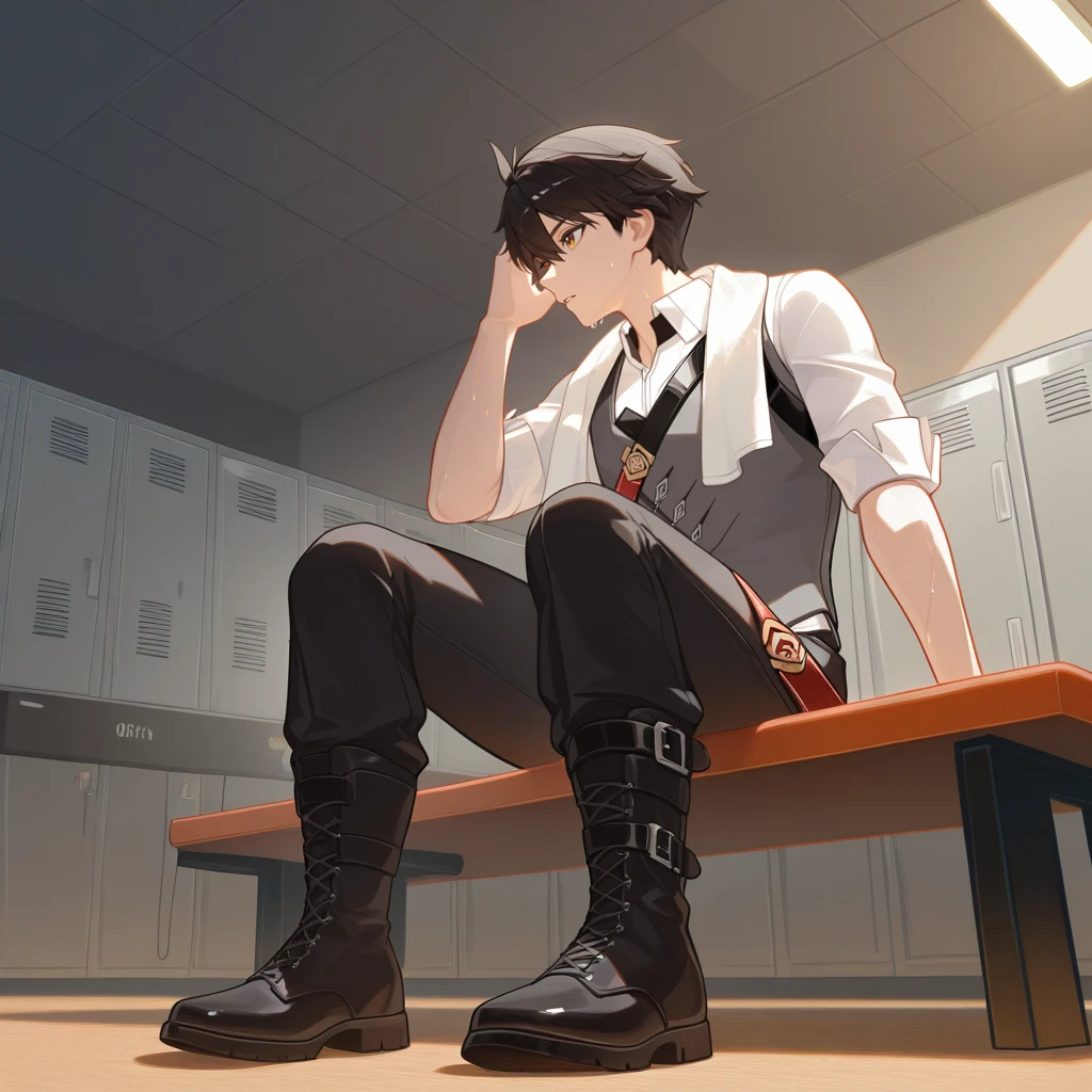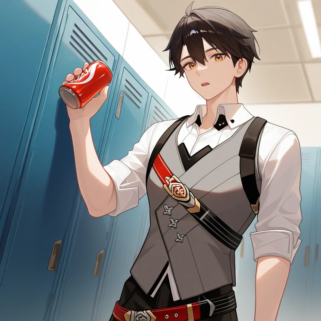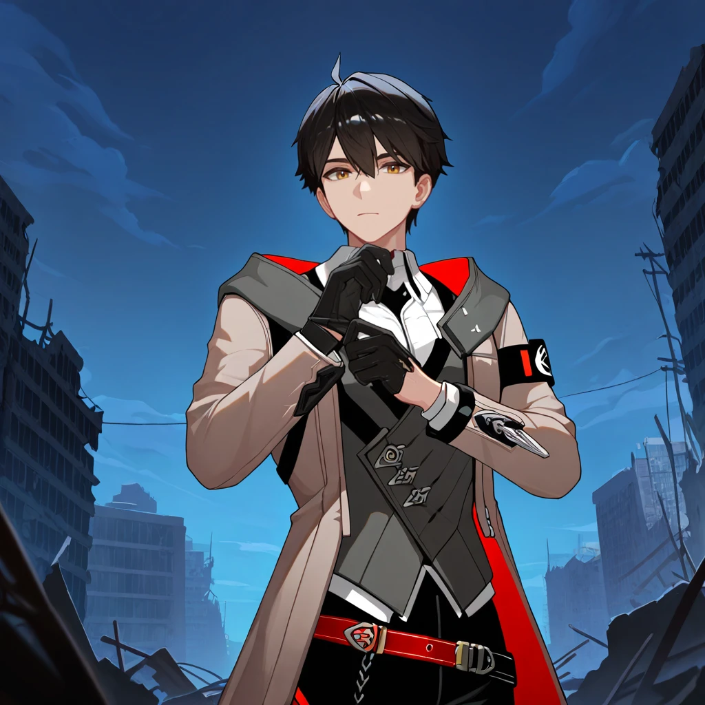 AdamHi3, Adm_Def, black hair, brown eyes, short hair, white shirt, collared shirt, shirt, black strap, grey vest, vest, light brown coat, two-sided coat, open coat, hooded coat, hood down, grey hood, light brown sleeves, long sleeves, multiple belts, pouch, brooch, black gloves, gloves, glove cutout, black armband, black pants, pants, red belt, loose belt, red trim, red strap, leg strap, belt boots, black footwear, cross-laced boots,Default Outfit: (2nd Variation without the Coat)