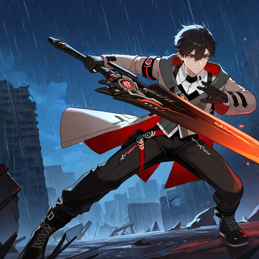 AdamHi3, Adm_Alt, black hair, brown eyes, short hair, white shirt, collared shirt, open collar, shirt, black strap, grey vest, vest, no coat, shoulder strap, white sleeves, sleeves rolled up, multiple belts, black pants, pants, red belt, loose belt, red trim, red strap, leg strap, belt boots, black footwear, cross-laced boots,Optional: The weapon is not perfect, but if you want to add "sword, greatsword, holding sword, weapon, holding weapon," for his weapon.