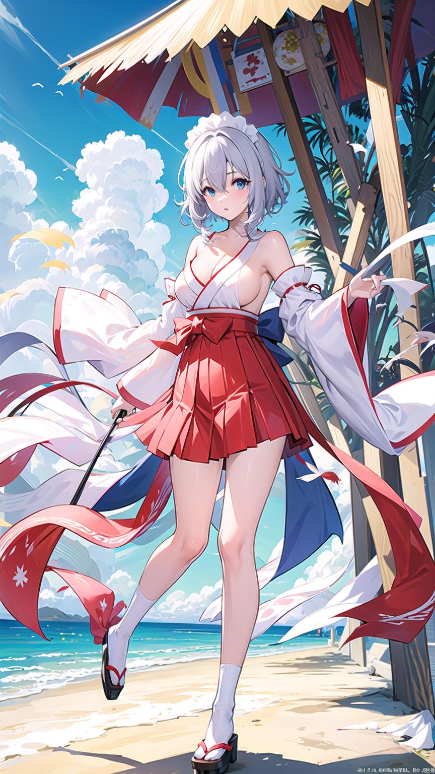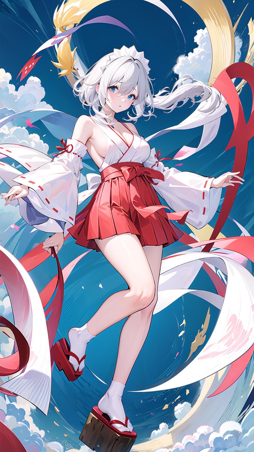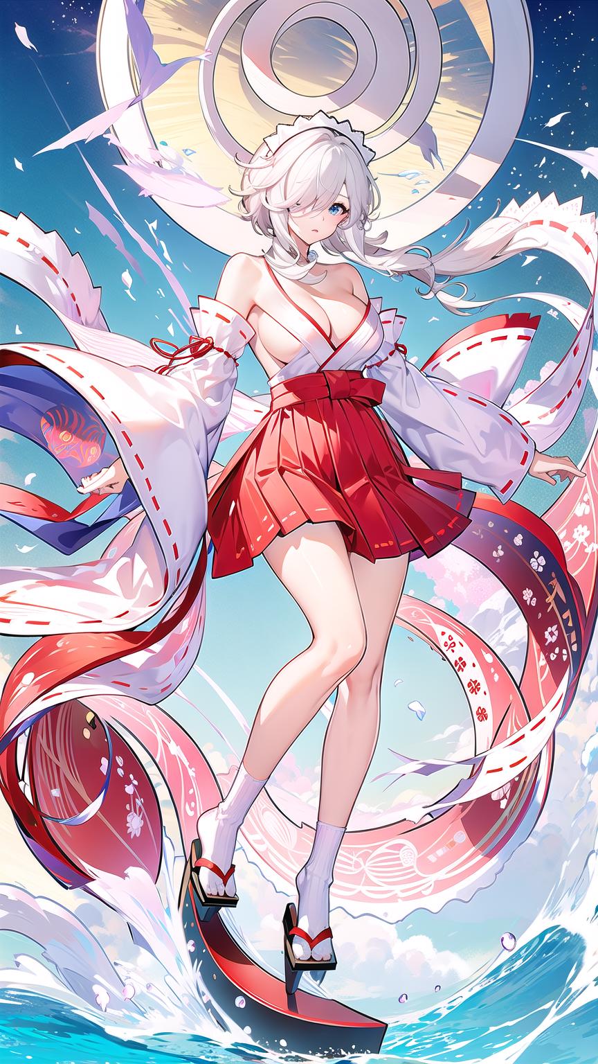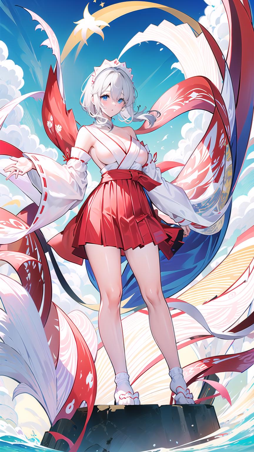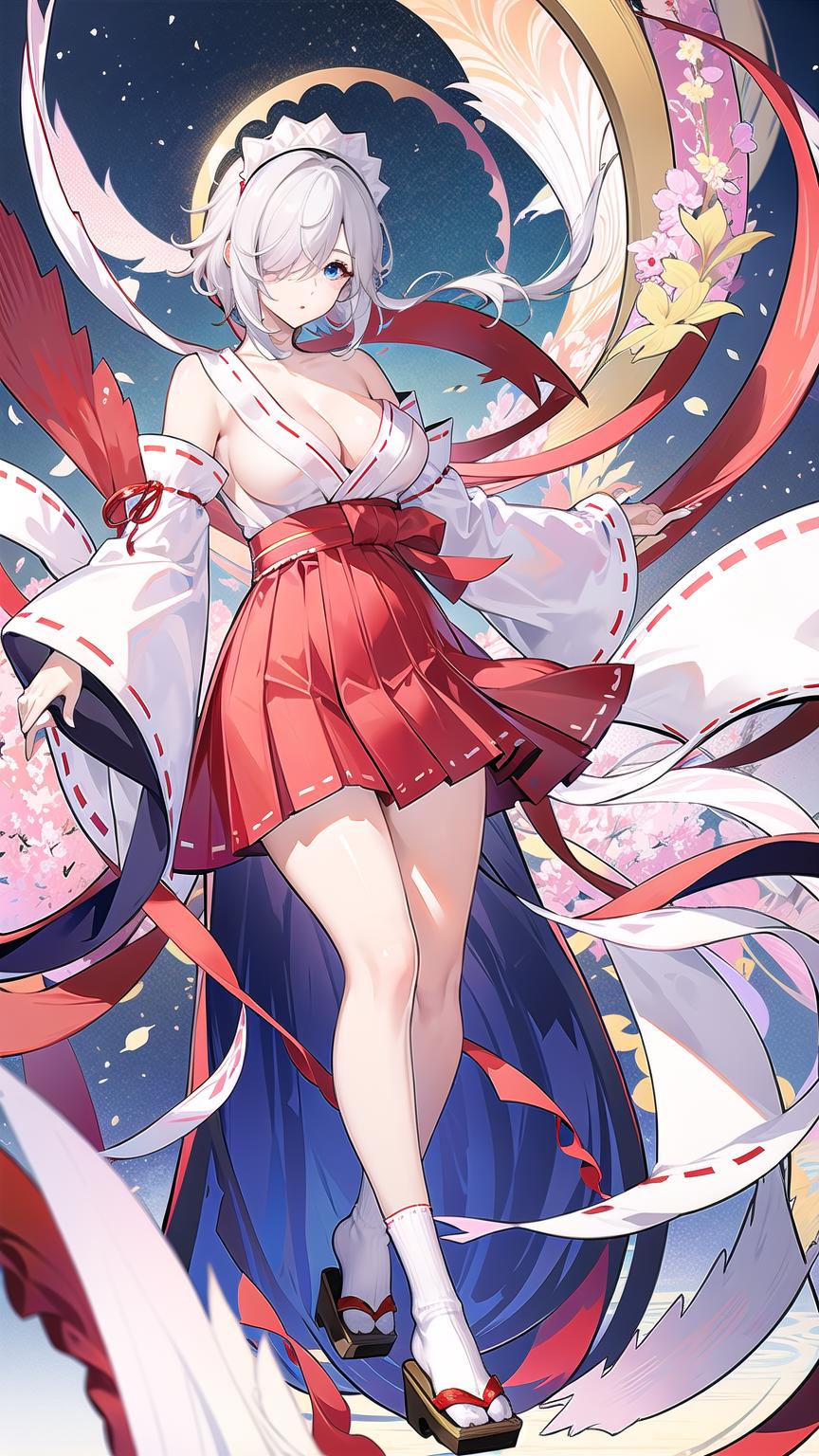 masterpiece, best quality, 1girl, breasts, blue eyes, hair over one eye, skirt, solo, wide sleeves, tabi, large breasts, japanese clothes, white hair, looking at viewer, bare shoulders, holding, full body, red skirt, geta, thighs, hakama, socks, maid headdress, official alternate costume, detached sleeves, cleavage, hakama skirt, short hair, long sleeves, white socks, hakama short skirt, braid, sideboob, red hakama, bangs, kimono,<lora:LunaAzurV1-000008:0.8>, lunaazur,sitting, on field, sky, sky background, clouds,