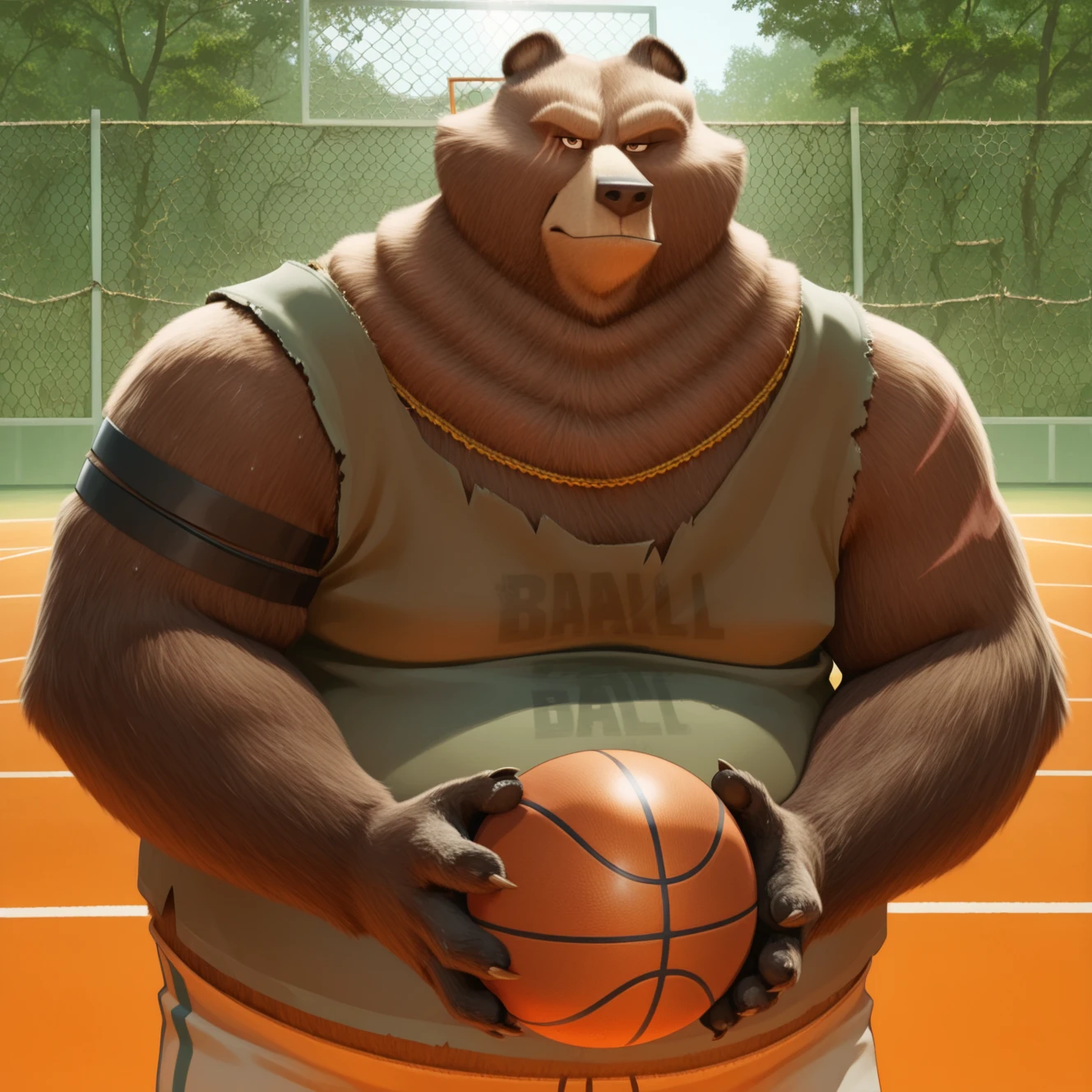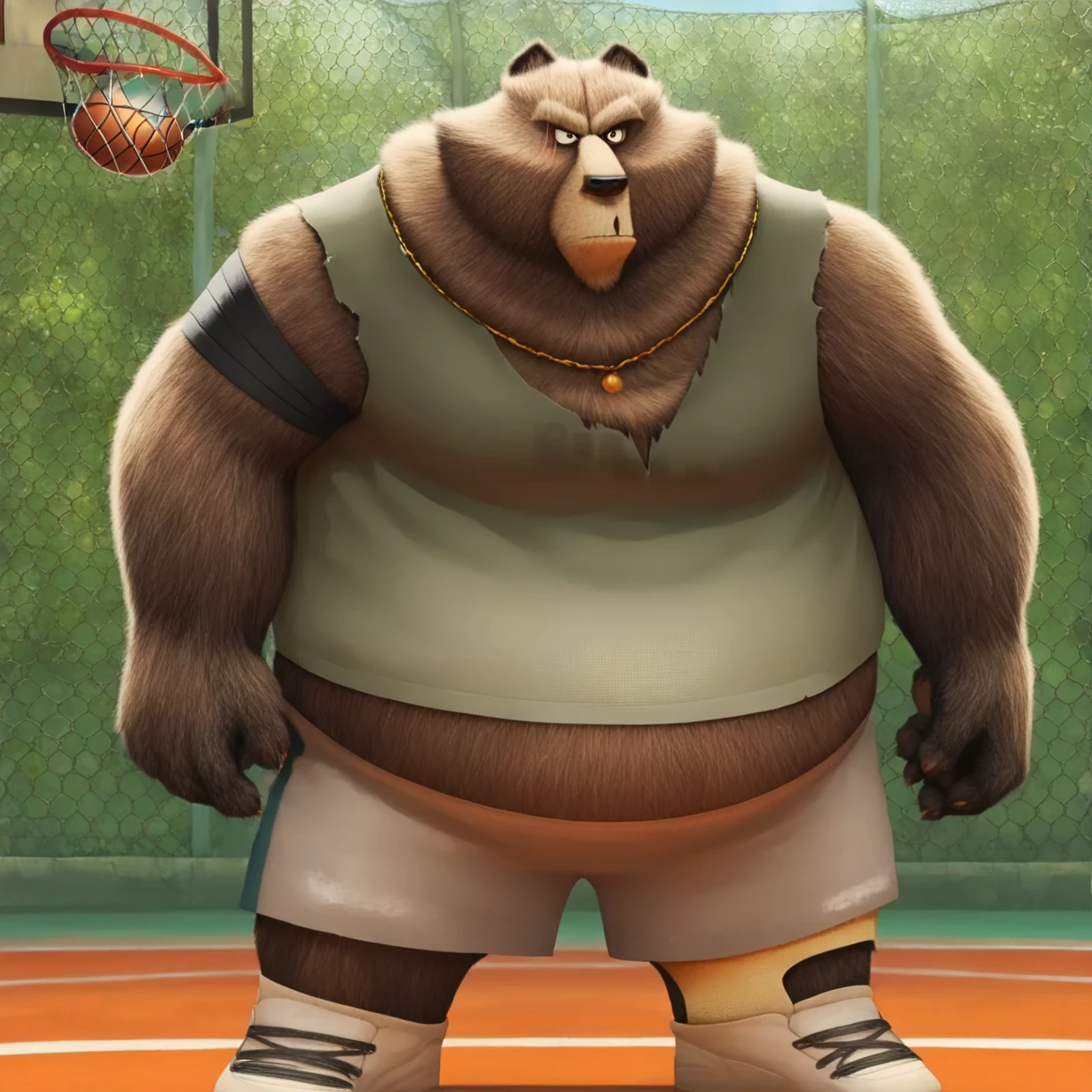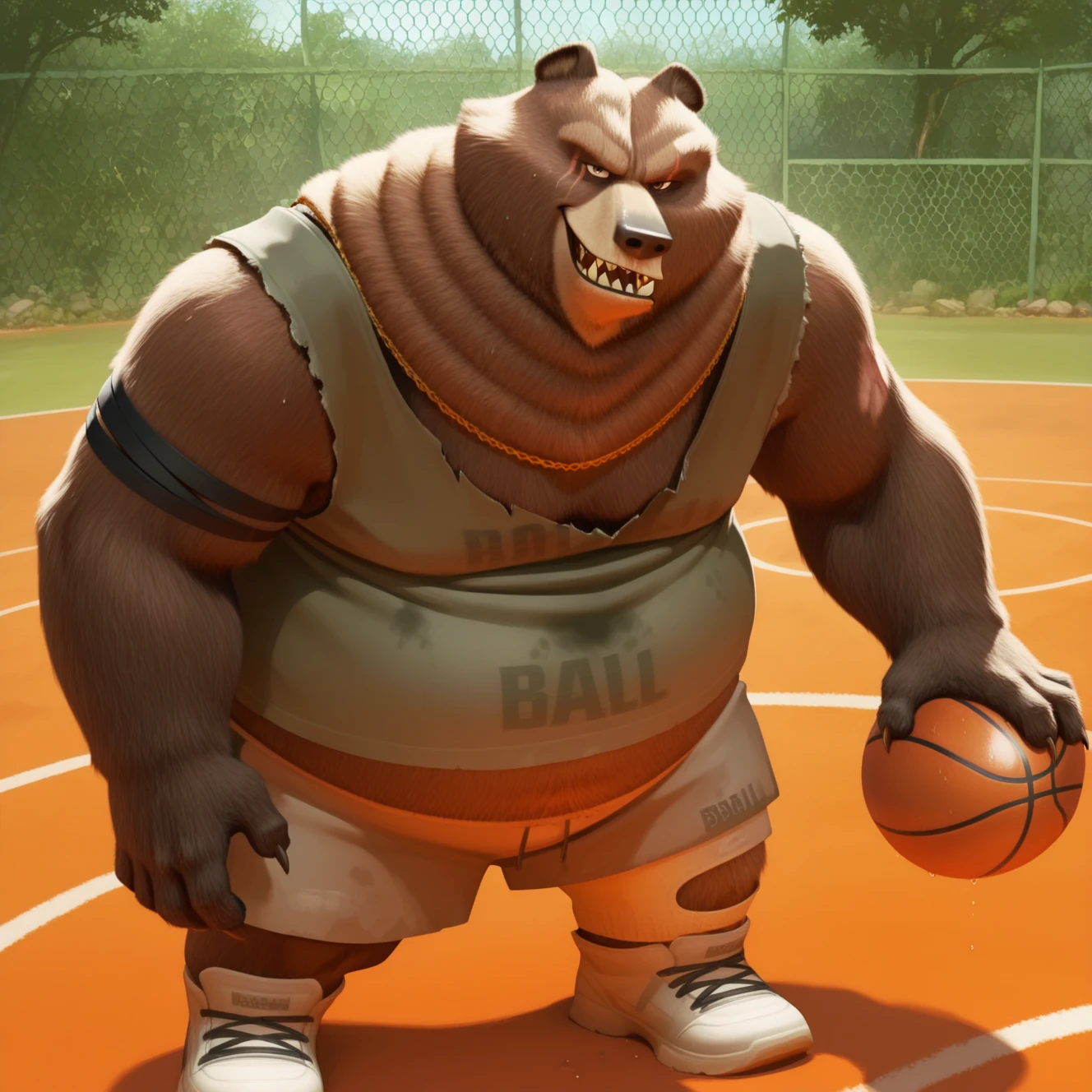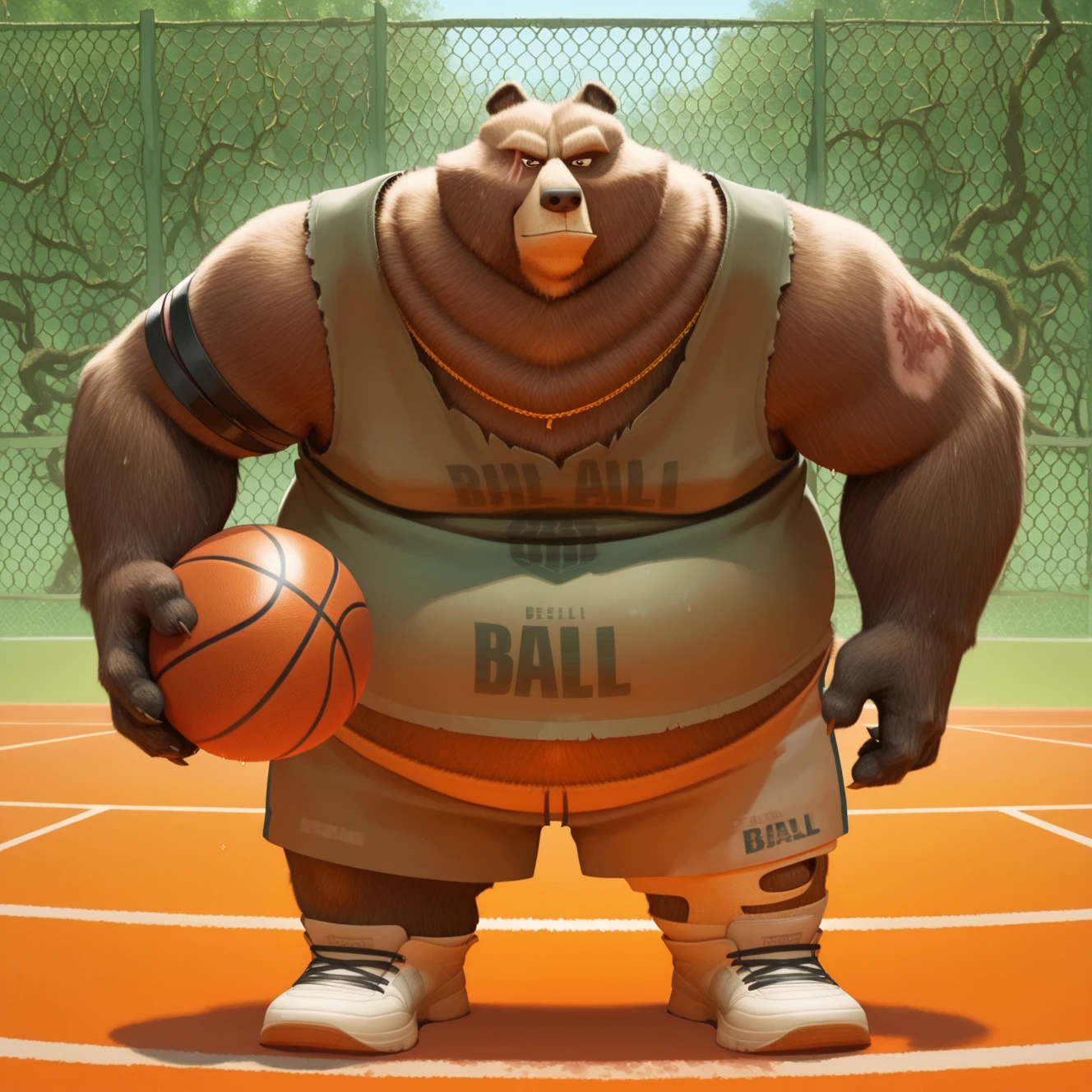 Grizz, solo, 1boy, bear, furry, fat, brown fur, scars across right eye, brown eyes, gold chain, ripped shirt, sleeves ripped off, sleeveless, white shorts with blue vertical lines going down the sides, white sneakers, black fabric tied around right bicep