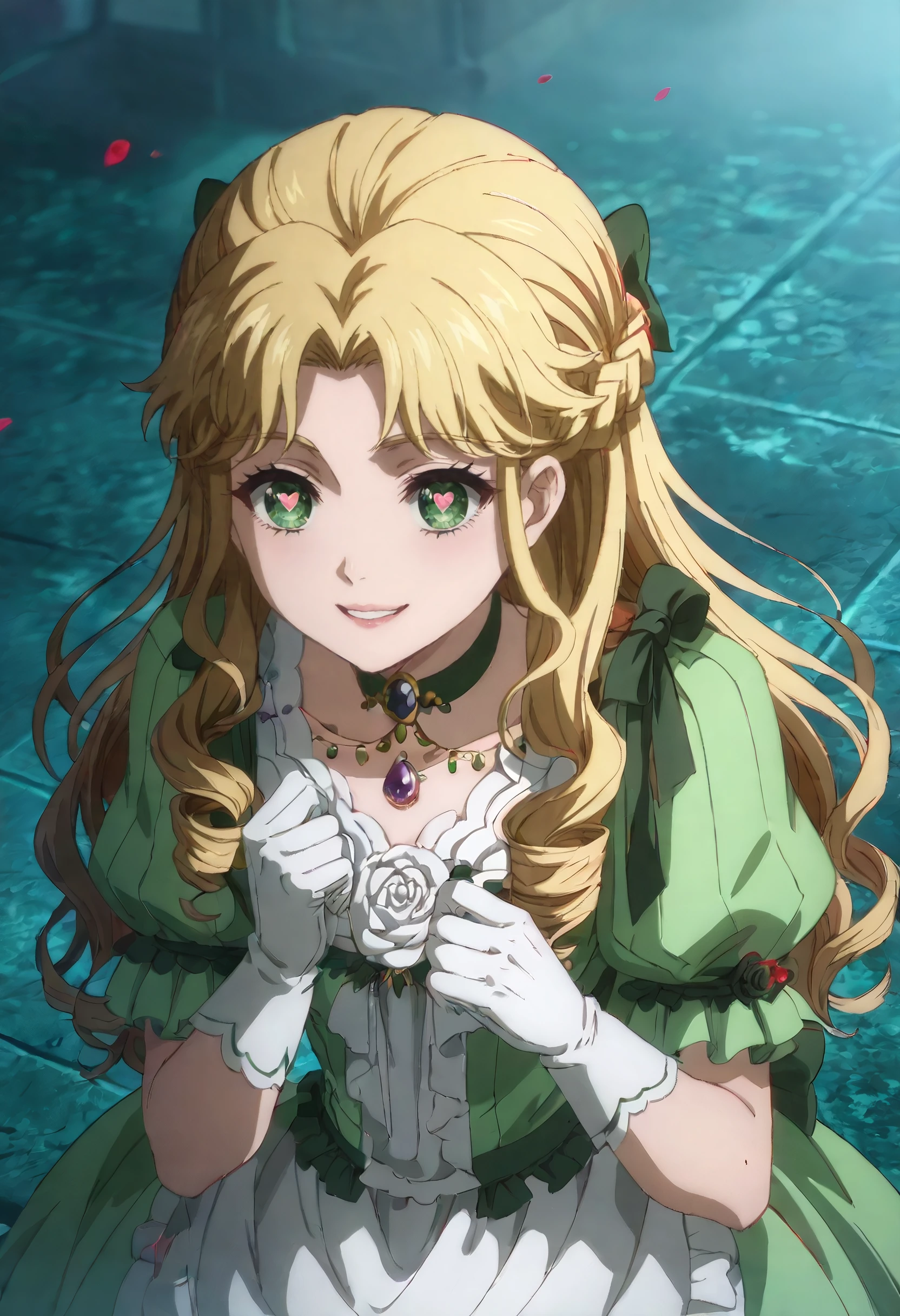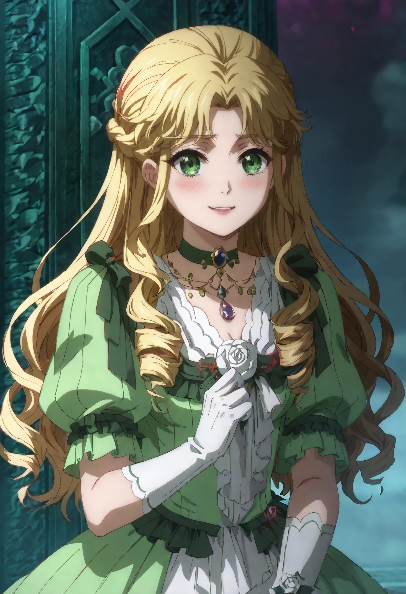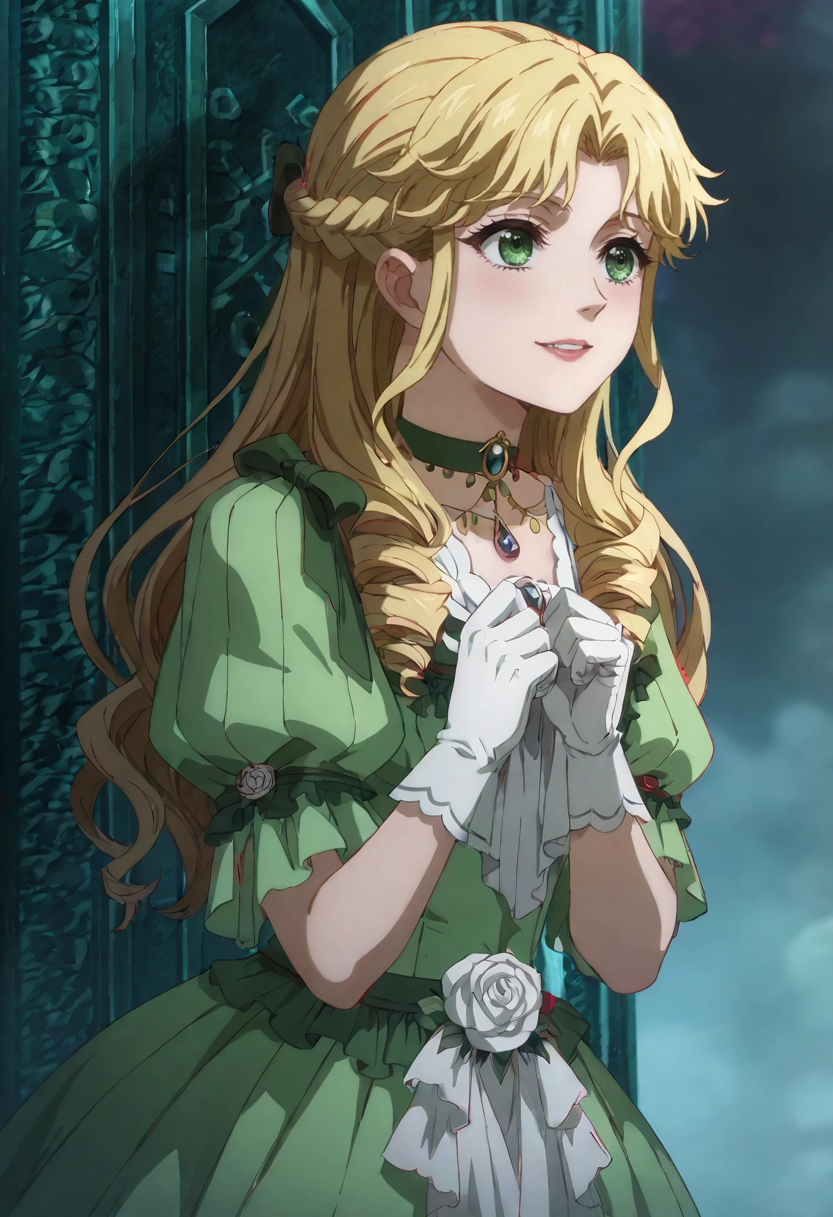 AudreyOutfit, green dress, dress, flower, rose, choker, puffy sleeves, jewelry, green choker, gem, bow, green gemstone, puffy short sleeves, gown, gloves, necklace, white gloves, victorian, long dress, frilled dress,