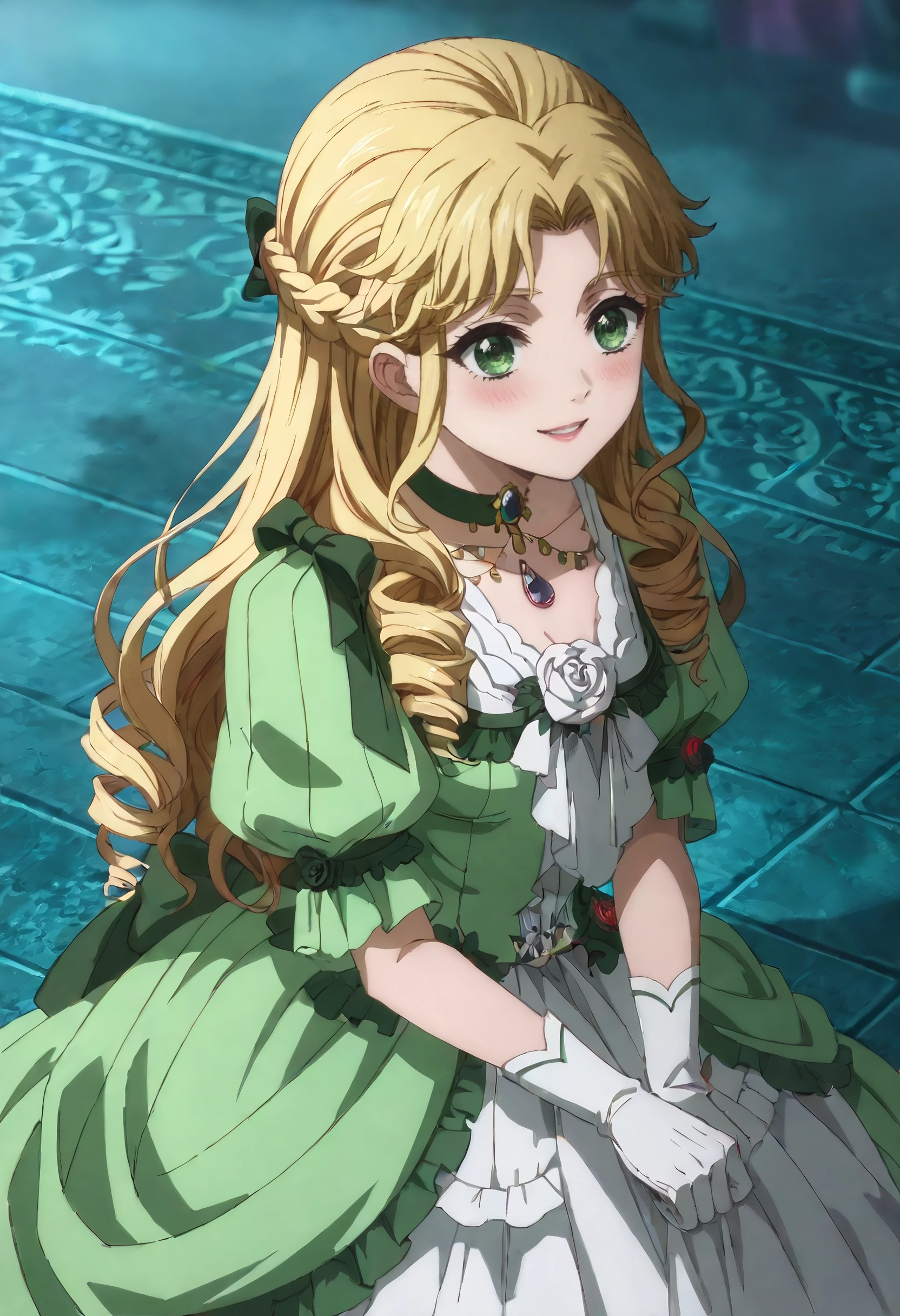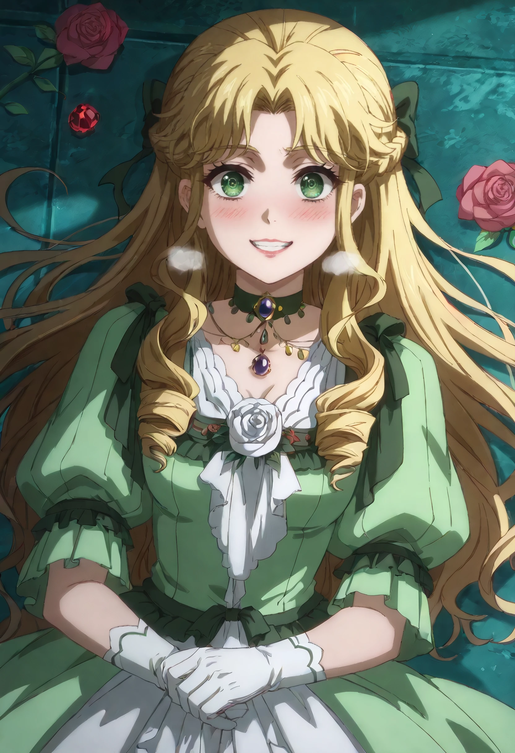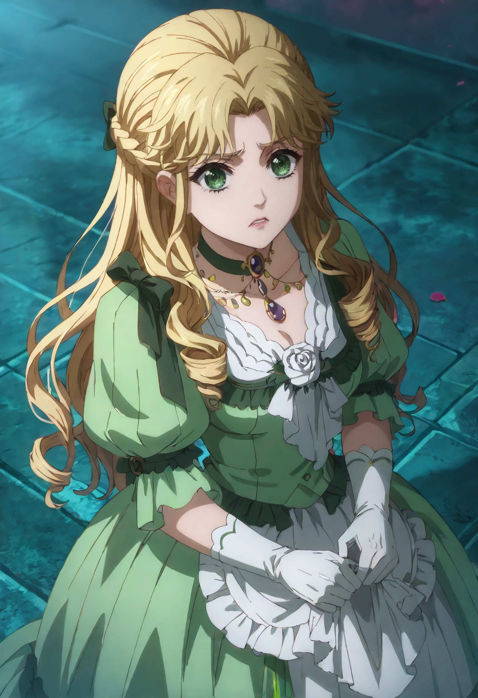 AudreyOutfit, green dress, dress, flower, rose, choker, puffy sleeves, jewelry, green choker, gem, bow, green gemstone, puffy short sleeves, gown, gloves, necklace, white gloves, victorian, long dress, frilled dress,