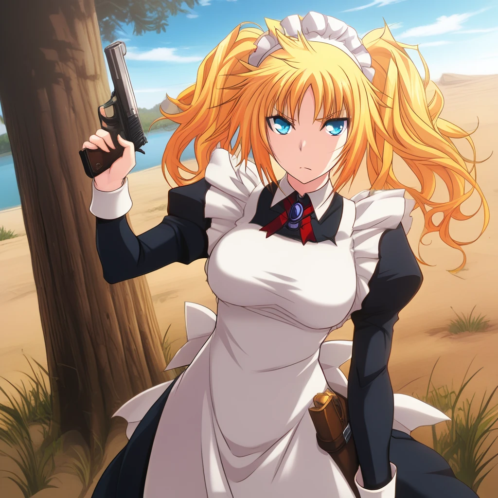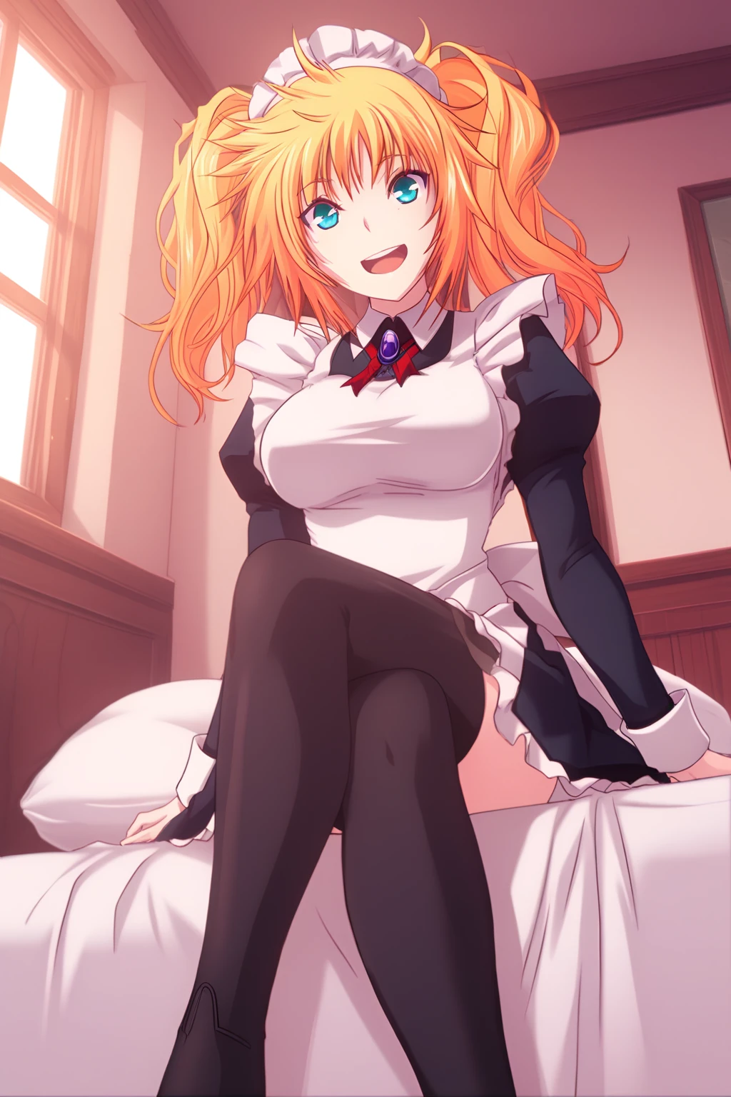 stasy_majikoi,blonde hair,blue eyes,puffy sleeves,messy hair,apron,maid apron, maid headdress,maid_outfit,maid,twintails,long hairs,juliet sleeves,(black thighhighs), long sleeves,large breasts