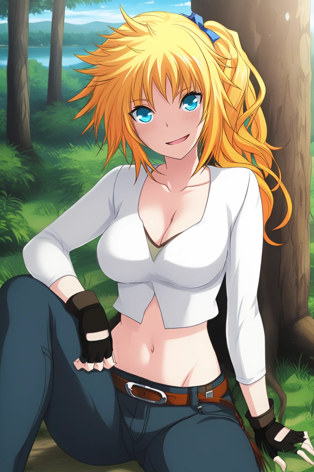 stasy_majikoi,blue eyes,blonde hair,ponytail,long hair,midriff,shirt,white shirt,jeans,groin,hair ribbon,blue ribbon,messy hair,crop top,collarbone,side ponytail,navel,belt,cleavage,fingerless gloves,denim,gloves,large breasts