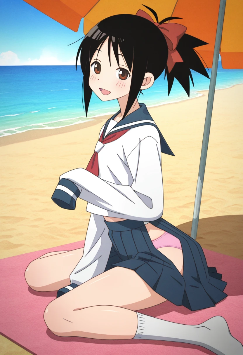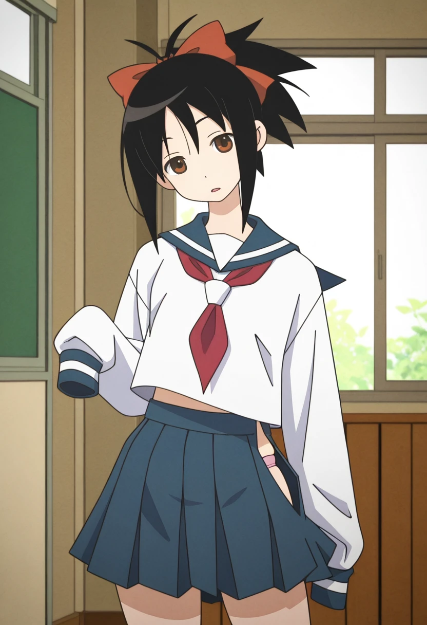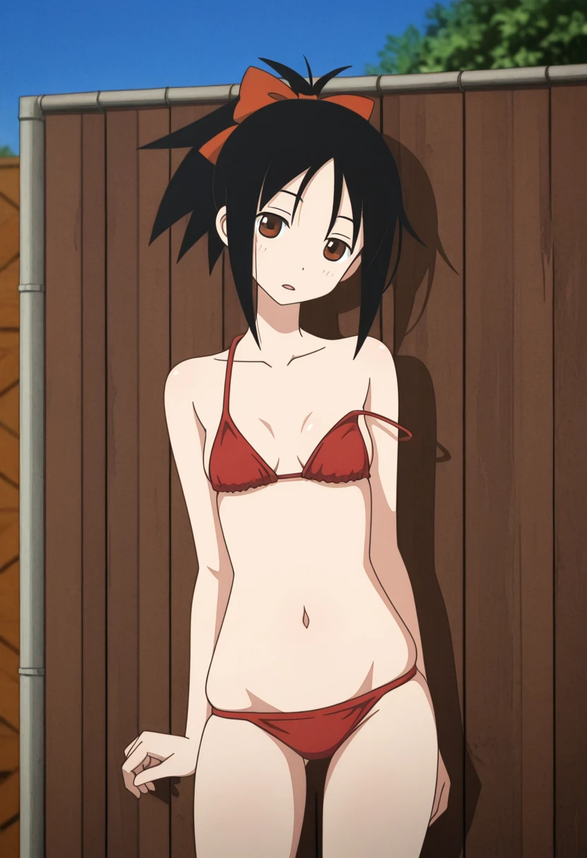 kanakoww, brown eyes, black hair, ponytail, hair bow, red bow,