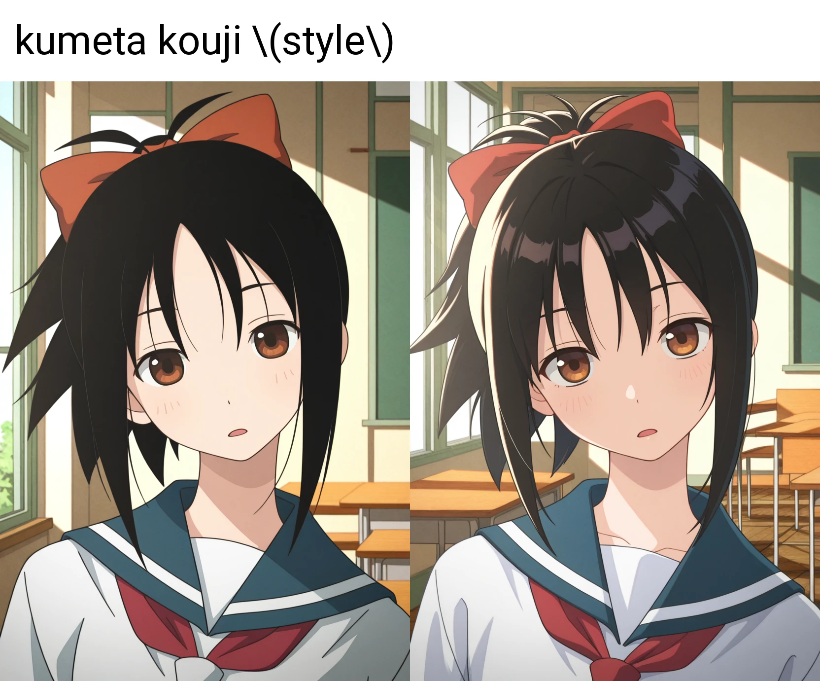 プロンプトに"kumeta kouji \(style\)"を追加する方が、再現度が高くなるようです。
