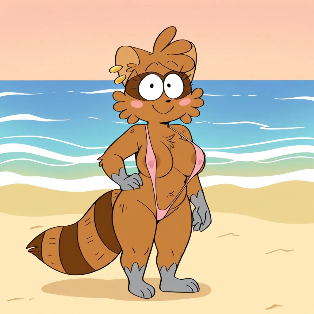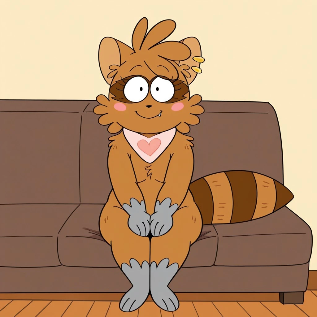 Raccoon, raccoon girl, brown fur, black eyes, black nose, raccoon ears, gray paws, raccoon tail, ear piercing, pink neckerchief, fang