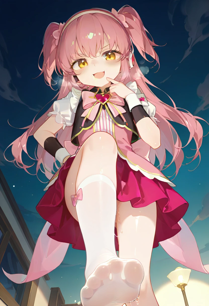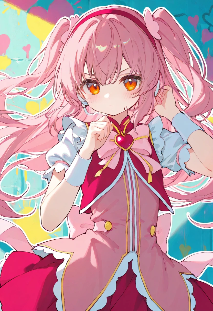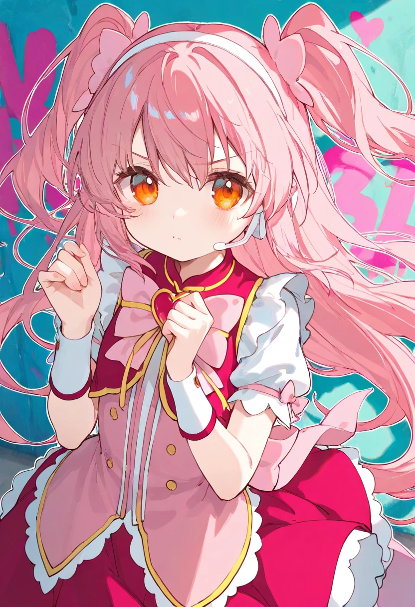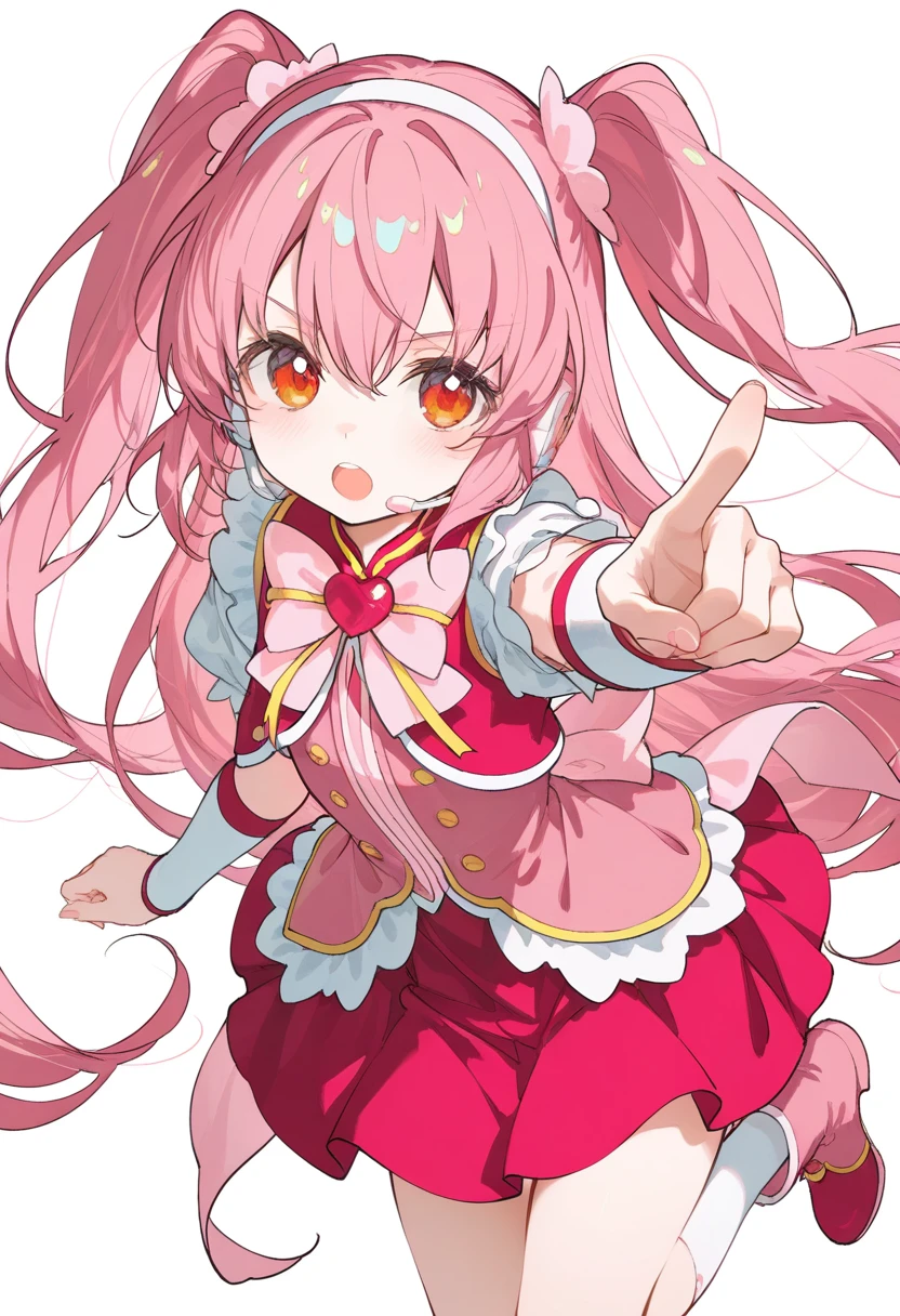bianshenmeixue,magical girl,1girl,solo,pink hair,long hair,two side up,hairband,orange eyes,headset,pink dress,brooch,red skirt,pink bow,bow,heart brooch,jewelry,puffy short sleeves,puffy sleeves,short sleeves,wrist cuffs,kneehighs,white socks,ankle boots,pink footwear,