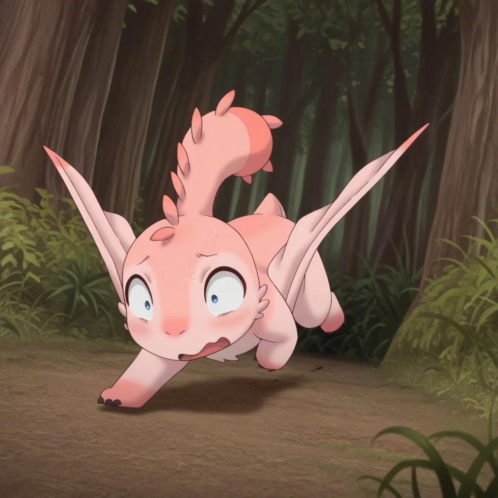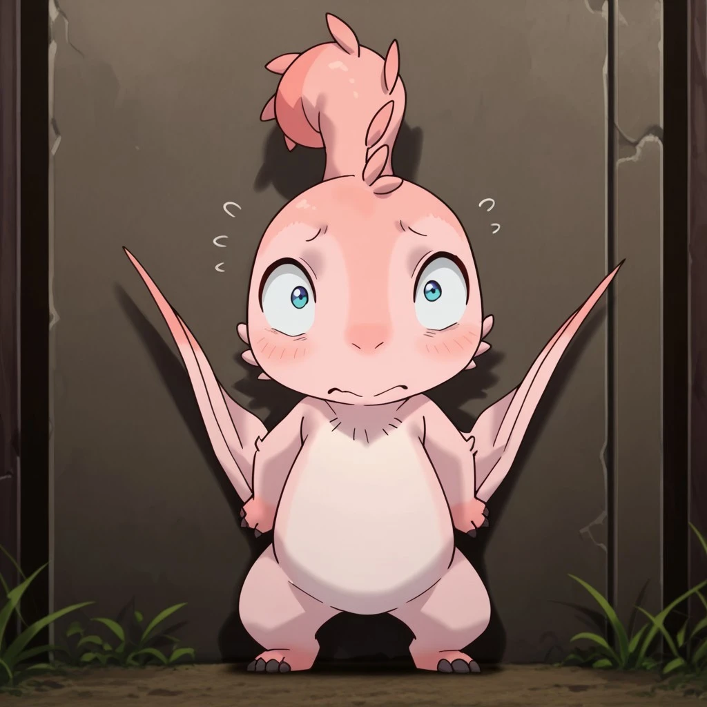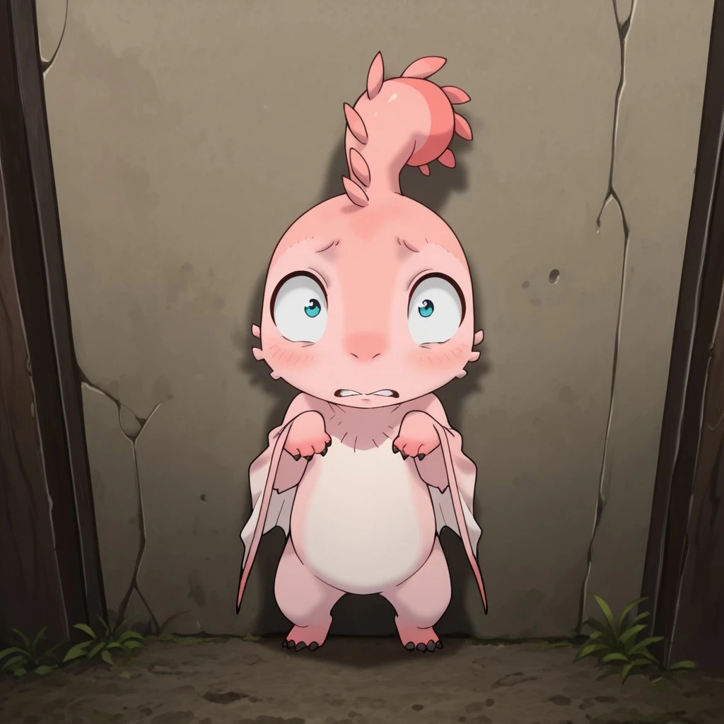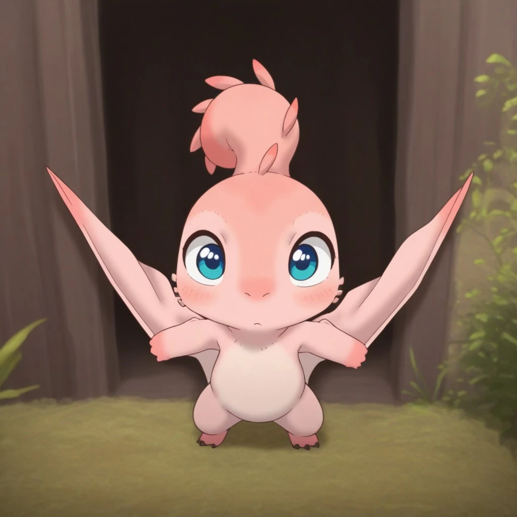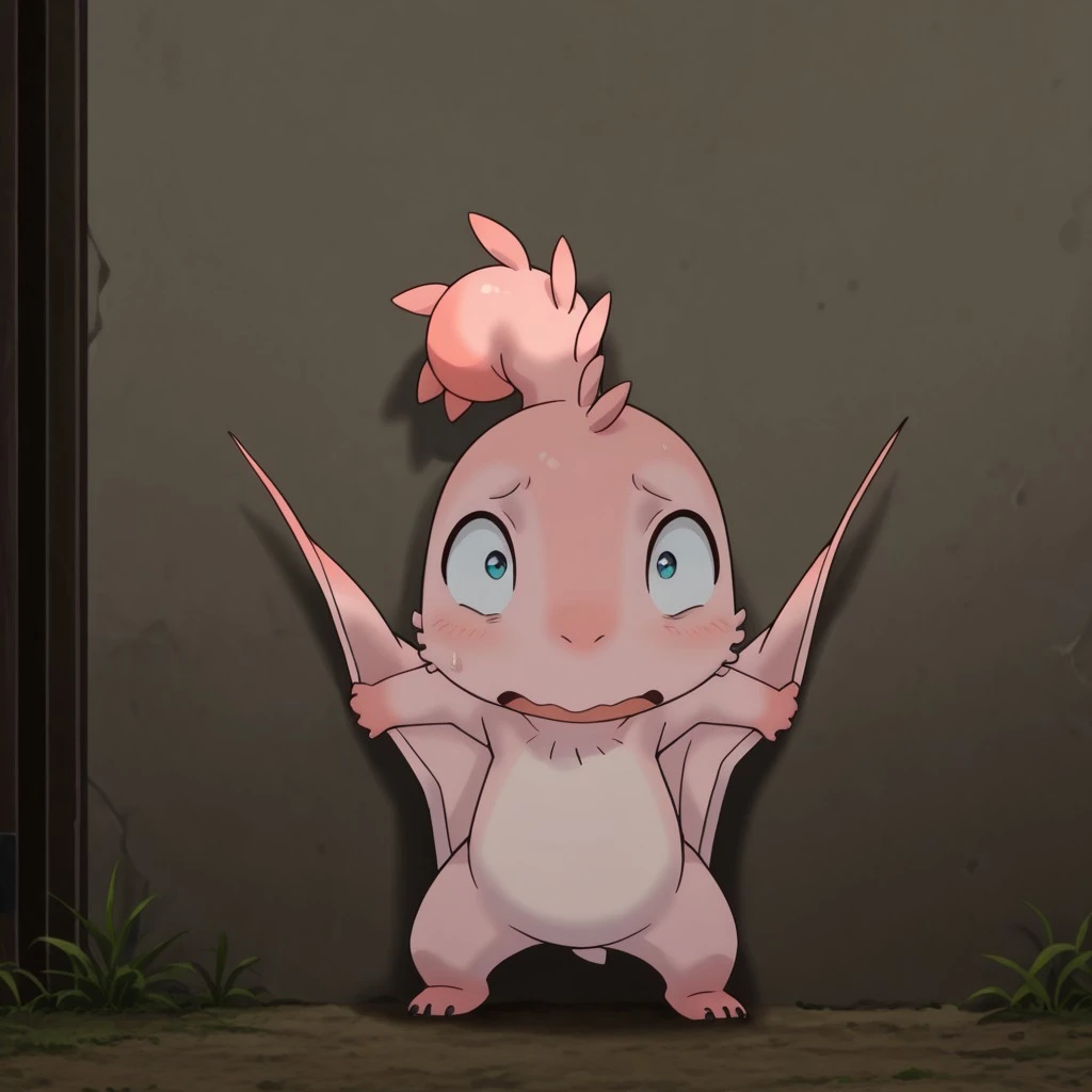 MTPunonil, feral, female, pink skin, wings, winged arms, blue eyes,