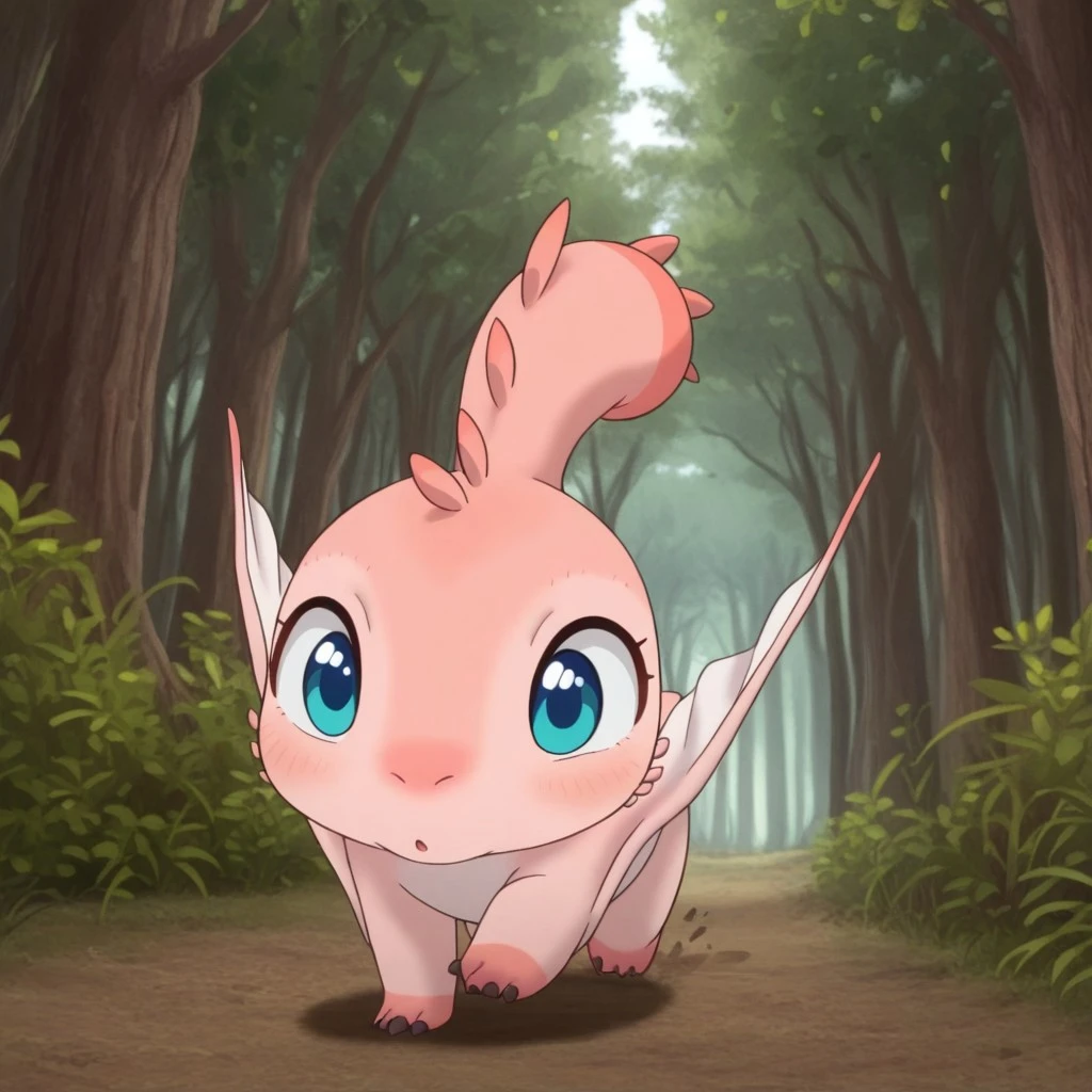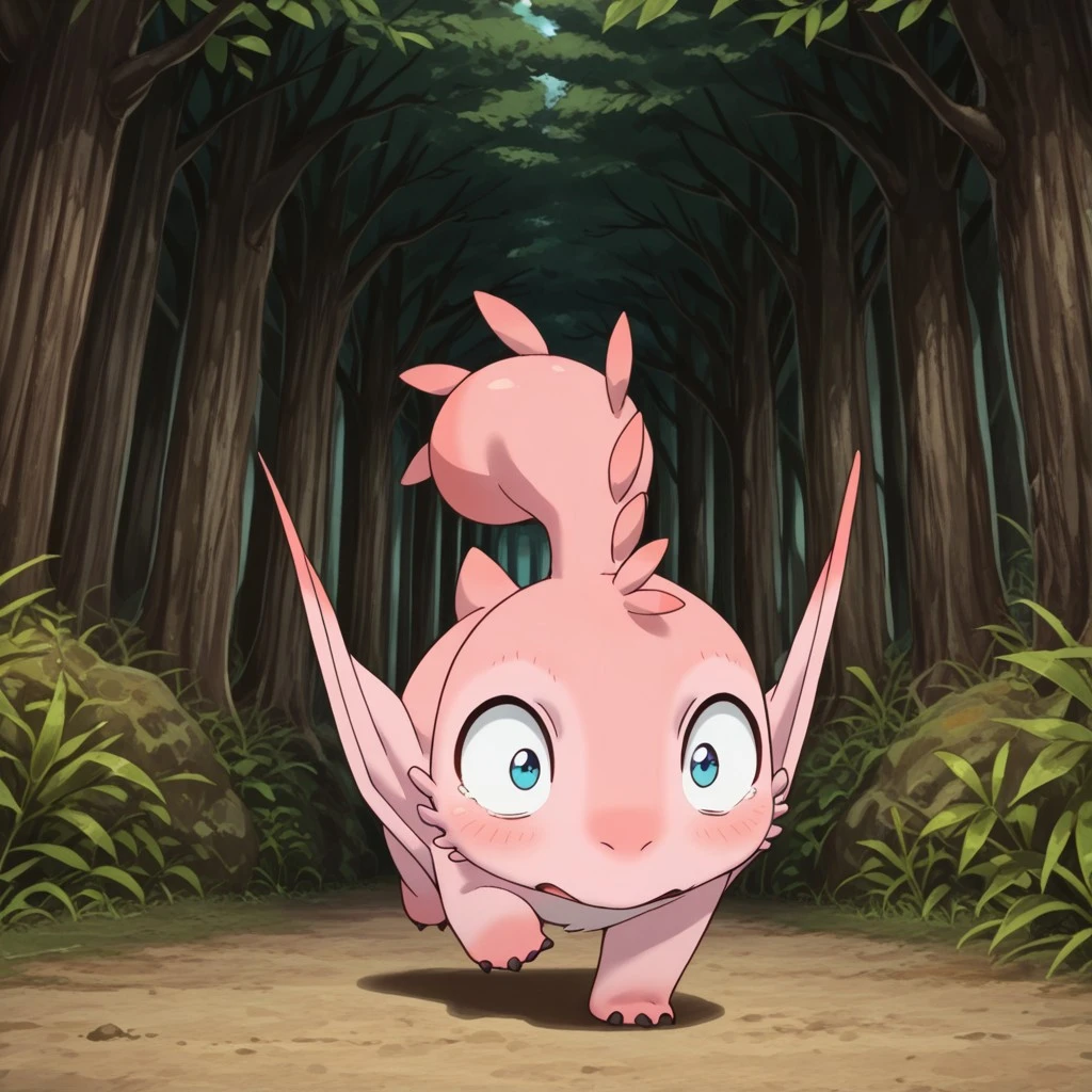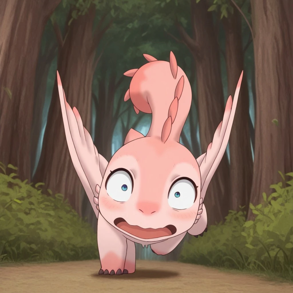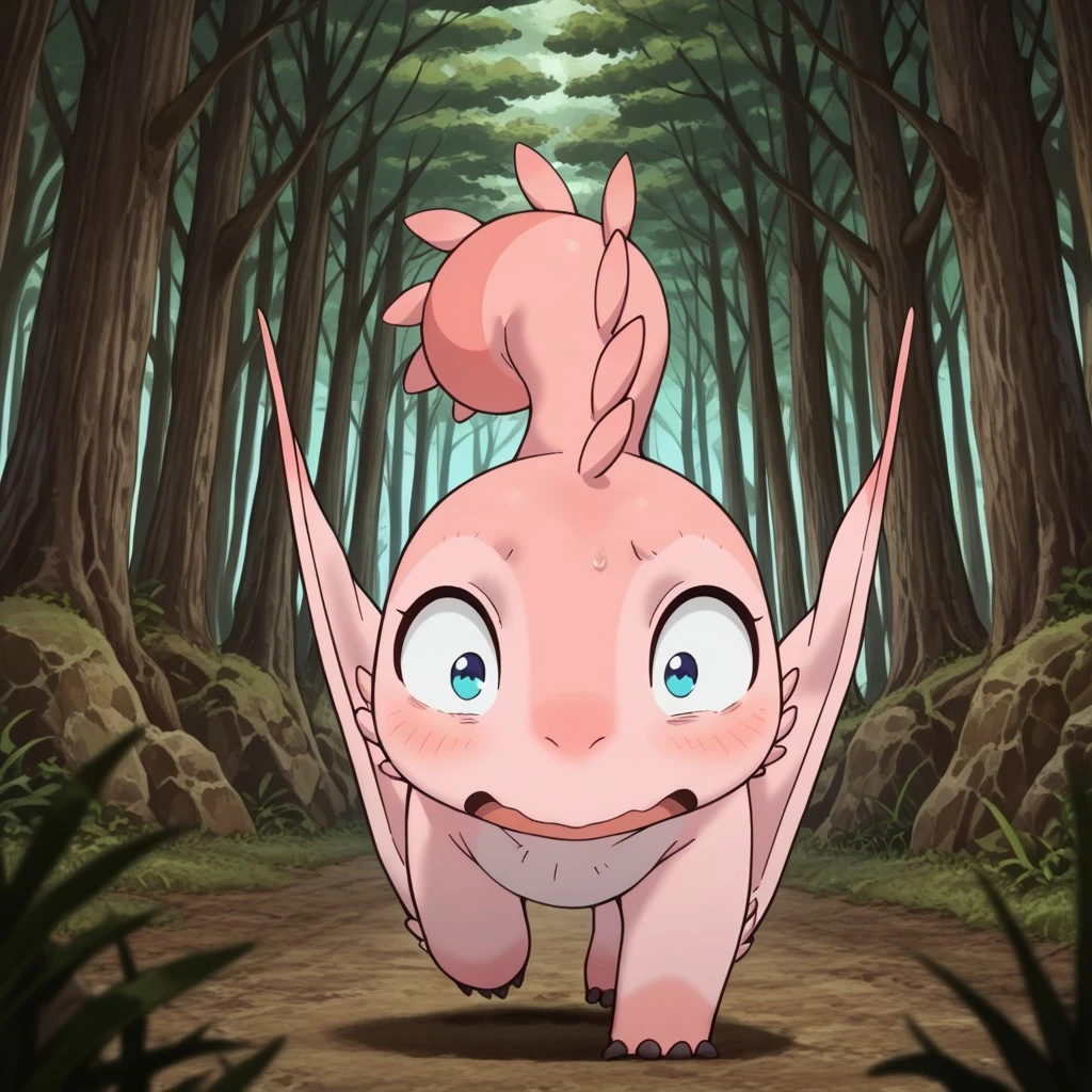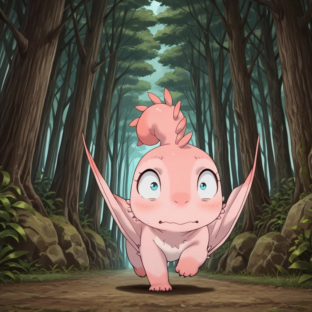 MTPunonil, feral, female, pink skin, wings, winged arms, blue eyes,