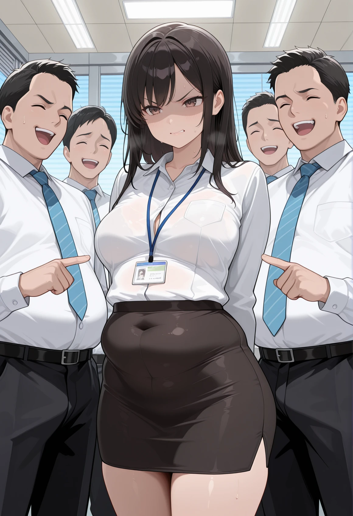 prompts: laa, laughing at another, 1girl, multiple boys, embarrassed, pointing at another, clothed male ???? female, hands behind head