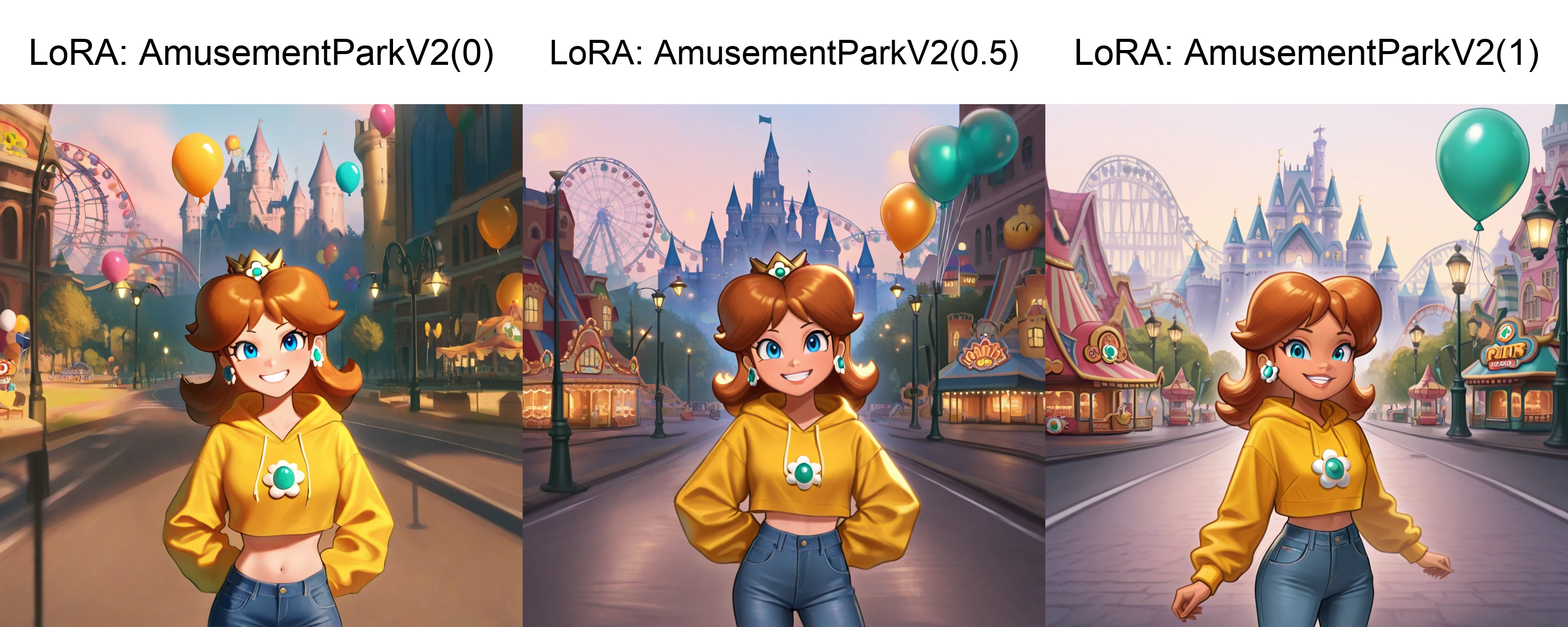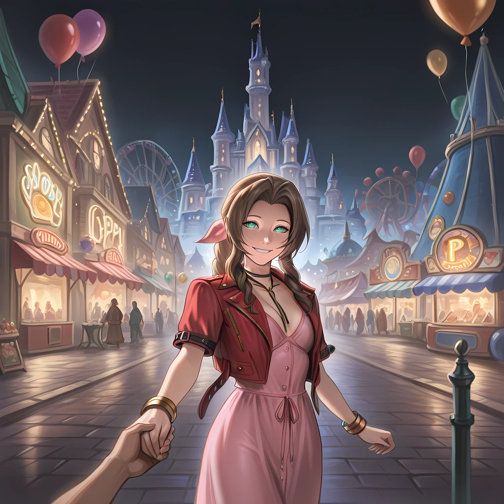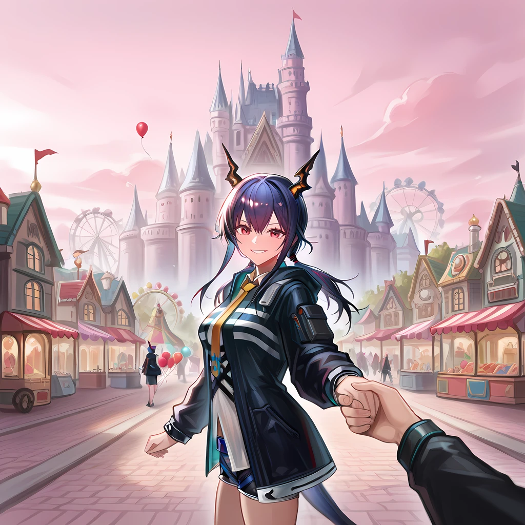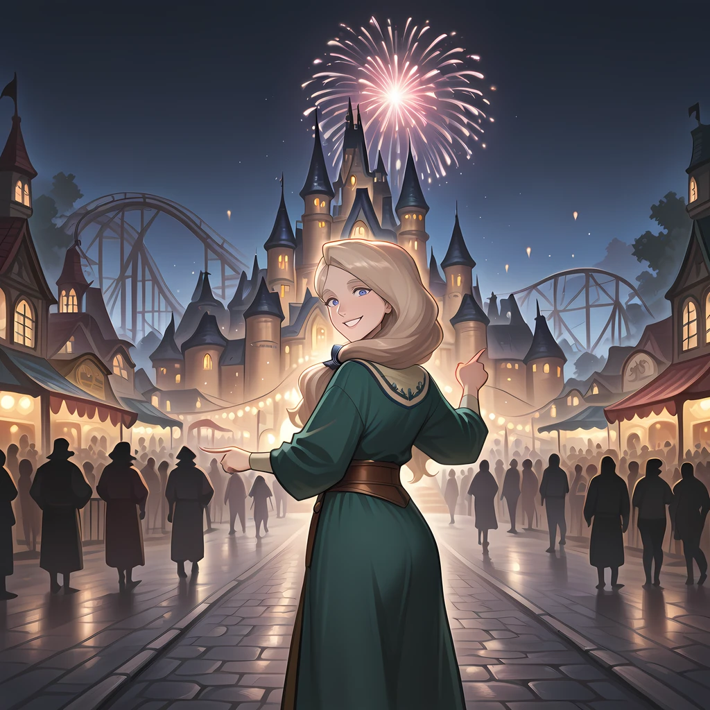 outdoors, amusement park, ferris wheel, smile, carousel, building, lamppost, balloon, castle, roller coaster