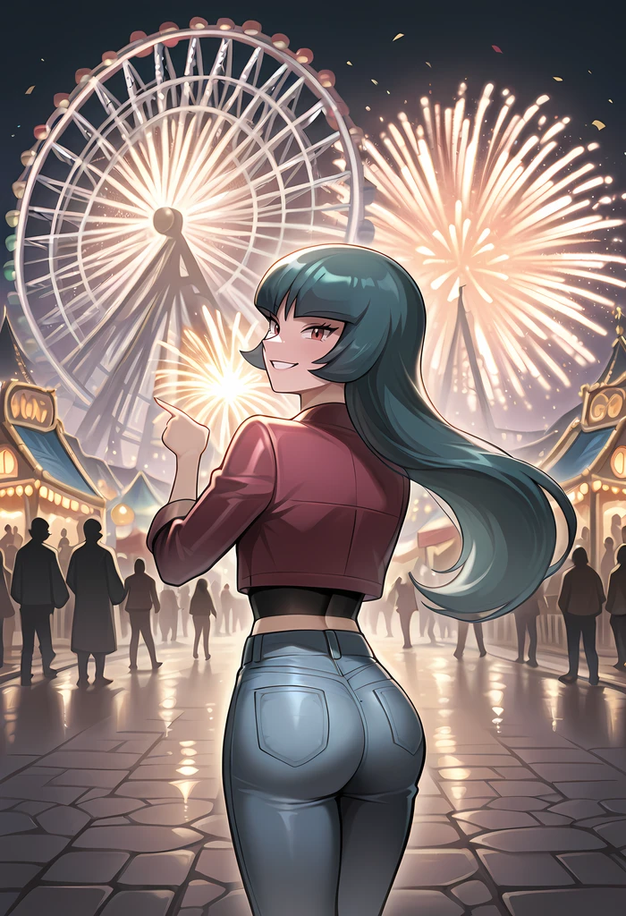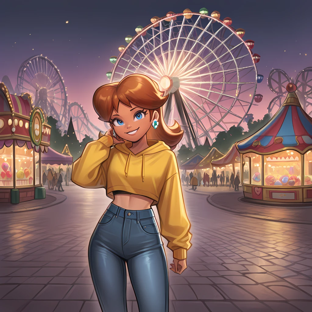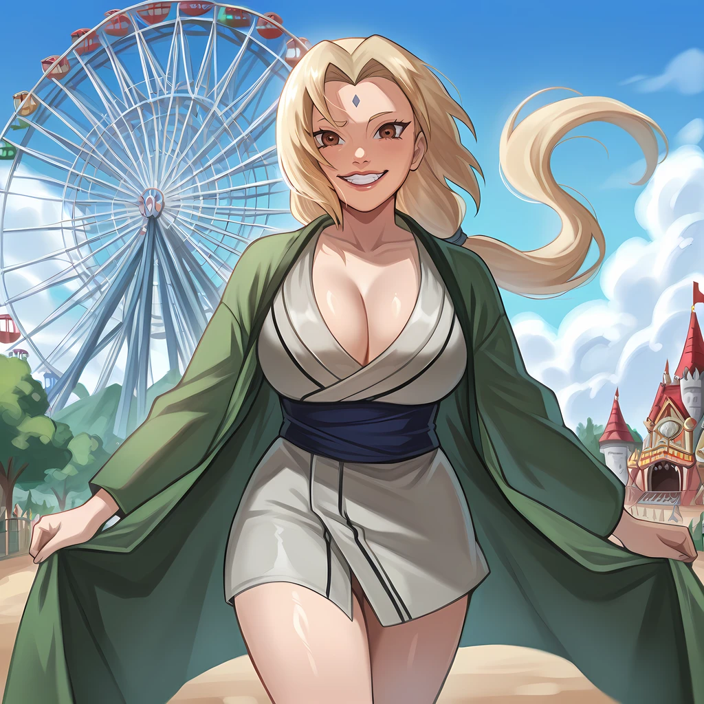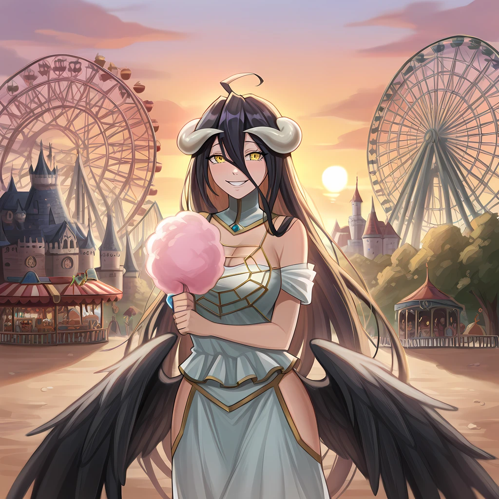 outdoors, amusement park, ferris wheel, smile, carousel, building, lamppost, balloon, castle, roller coaster
