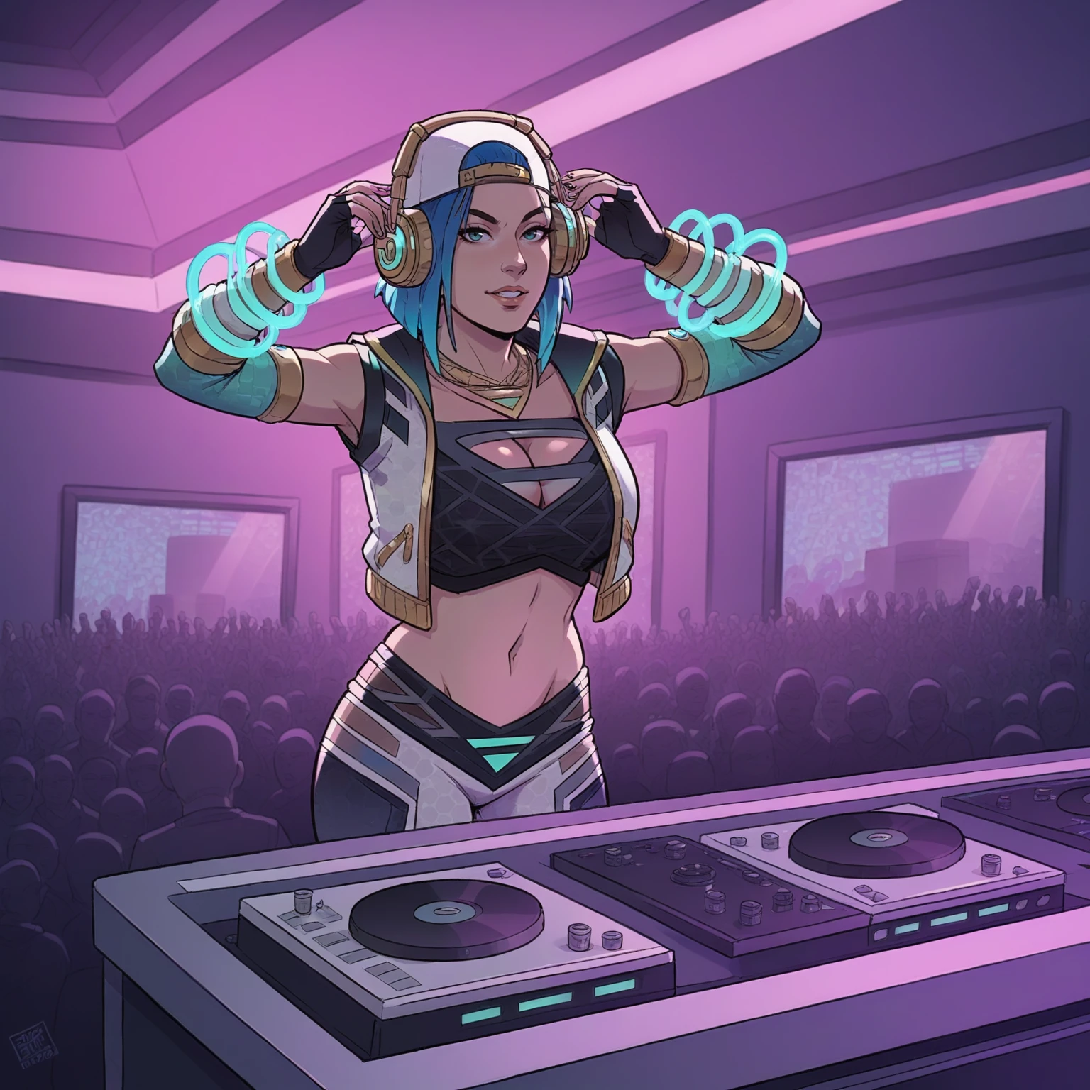 1girl, solo, large breasts, blue hair, medium hair, elbow gloves, midriff, fingerless gloves, necklace, bracelet, crop top, headphones, baseball cap, cropped vest, backwards hat,