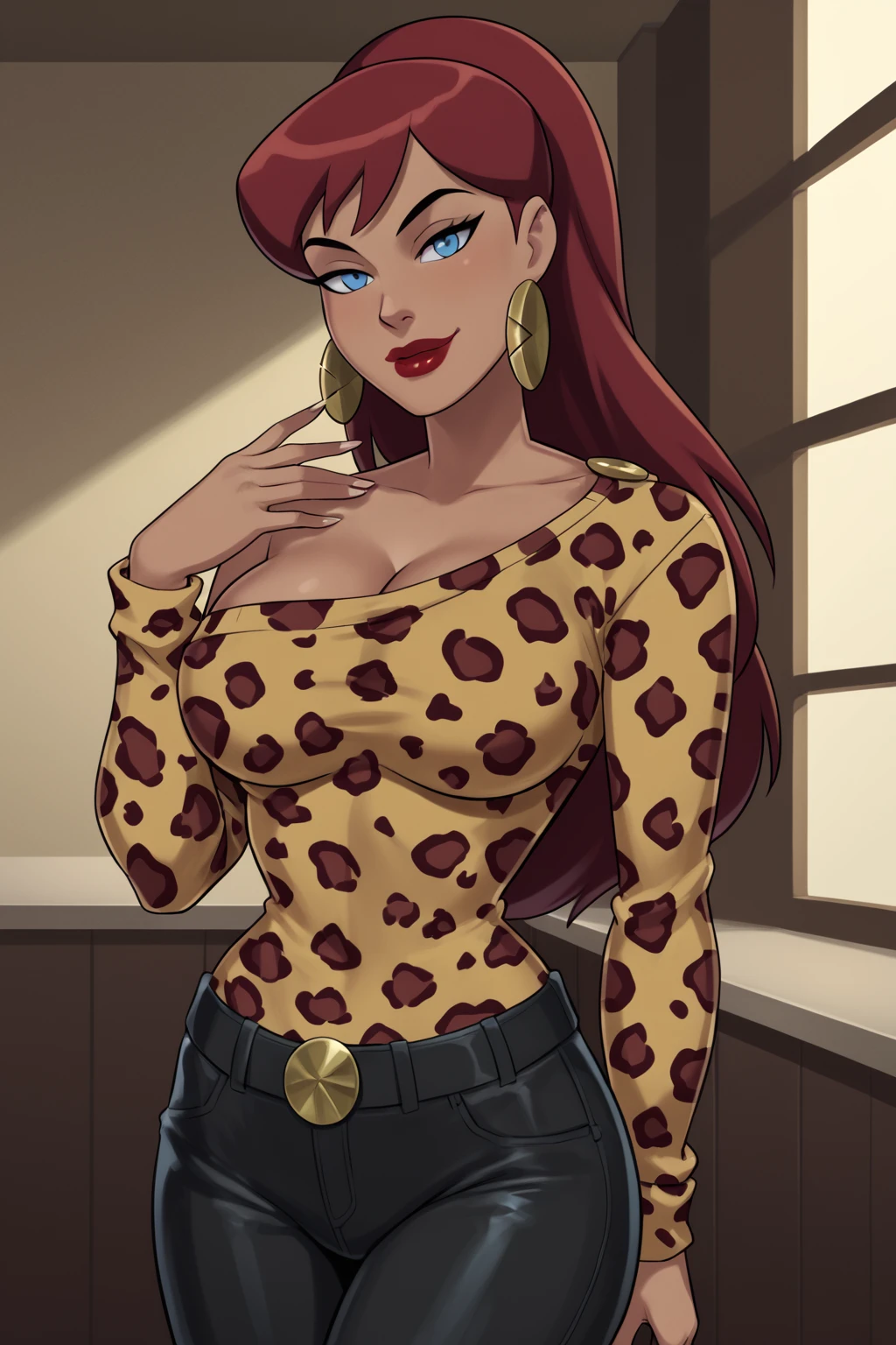 Casual: jewelry, earrings, strapless, off-shoulder, cleavage, leopard print, sweater, long sleeves, leather pants, black pants
