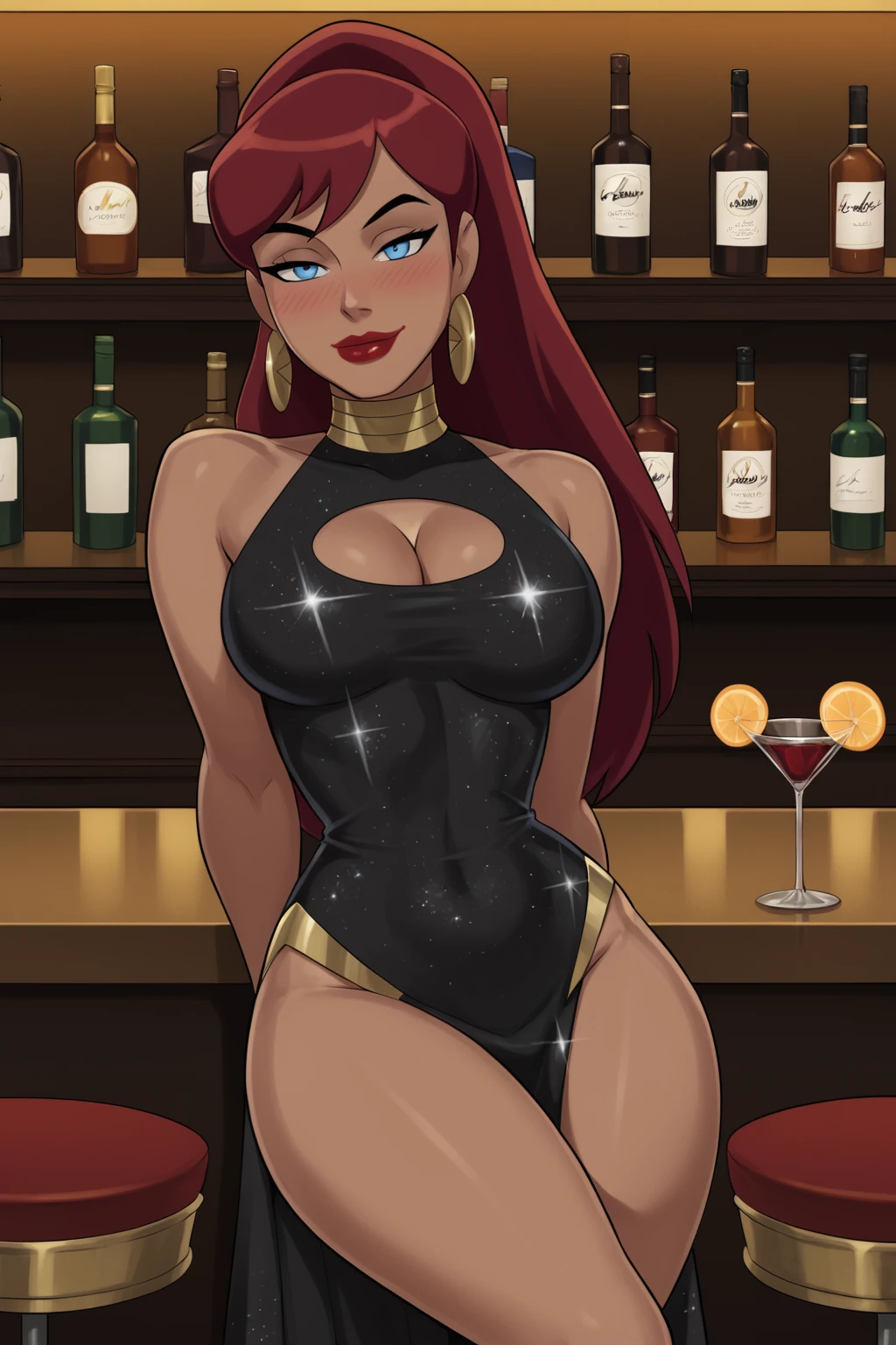 Base Prompt: doris zeul, dark-skinned female, long hair, red hair, blue eyes, makeup, lipstick, red lips