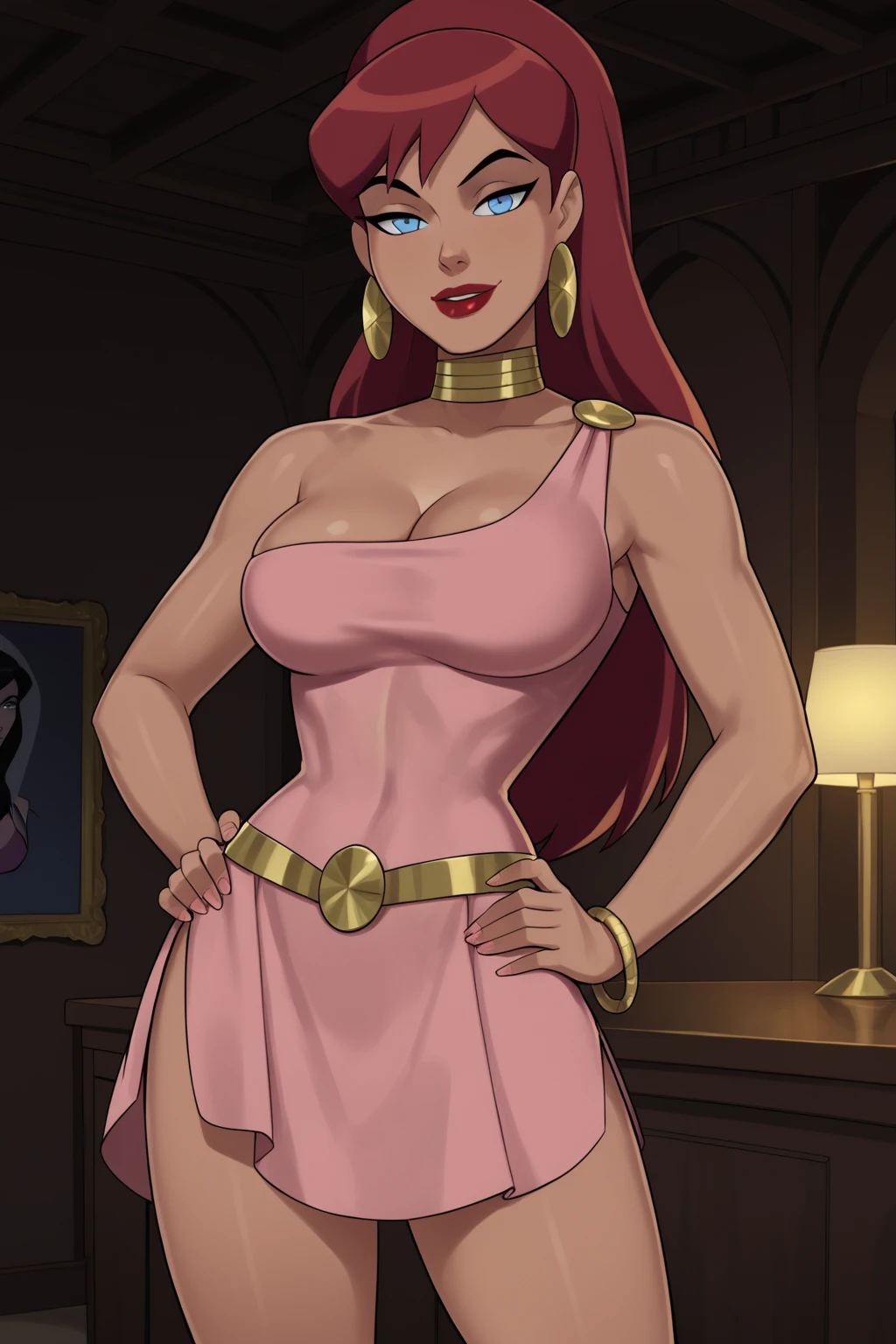 Costume: jewelry, neck ring, earrings, cleavage, pink dress, bracelet, belt, high heels