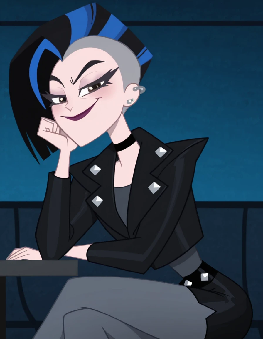 • lesliewillis, mohawk, streaked hair, blue hair, black hair, brown eyes, long eyelashes, lipstick, black choker, ear piercing, black jacket, studded jacket, long lseeves, gray undershirt, black miniskirt, light gray leggings, black boots