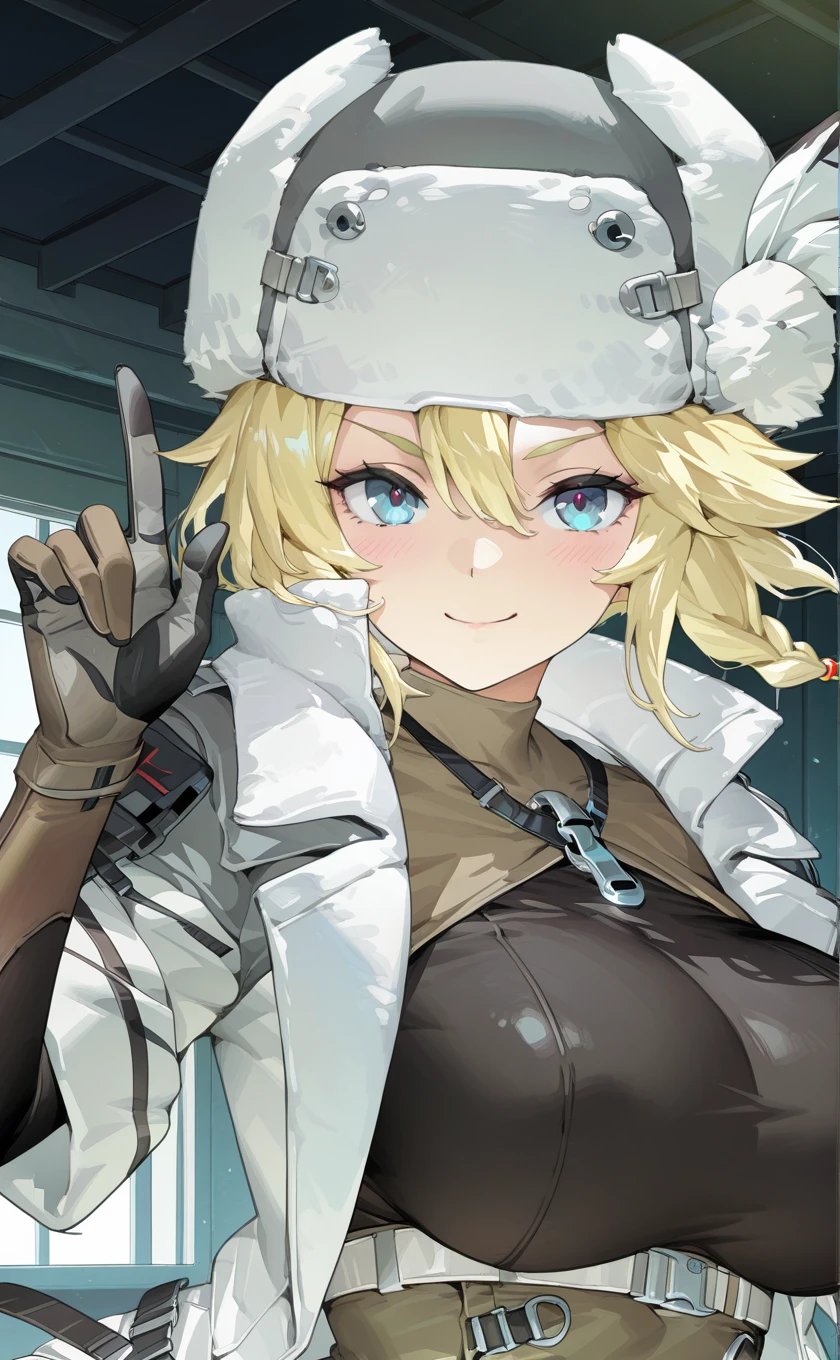 ushanka,fur hat,medium hair,blonde hair,single braid,hair between eyes,blue eyes