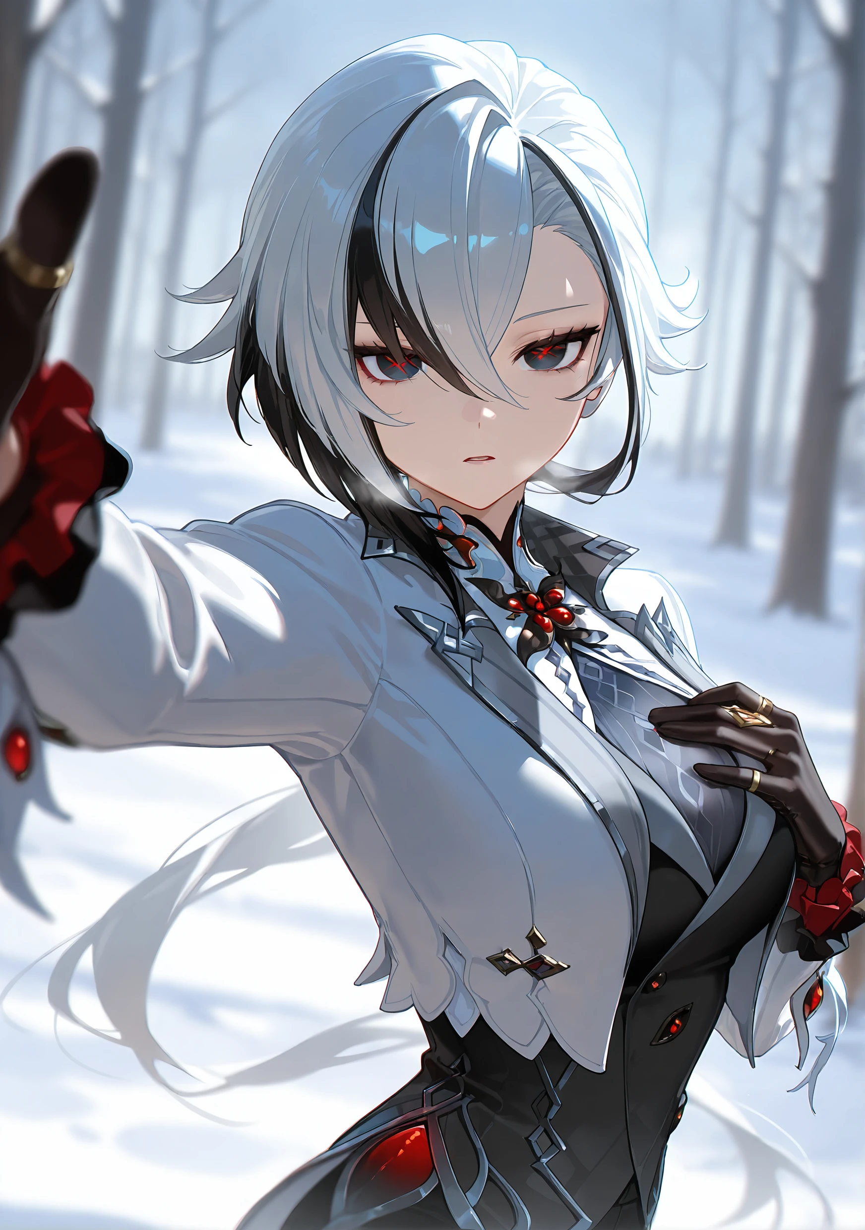 Tags for her outfit: long sleeves, black gloves, coat, black pants, white jacket, formal, suit, black vest, grey jacket, open jacket,
