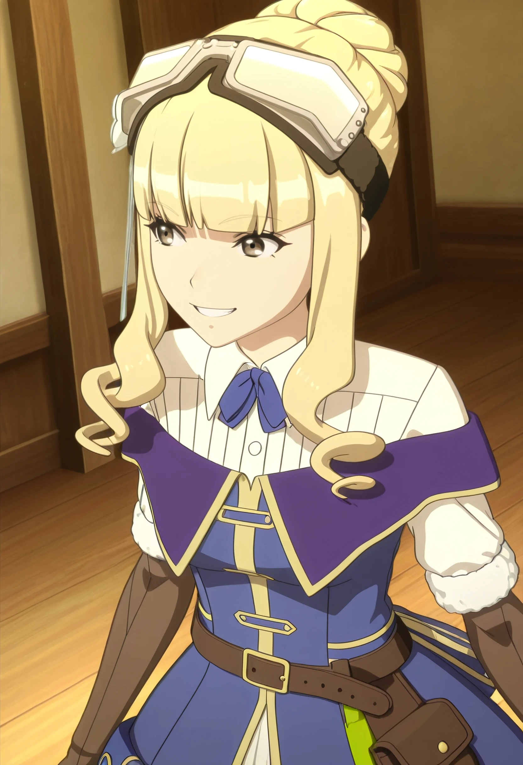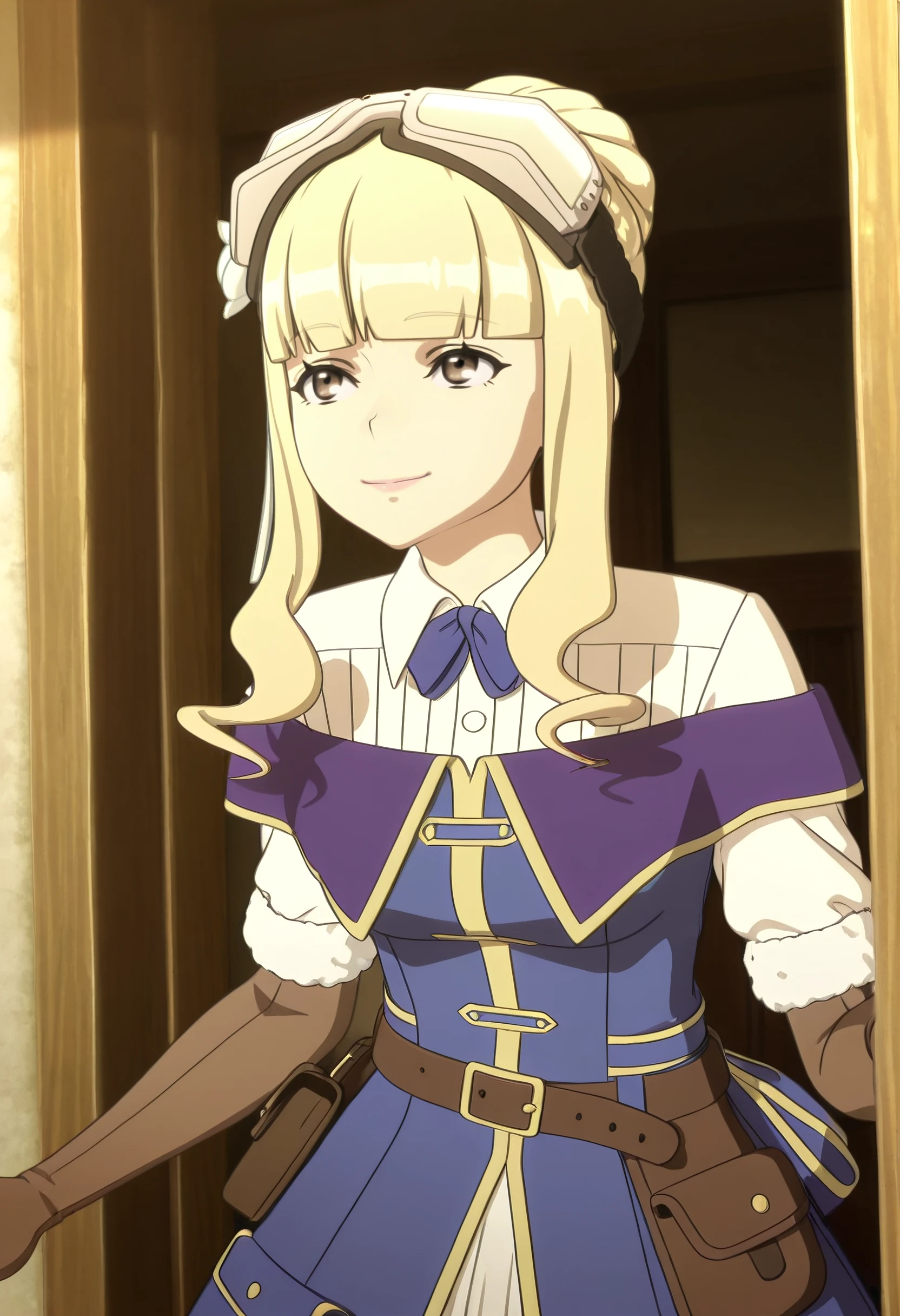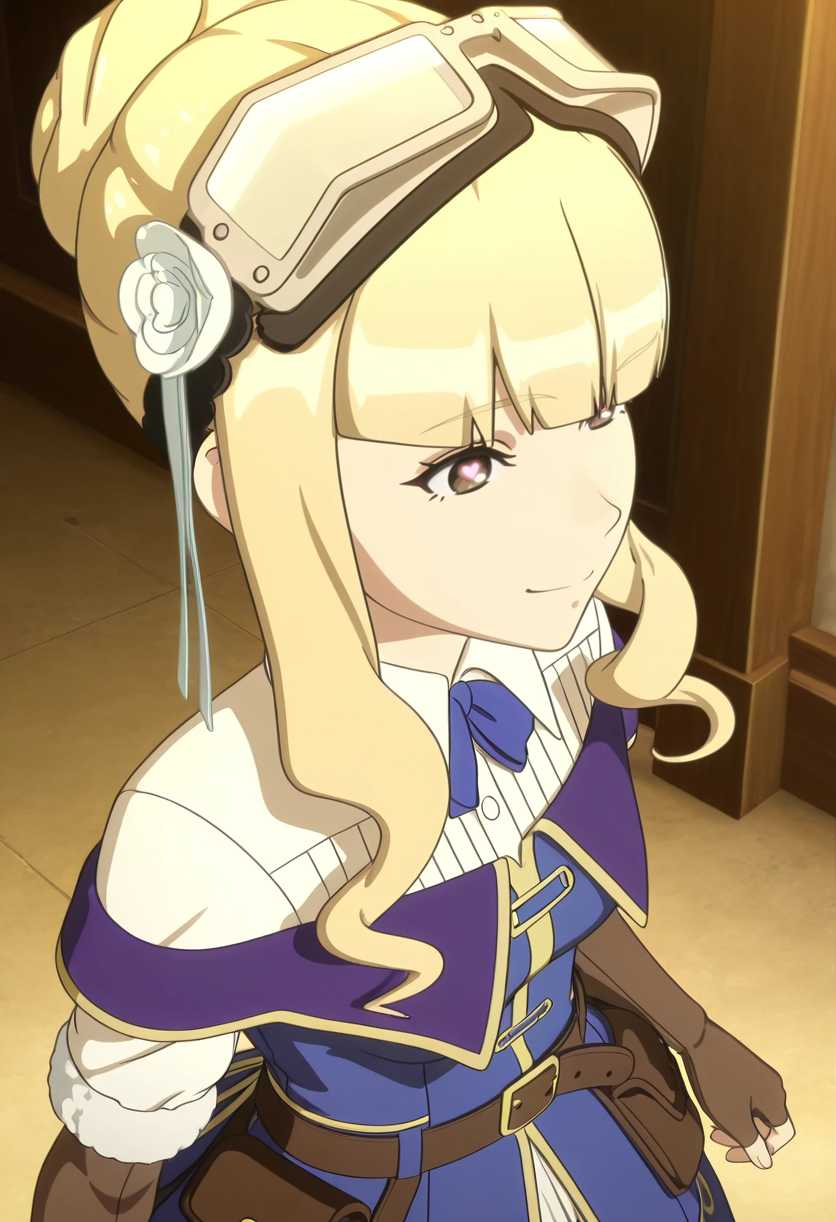 EmmaOutfit, white shirt, belt, elbow gloves, bow, collared shirt, fingerless gloves, fur trim, brown gloves, rose, pouch, bowtie, brown belt, white rose, belt pouch, blue dress, blue bowtie, goggles, goggles on head, hair ornament, hair flower, white flower,
