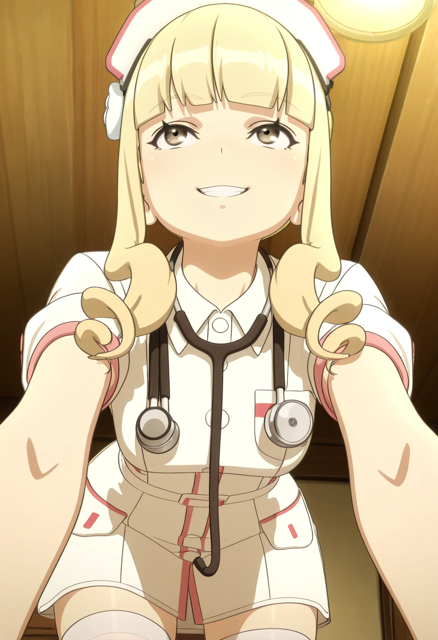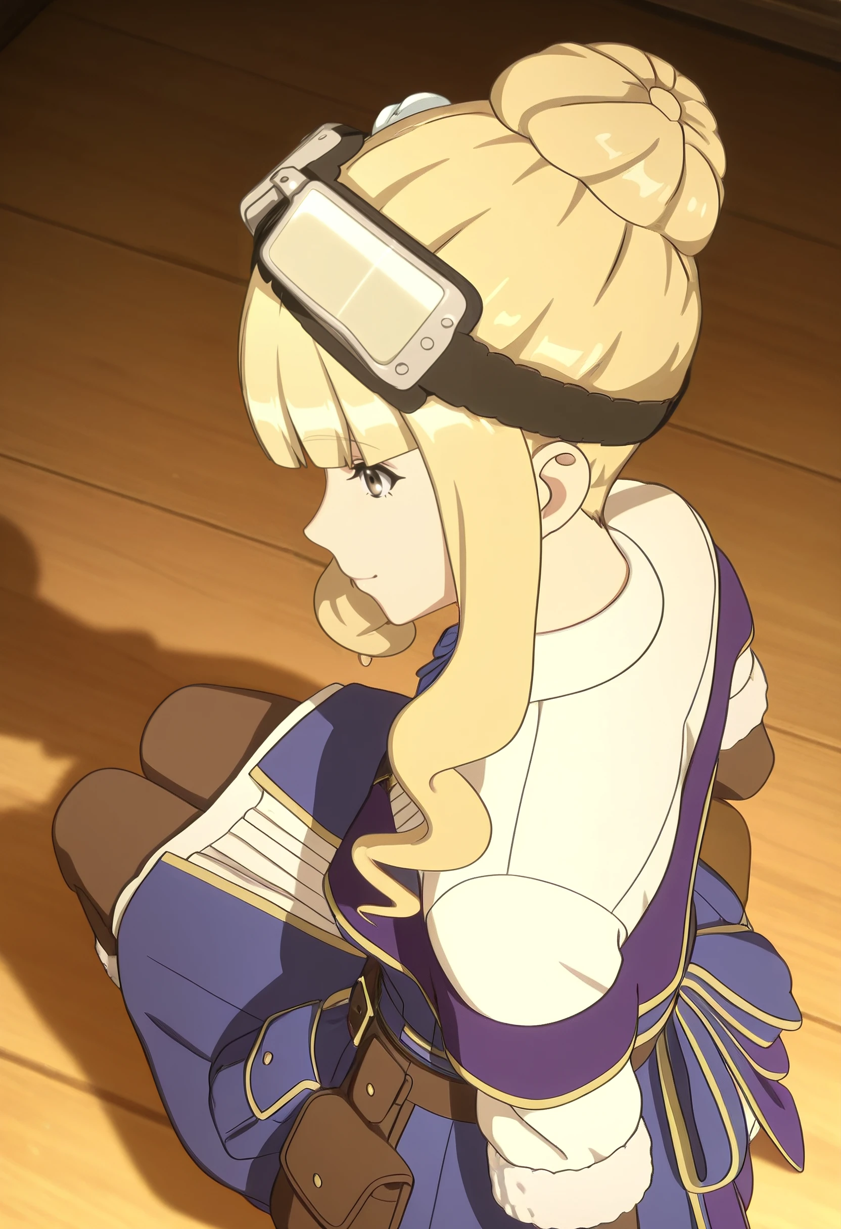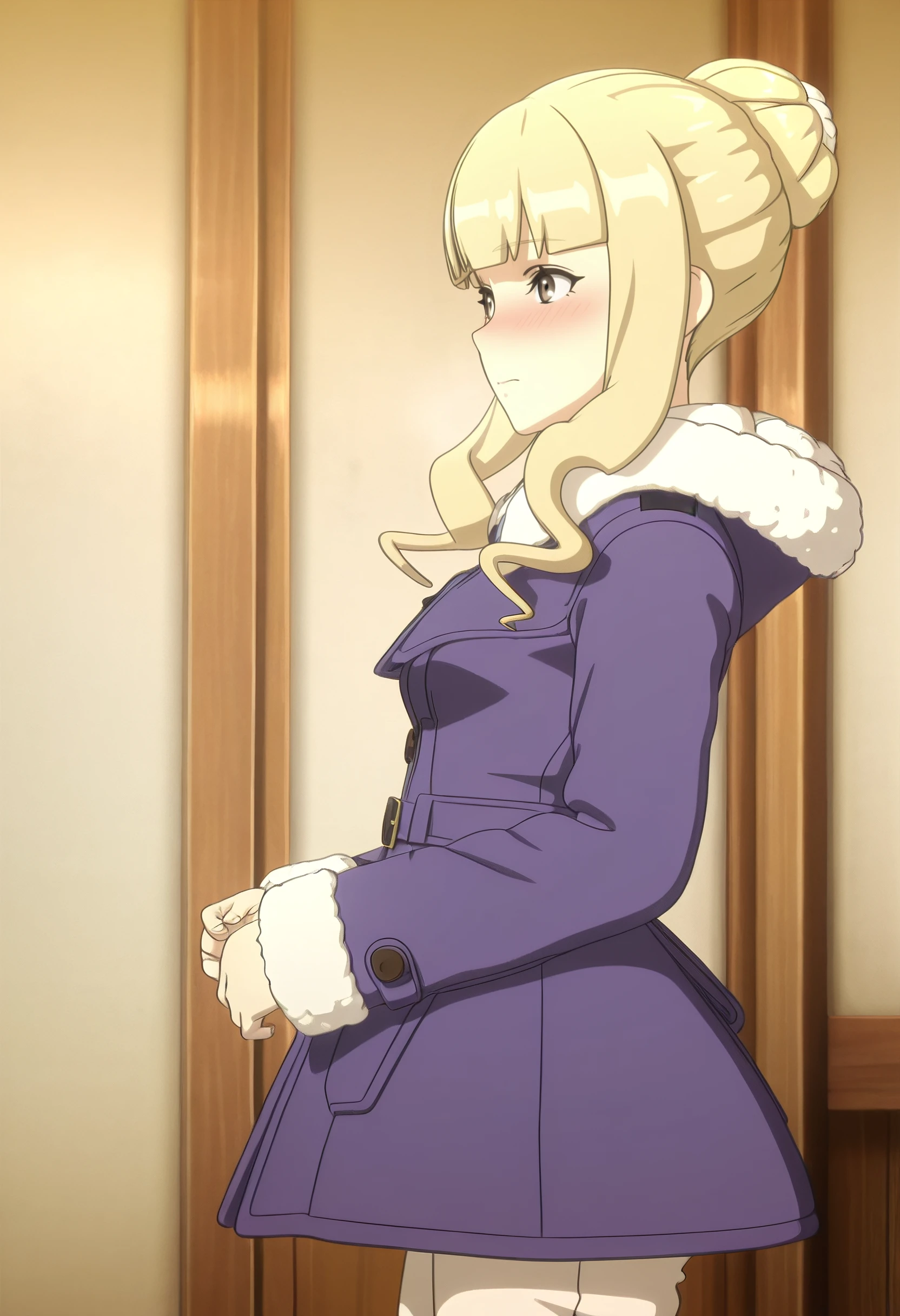 KNKEmma, blonde hair, long hair, blunt bangs, brown eyes, sidelocks, hair bun, single hair bun, drill hair,